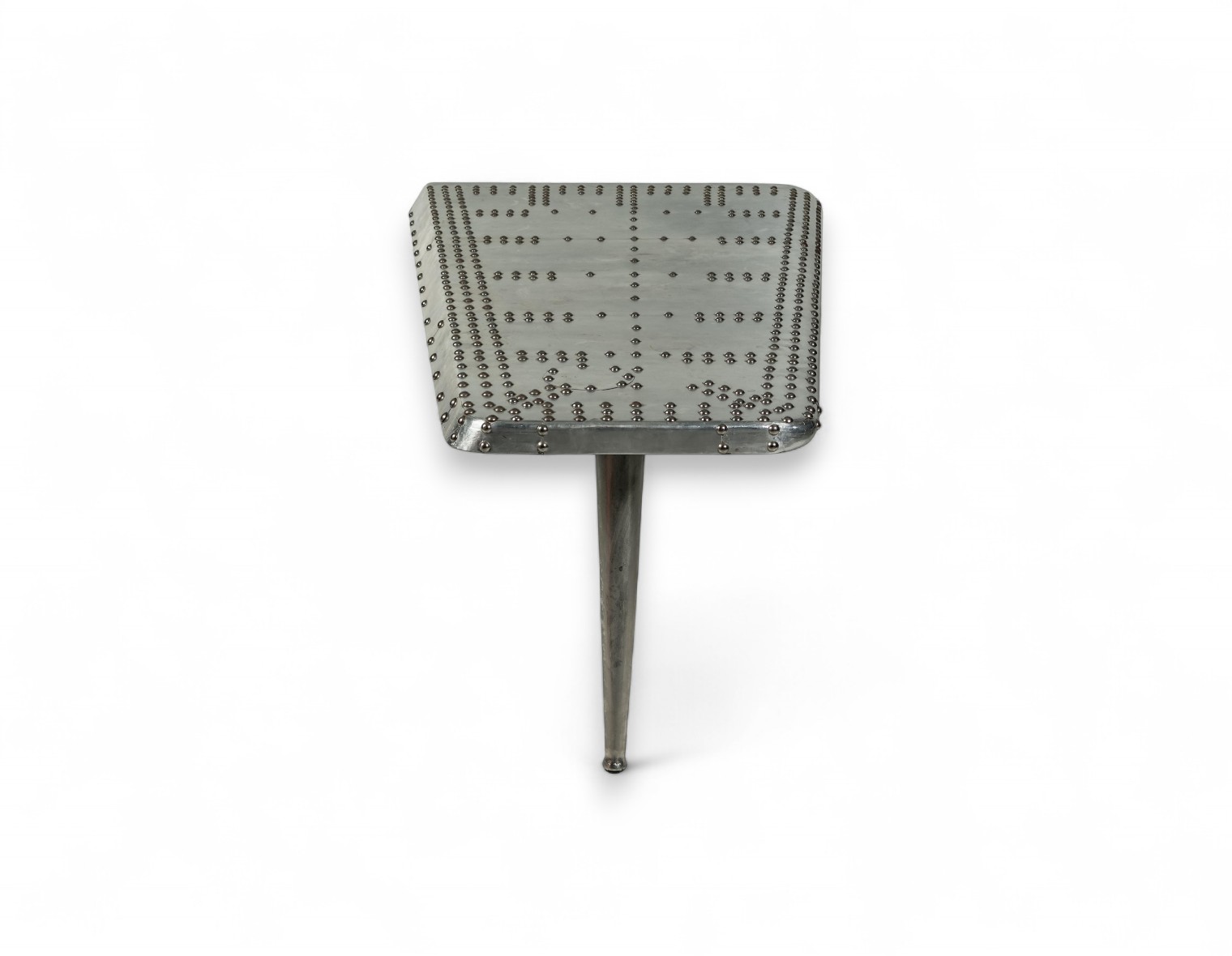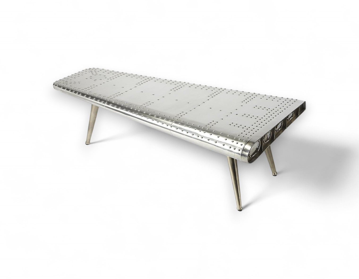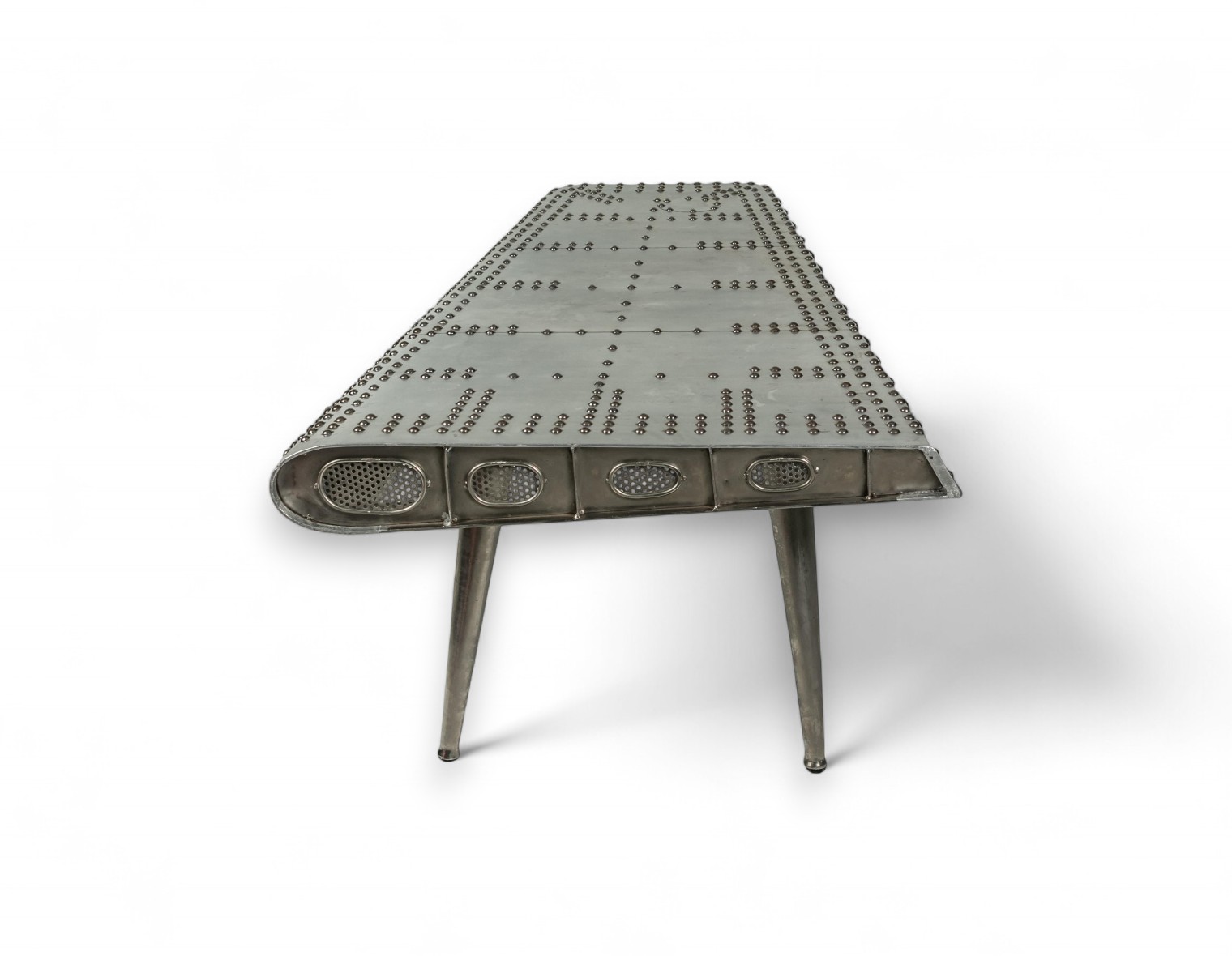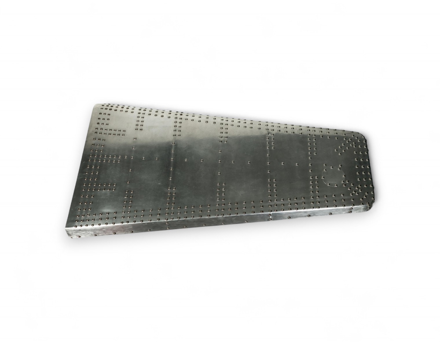 The Airplane Wing Coffee Table is a bold statement piece inspired by vintage aircraft engineering. Expertly crafted with riveted aluminium panels and aerodynamic contours, it captures the essence of aviation design while serving as a highly functional centrepiece for modern interiors. The sleek metallic surface, detailed rivet work, and wing-shaped form create a striking industrial look, ideal for contemporary living rooms, offices, or lounges.