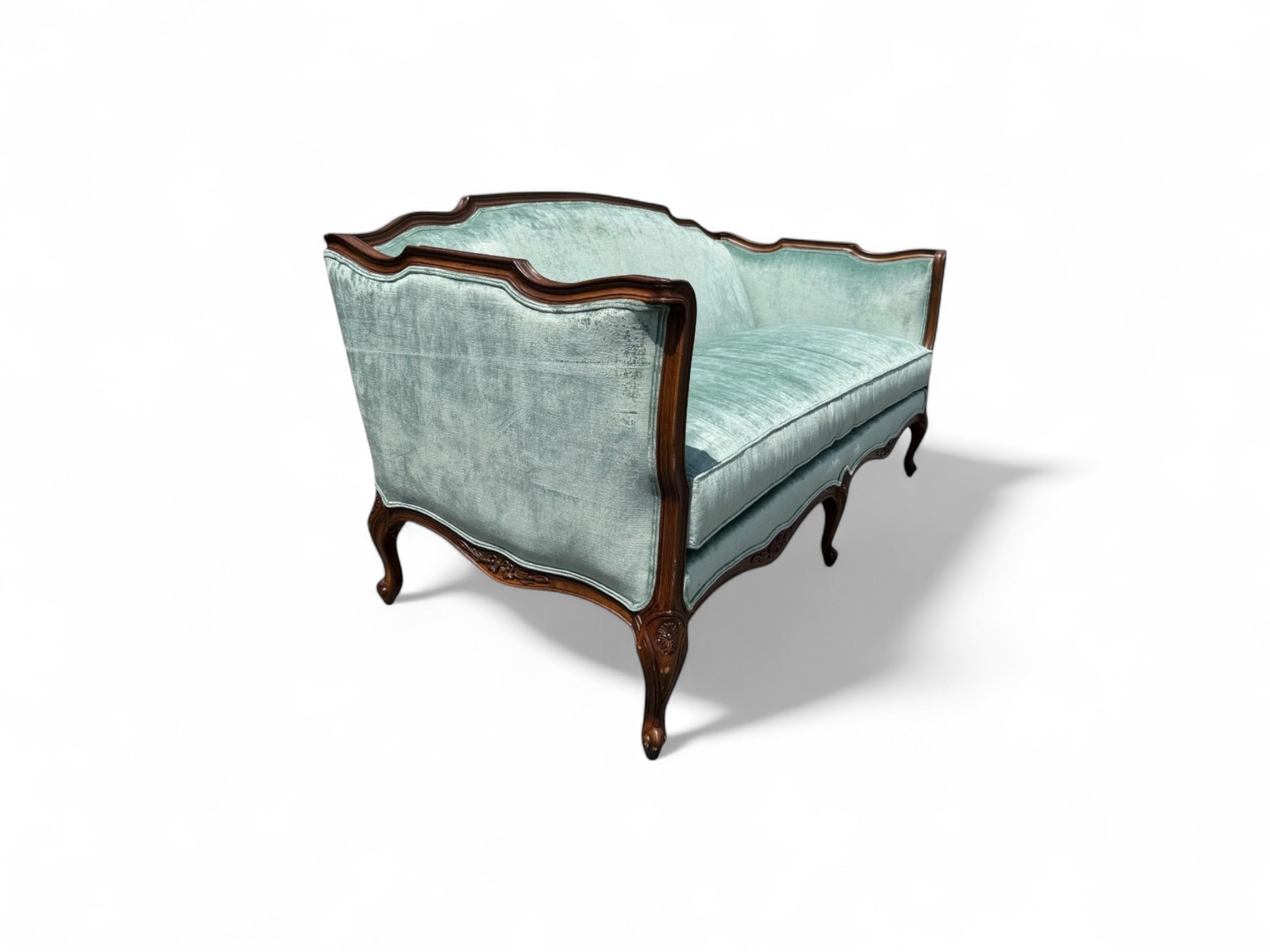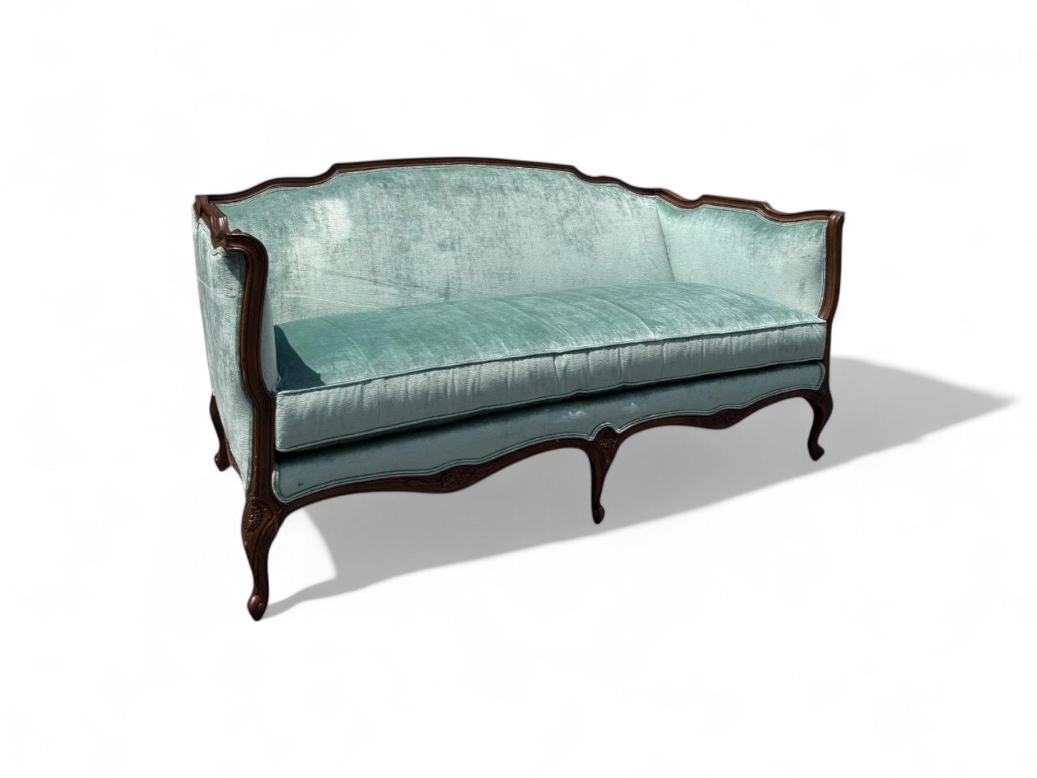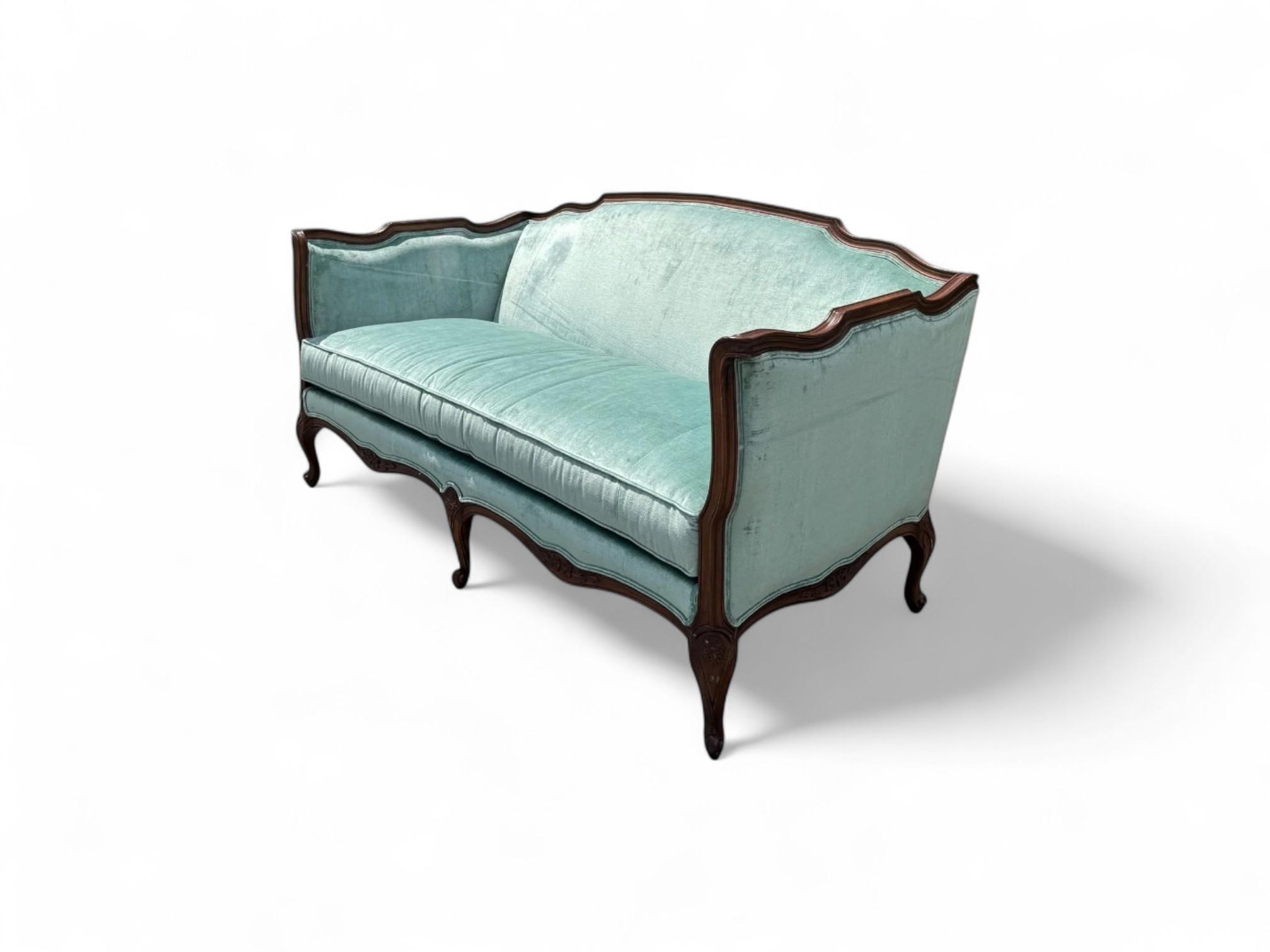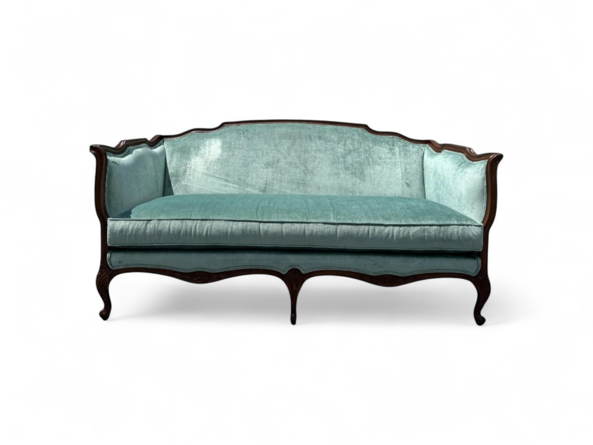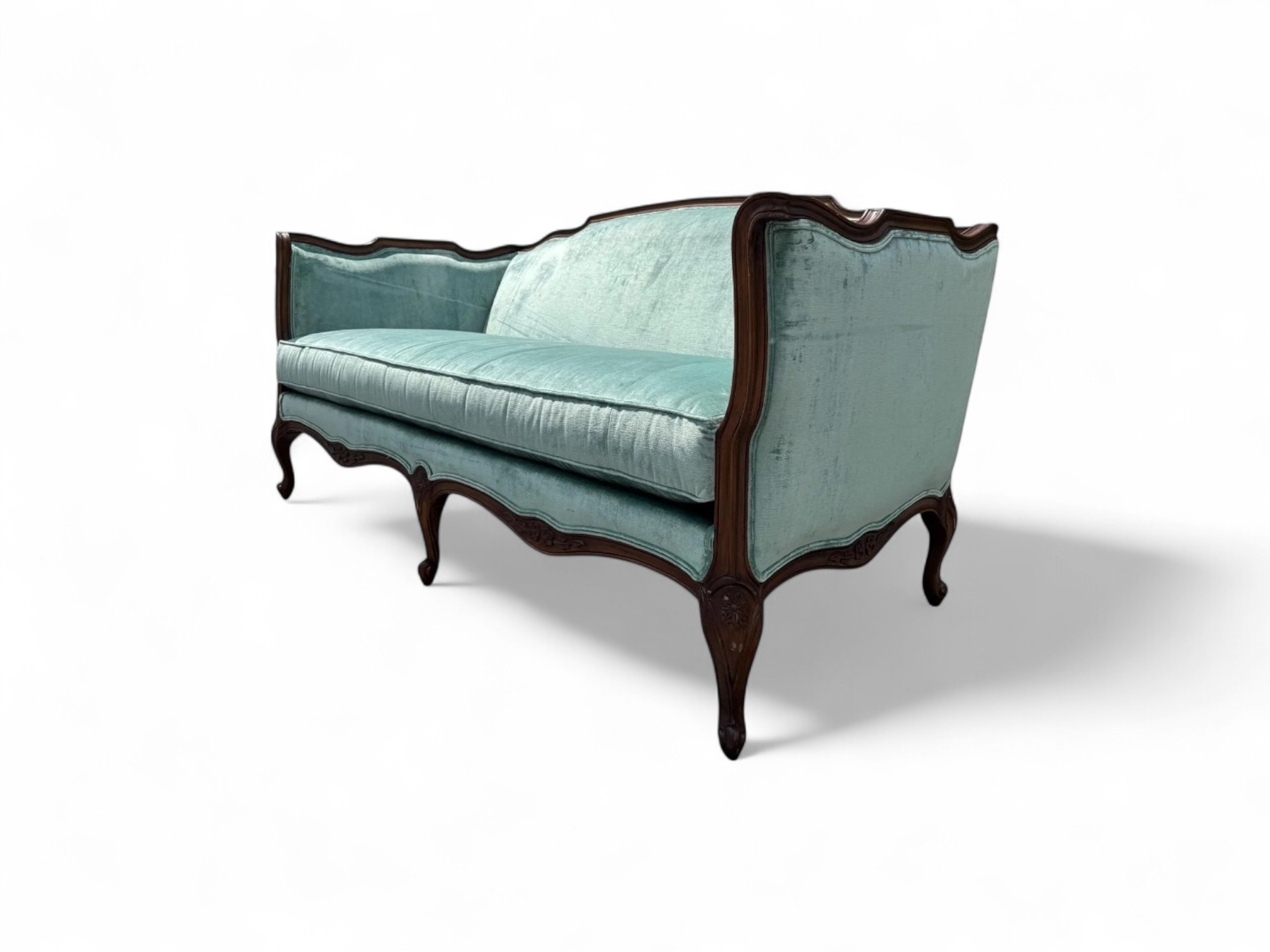 The Aqua Elegance French Sofa is a refined blend of soft sophistication and classic French craftsmanship. Featuring a hand-carved dark wood frame with gentle curves and floral detailing, this piece channels the timeless beauty of Louis XV-inspired design. The soothing aqua velvet upholstery adds a refreshing yet luxurious touch, offering a perfect balance between vintage charm and modern elegance.