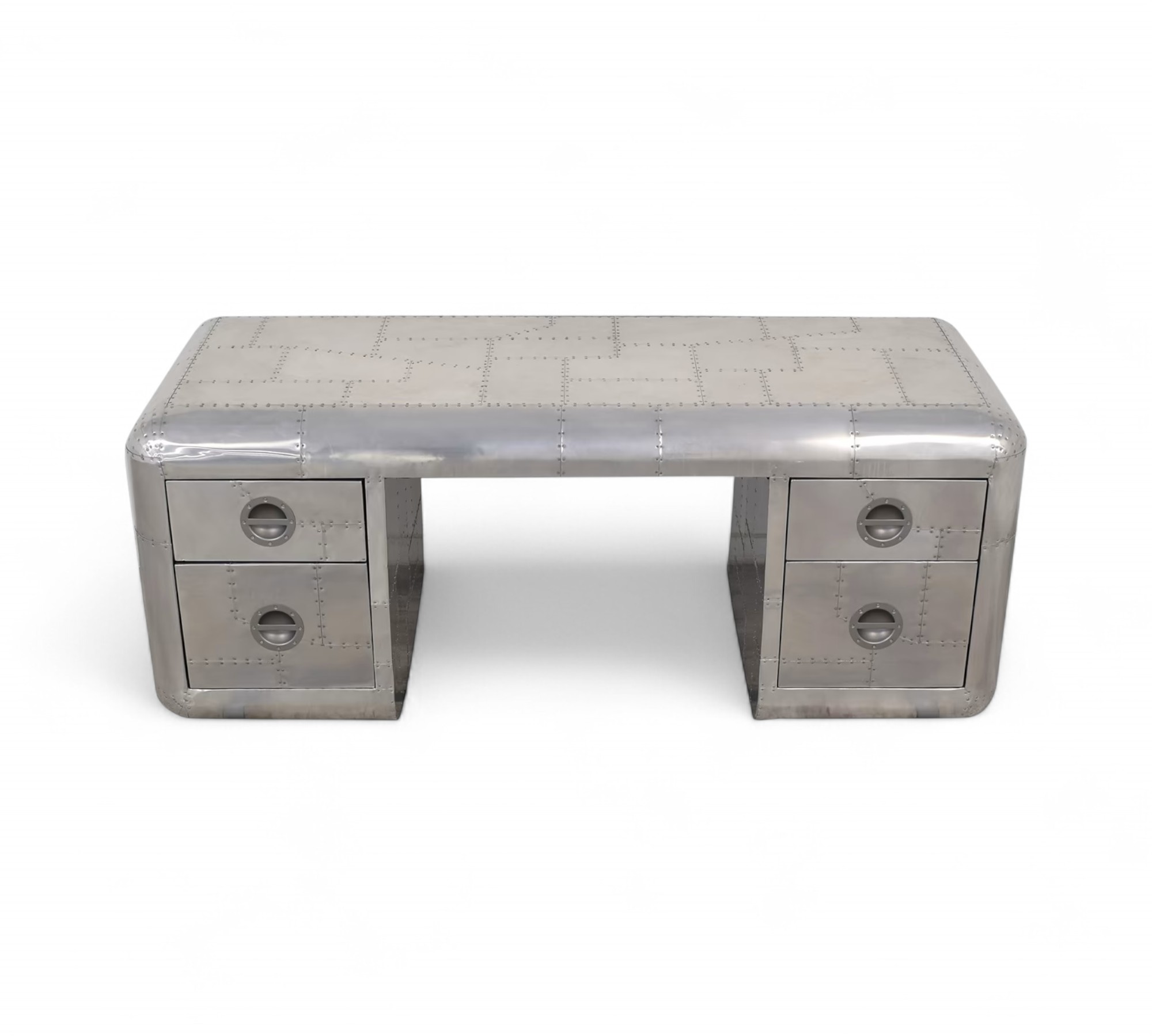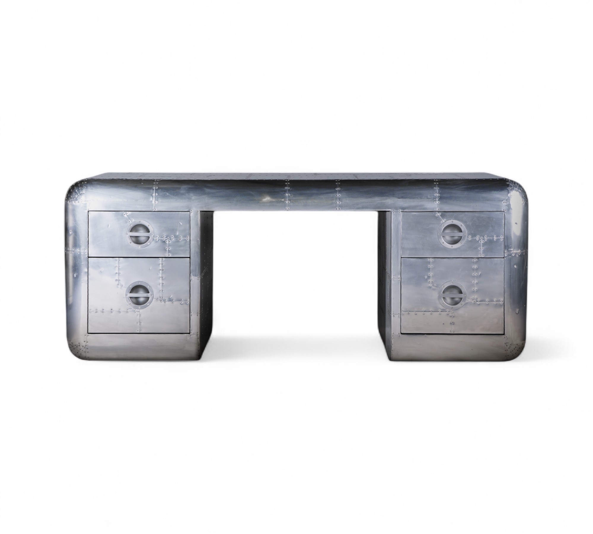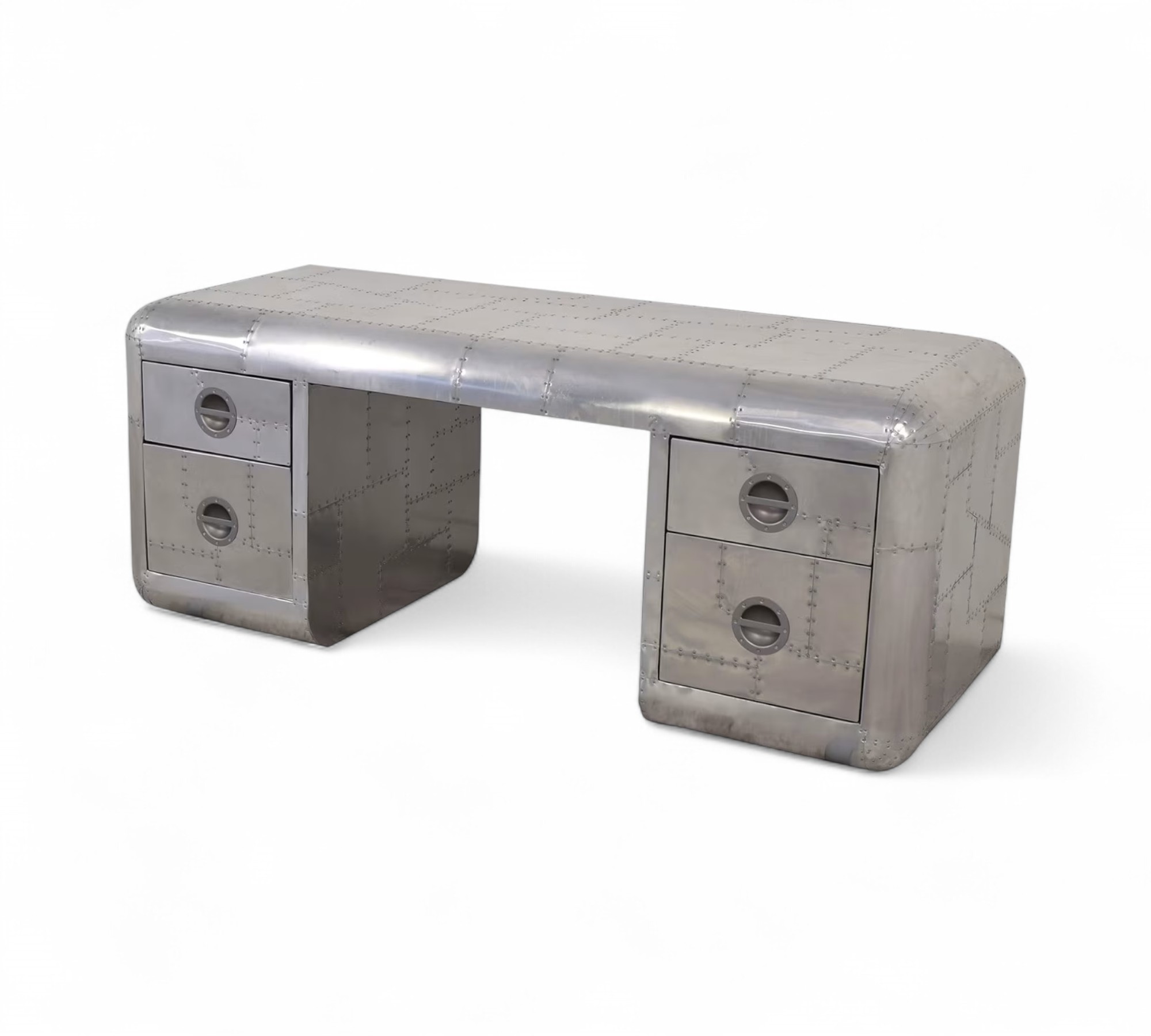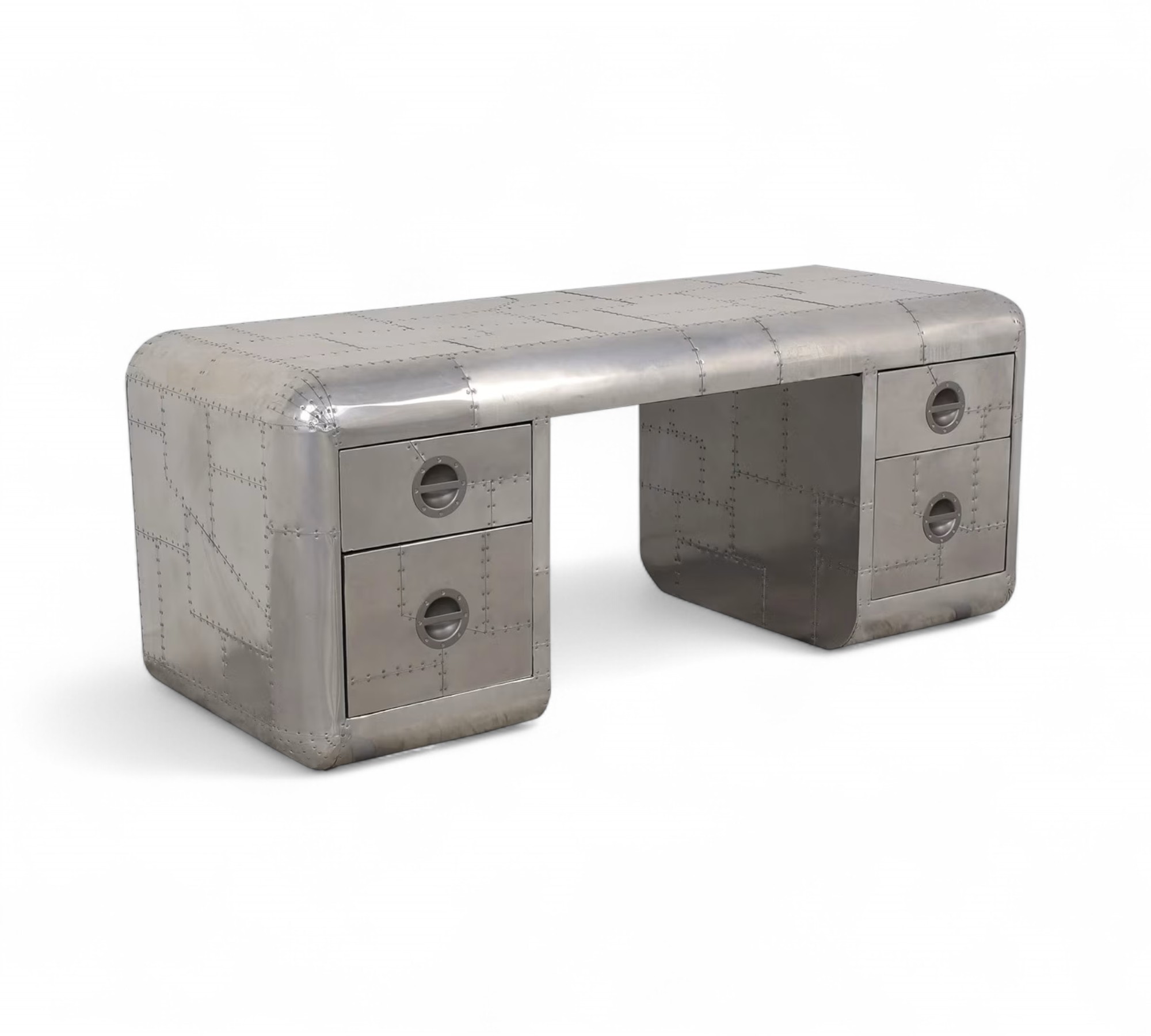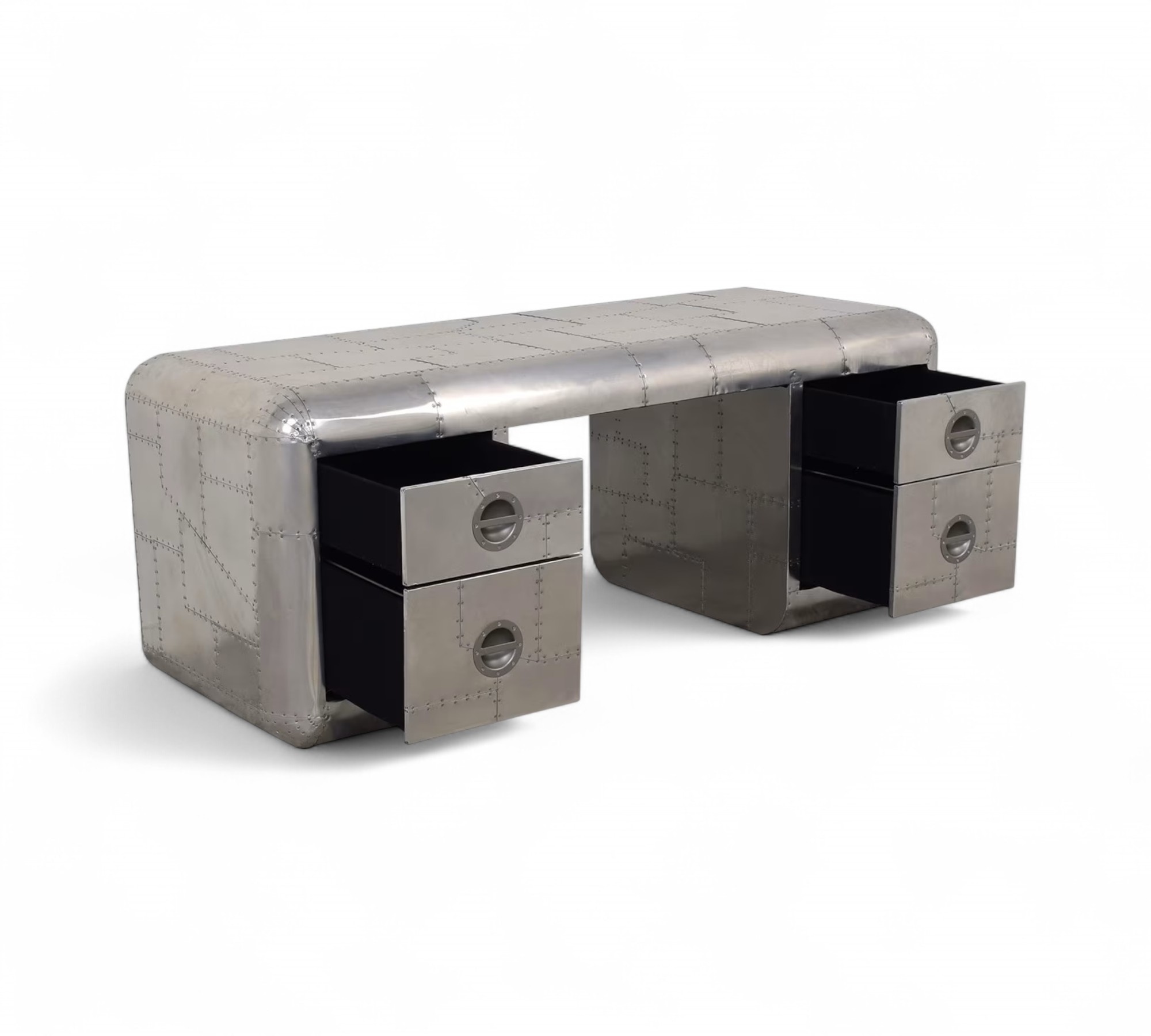The Aviator Desk is a bold fusion of industrial design and vintage aviation heritage, crafted to make a statement in any workspace. Hand-finished with riveted aluminium panels, it embodies the raw power and precision of mid-century aircraft engineering. The sleek curves and polished surface create a refined yet rugged aesthetic, making it a versatile piece suited for executive offices, creative studios, or luxury interiors. Its presence elevates the atmosphere, blending functionality with timeless character.