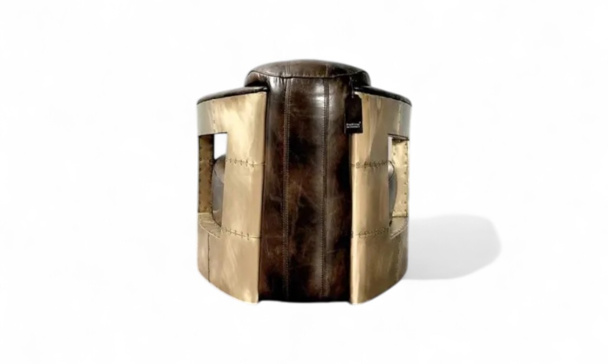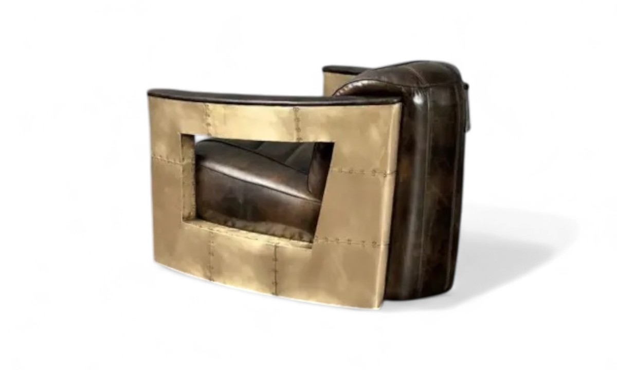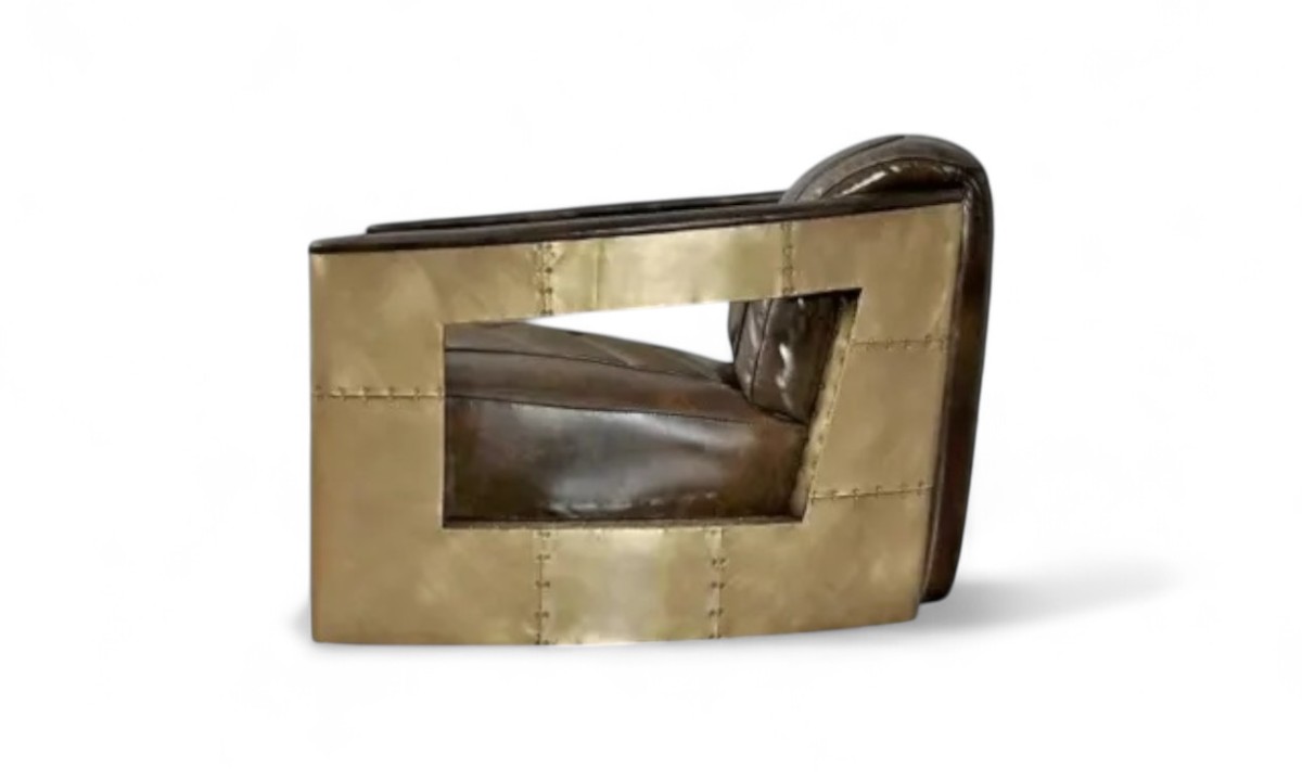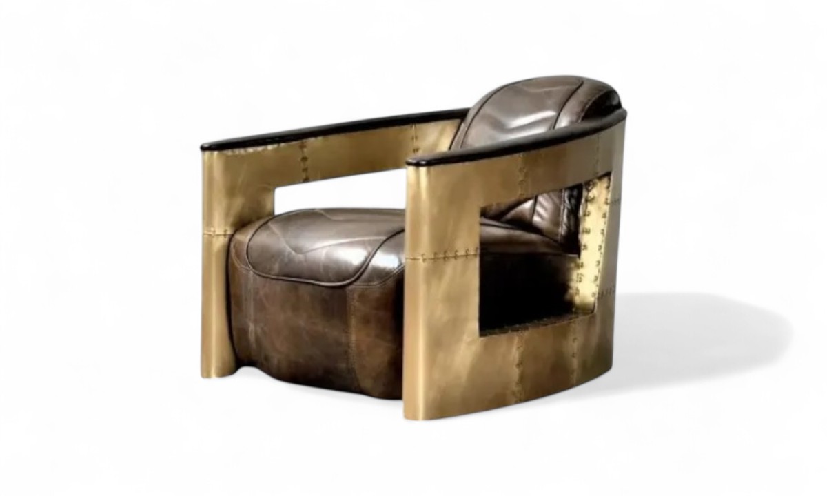 Aviator Golden Armchair is a rich and elegant piece defined by its superb quality and sophisticated design. Its aerodynamic curves are meticulously wrapped in riveted, golden-finish aluminium, creating a stunning visual statement that blends industrial chic with timeless luxury. This chair is a powerful focal point for any room, embodying a perfect harmony of rugged engineering and artistic flair.