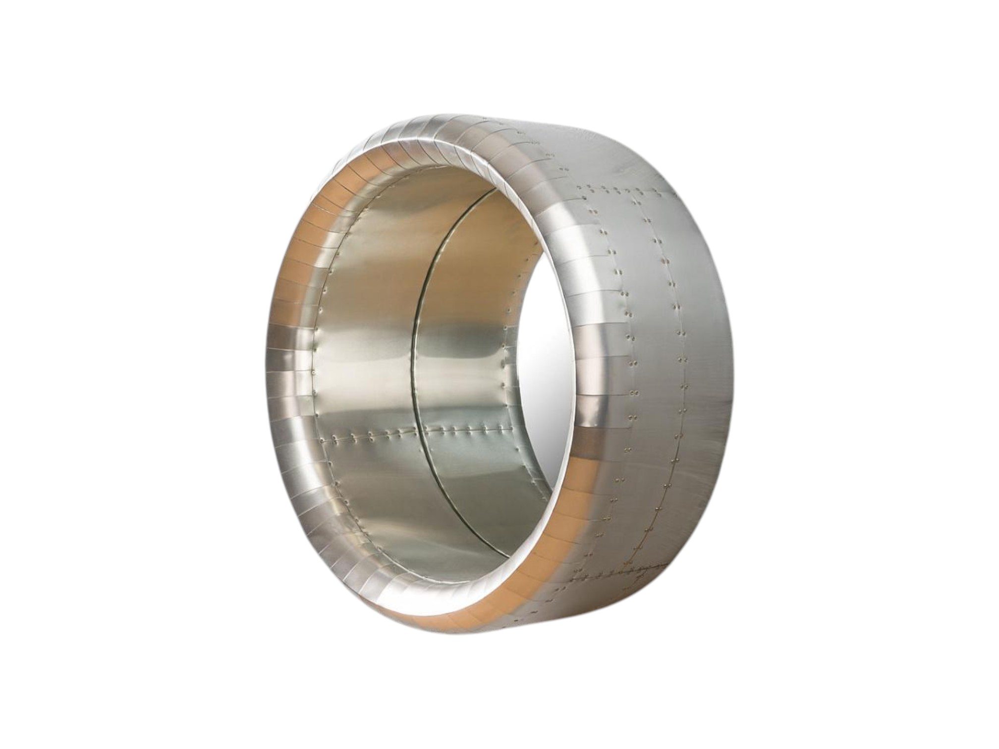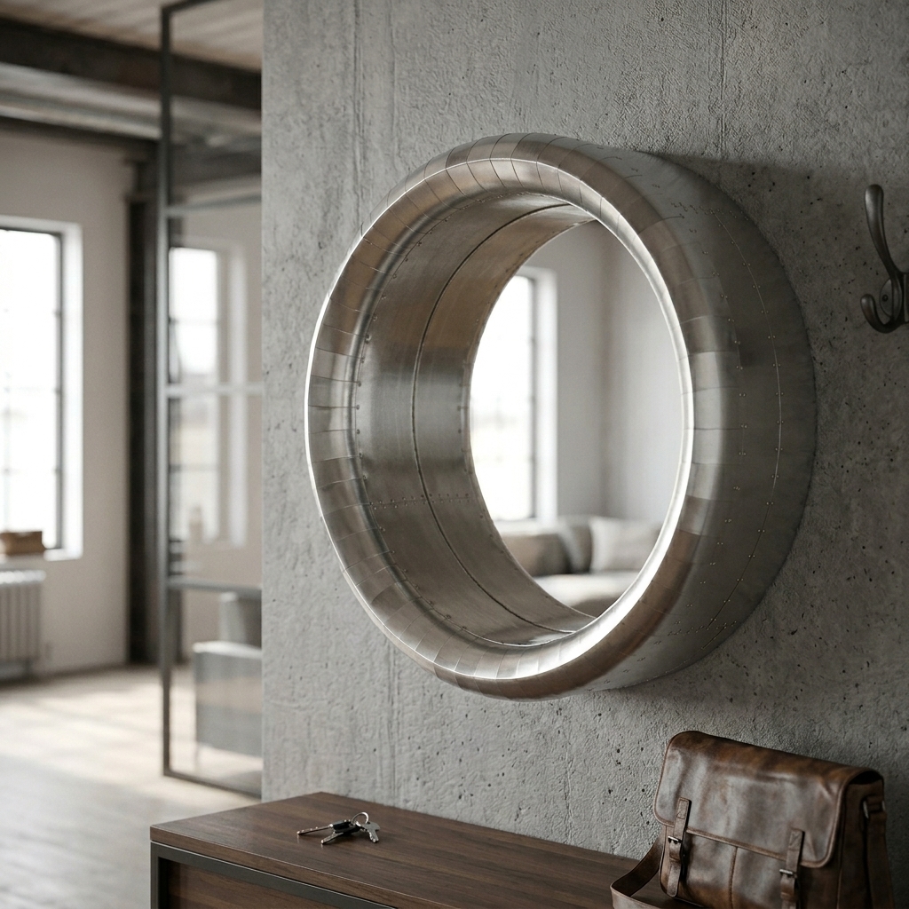 The Aviator Mirror is a striking blend of aviation-inspired design and modern luxury, crafted to bring bold character into refined interiors. Inspired by aircraft engine cowling aesthetics, its circular silhouette and riveted metal detailing create a powerful visual statement. The polished metallic finish reflects both light and craftsmanship, making it not just a mirror but a centrepiece that elevates any wall it adorns. Whether placed in a living room, hallway, bedroom, or office, the Aviator Mirror instantly introduces depth, texture, and a distinctive industrial-luxury appeal.