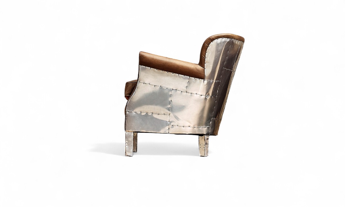 The Aviator Professor Armchair embodies bold aviation heritage and polished craftsmanship. Encased in riveted aluminium panels, its sculptural silhouette pays homage to mid-century aircraft design, while deep-channelled leather seating exudes scholarly elegance. The combination of metallic structure and sumptuous padding offers both visual contrast and supreme comfort—perfect for statement lounges and offices seeking refined, industrial charm.