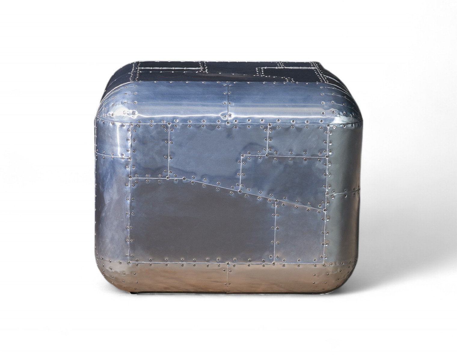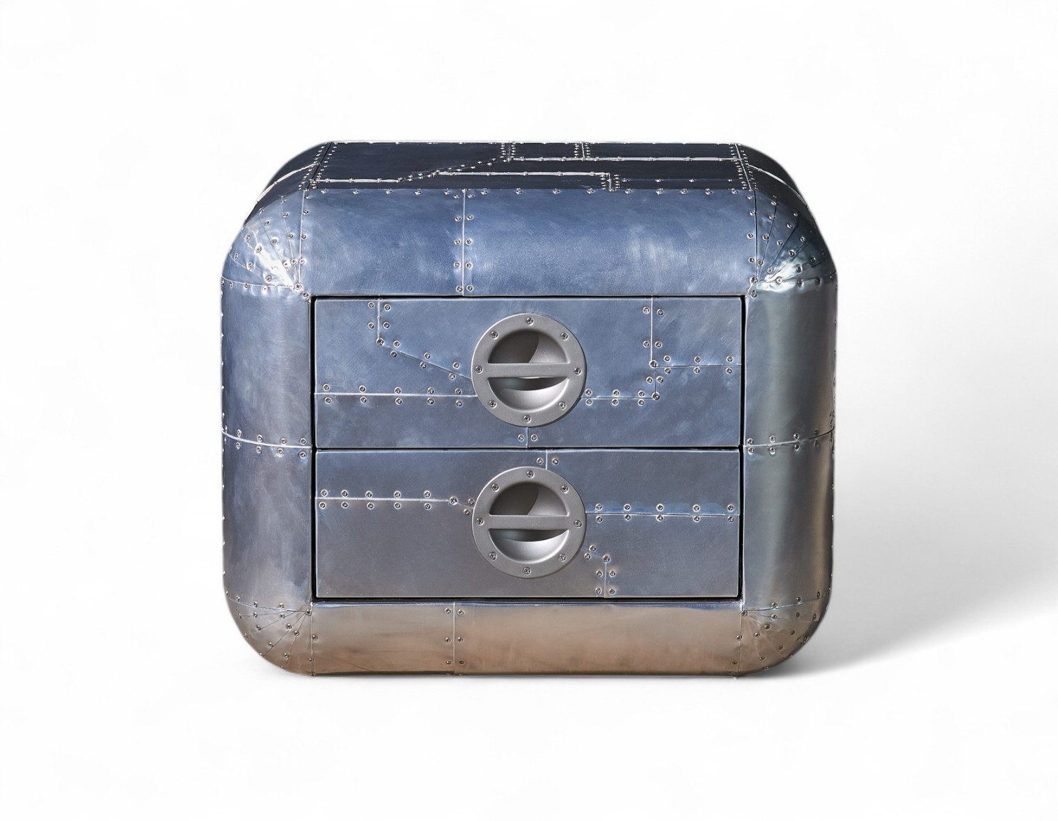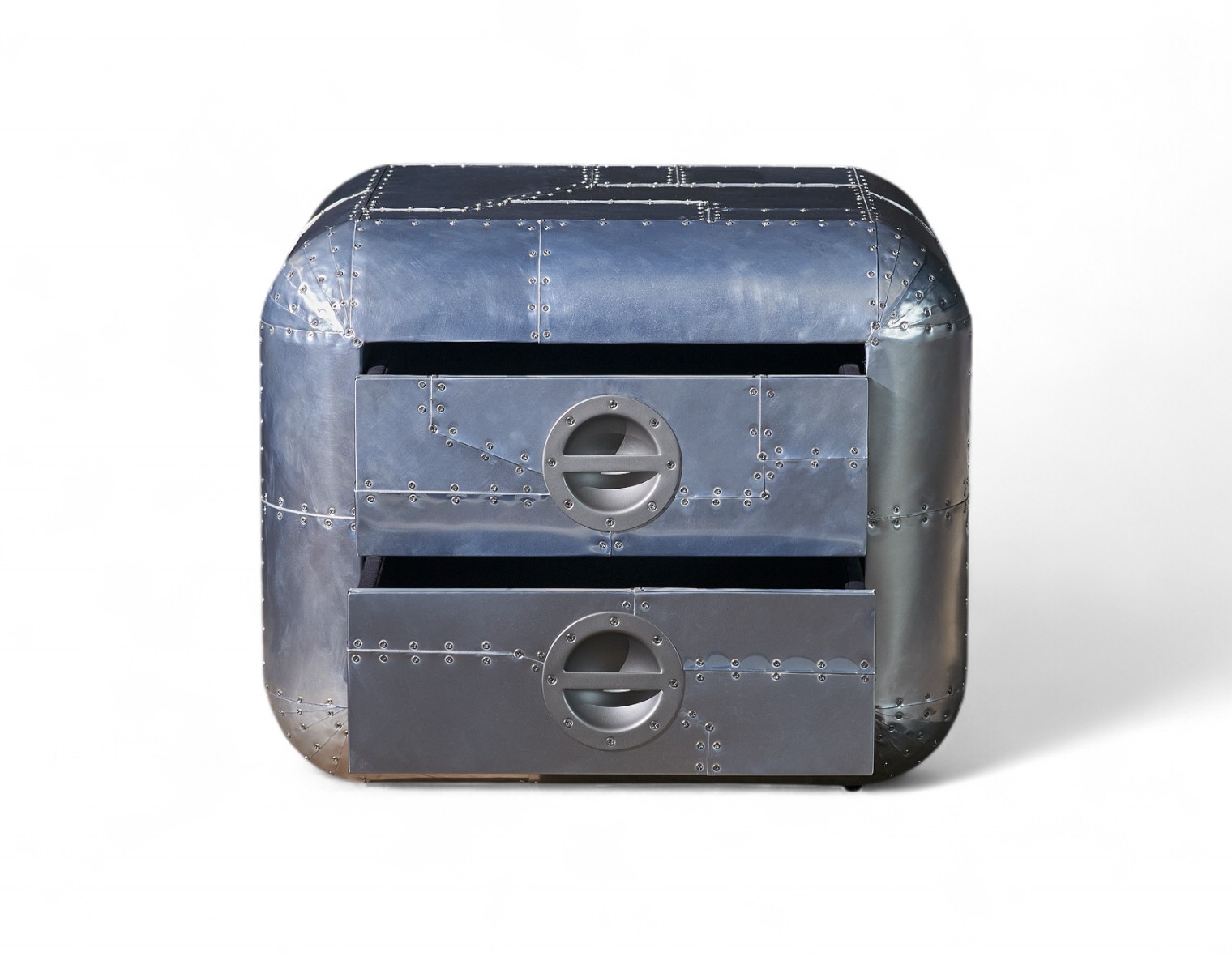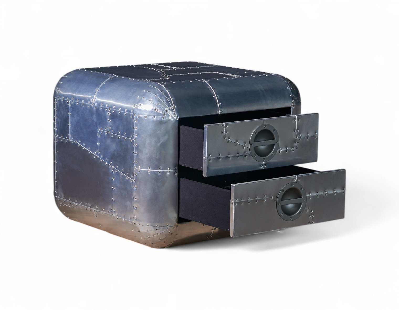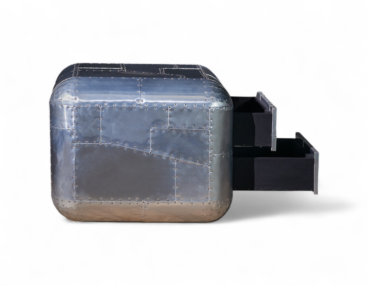 The Aviator Side Table is a striking fusion of utility and aviation-inspired design, crafted to complement modern, industrial, or vintage interiors. Hand-finished with riveted aluminium panels, it draws inspiration from mid-20th-century aircraft engineering, offering a unique and bold character. Its compact form makes it versatile—perfect as a bedside table, sofa companion, or standalone statement piece. The metallic finish reflects light beautifully, adding depth and style to any setting.