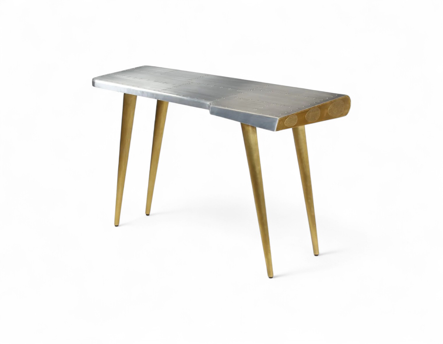 The Aviator Vintage Writing Desk combines sleek aviation-inspired design with timeless functionality, making it a standout addition to any modern or classic interior. Crafted with precision, the desk features a streamlined aluminium top with rivet detailing, reminiscent of vintage aircraft panels. The golden tapered legs not only add a touch of sophistication but also provide sturdy support, balancing industrial style with elegant refinement.