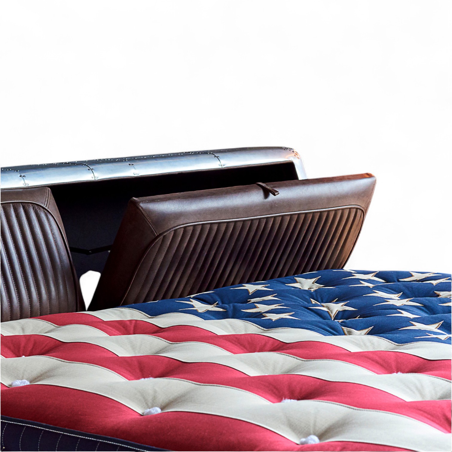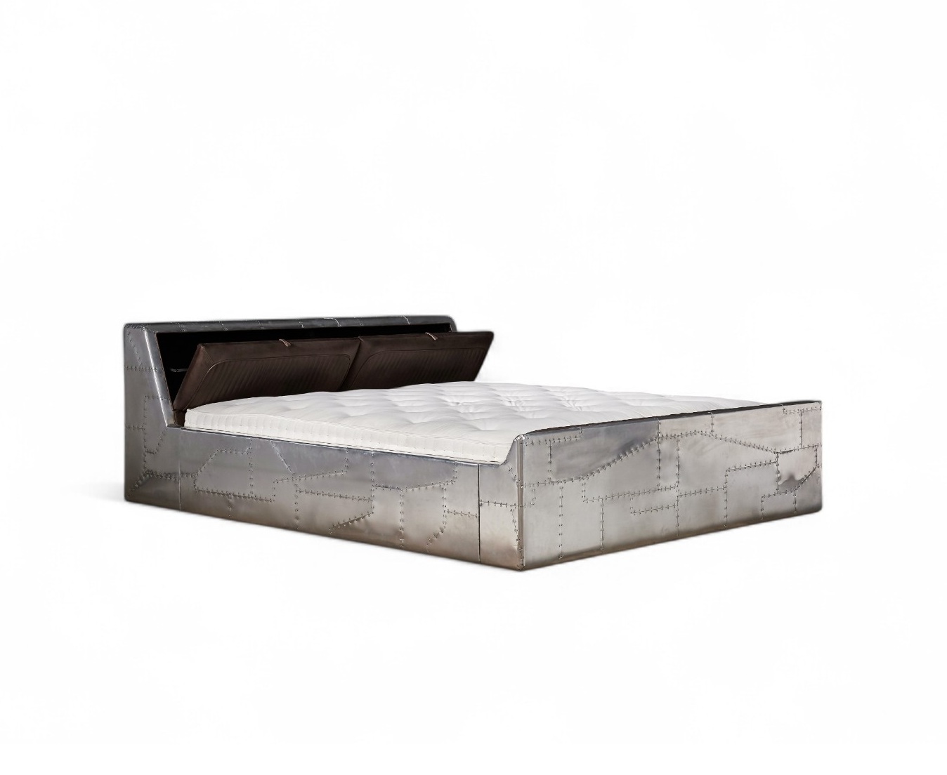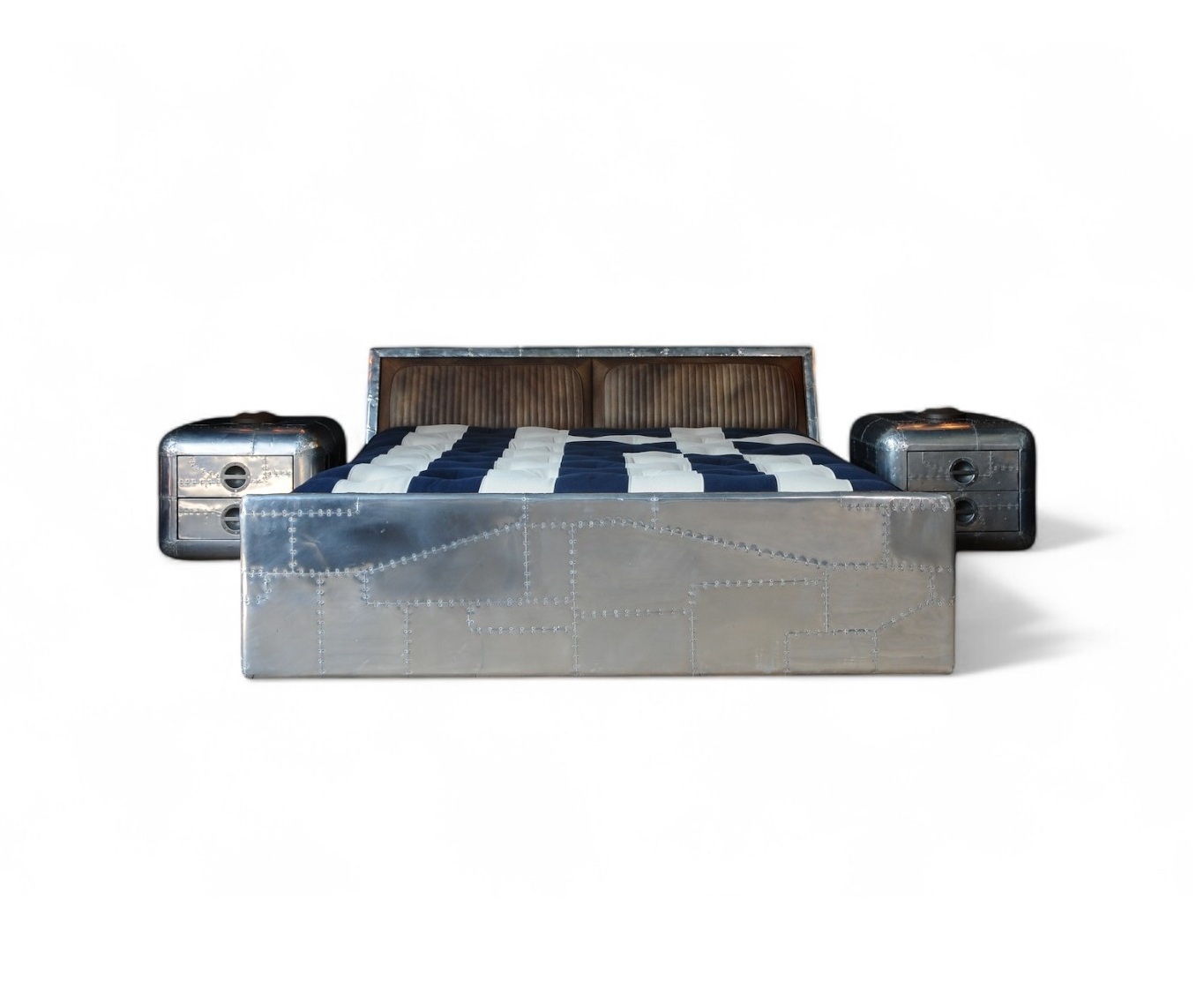 The Aviator Wing Bed is a bold fusion of industrial design and modern luxury. Wrapped in an aluminium-clad frame with visible rivet details, it draws inspiration from vintage aircraft engineering, creating a striking statement piece for contemporary interiors. The panelled leather headboard offers comfort and texture, while the sleek silhouette ensures it remains versatile and stylish.