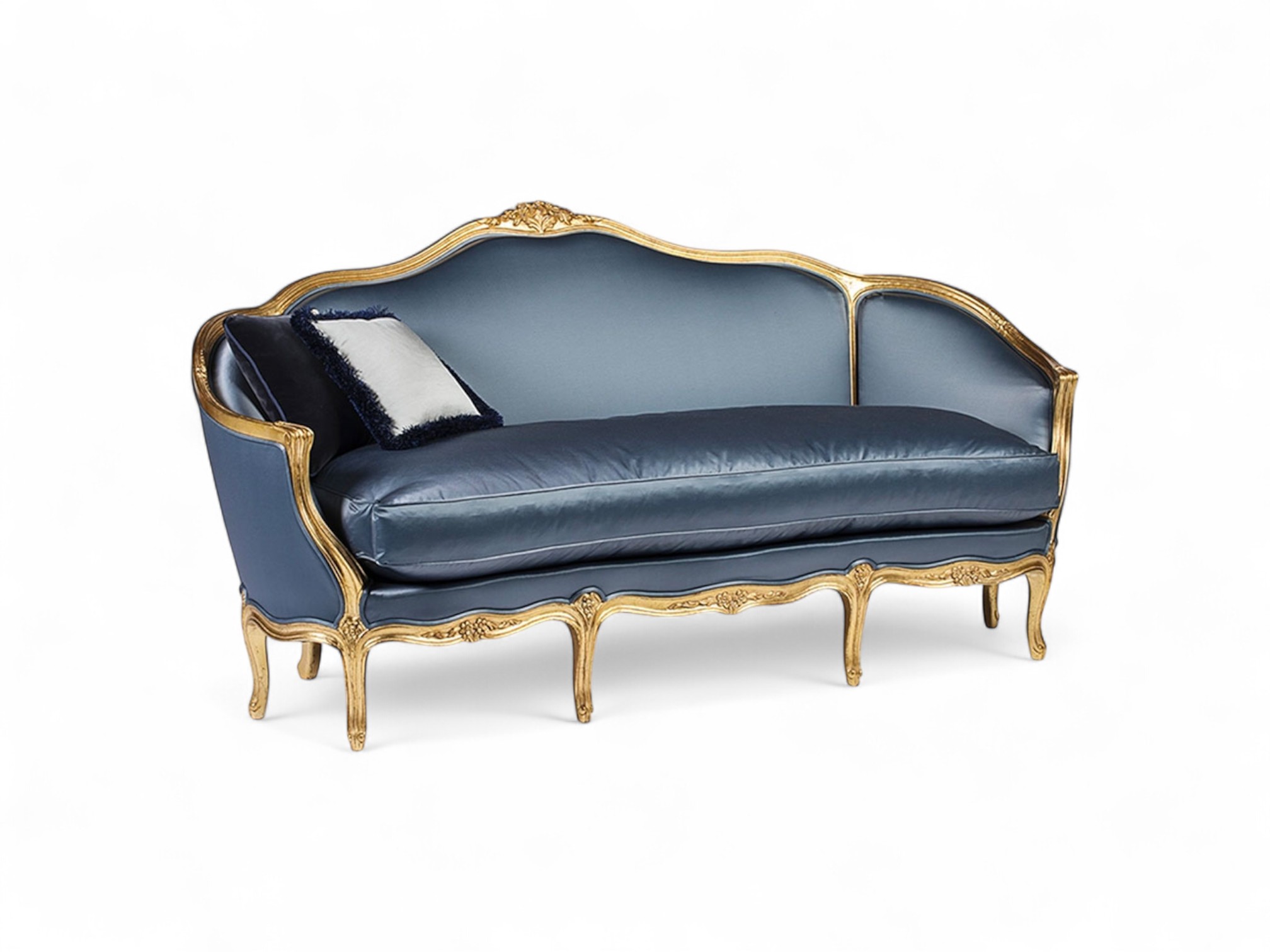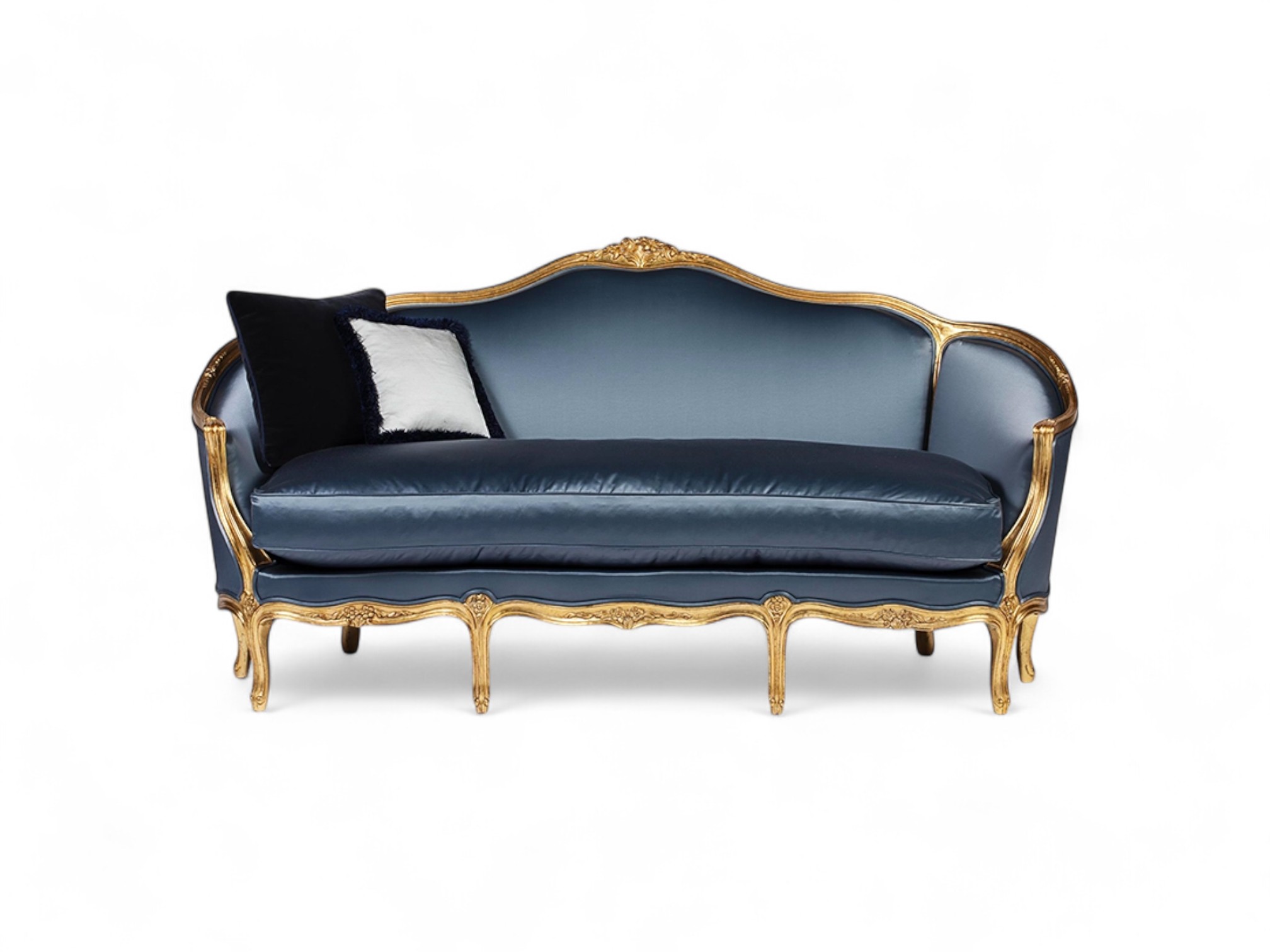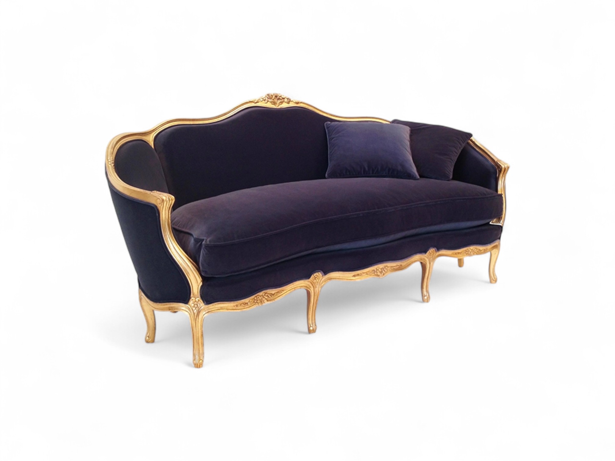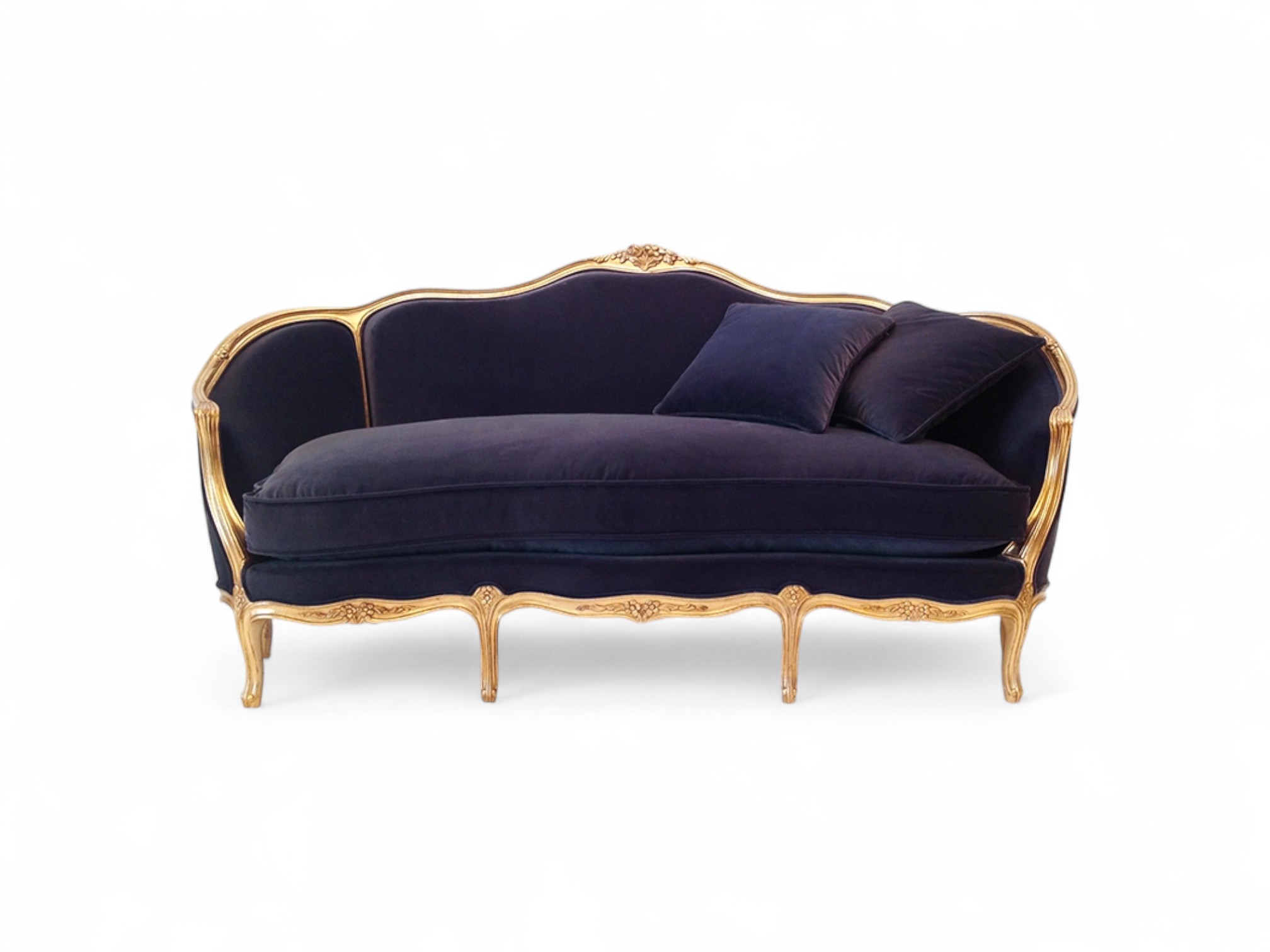 The Baroque Louis XV Sofa is a luxurious tribute to French Rococo design, bringing timeless opulence and sophistication to any interior. With its elegant, hand-carved wooden frame finished in radiant gold leaf, this piece captures the artistry and detail of 18th-century craftsmanship. The deep navy velvet upholstery adds a rich, modern contrast to the traditional curves and ornate floral motifs, creating a striking visual statement.