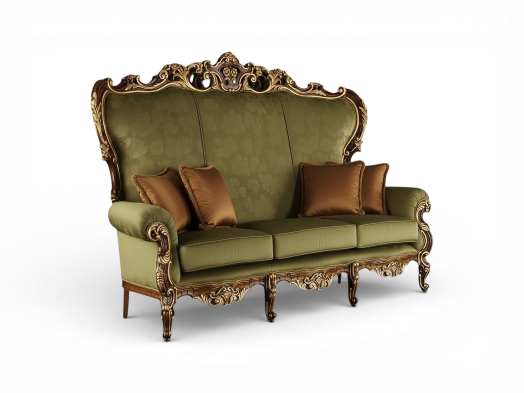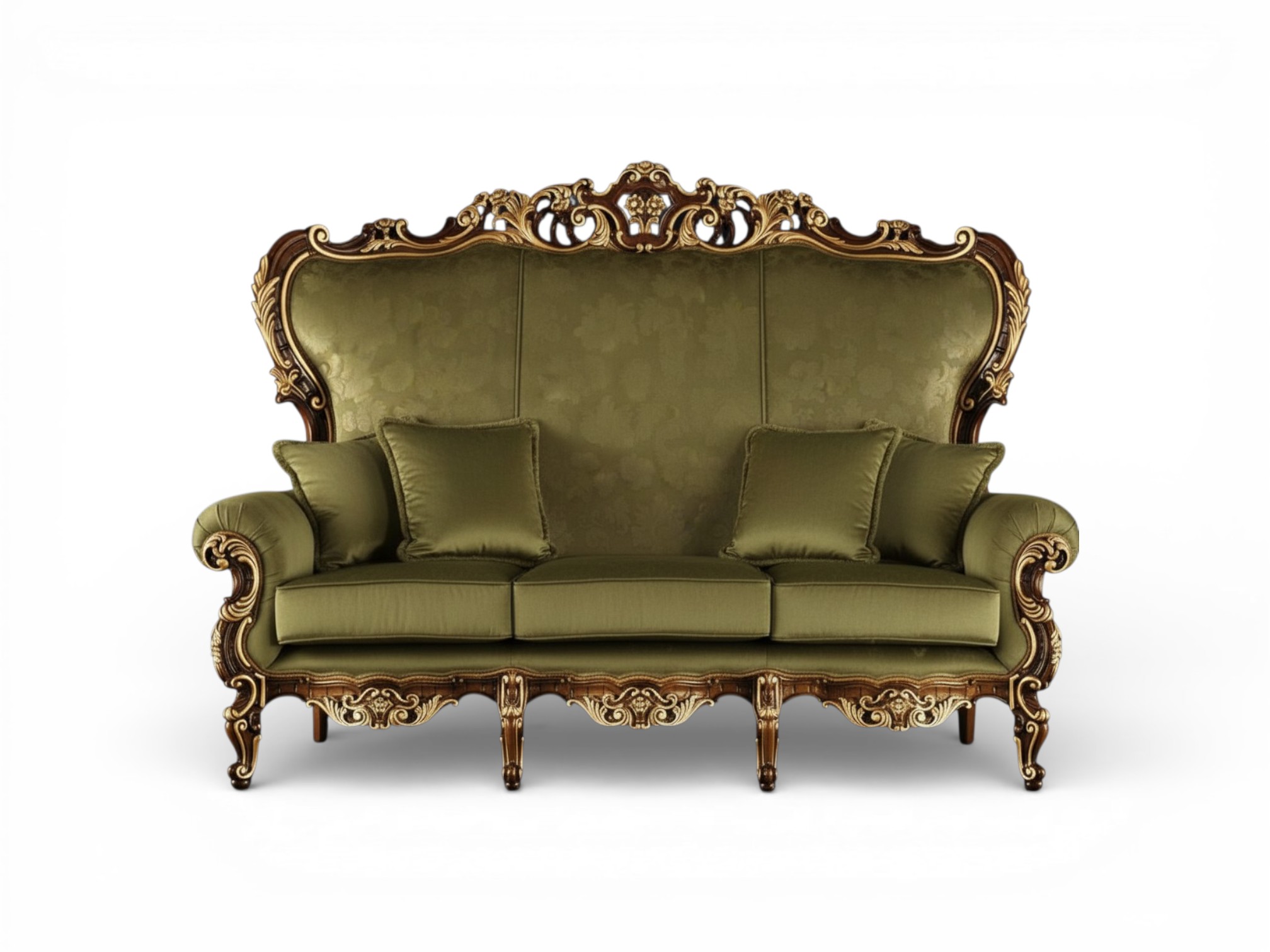 The Bellaforte Ornate Sofa showcases magnificent baroque elegance through its grand high-back silhouette, richly carved hardwood frame, and luxurious upholstered seating. The sculpted crest rail rises with intricate floral motifs, while the sweeping scroll arms and refined carvings express timeless European craftsmanship. Moreover, Bellaforte Ornate Sofa introduces a regal statement to luxury living rooms with its commanding presence and refined detailing.