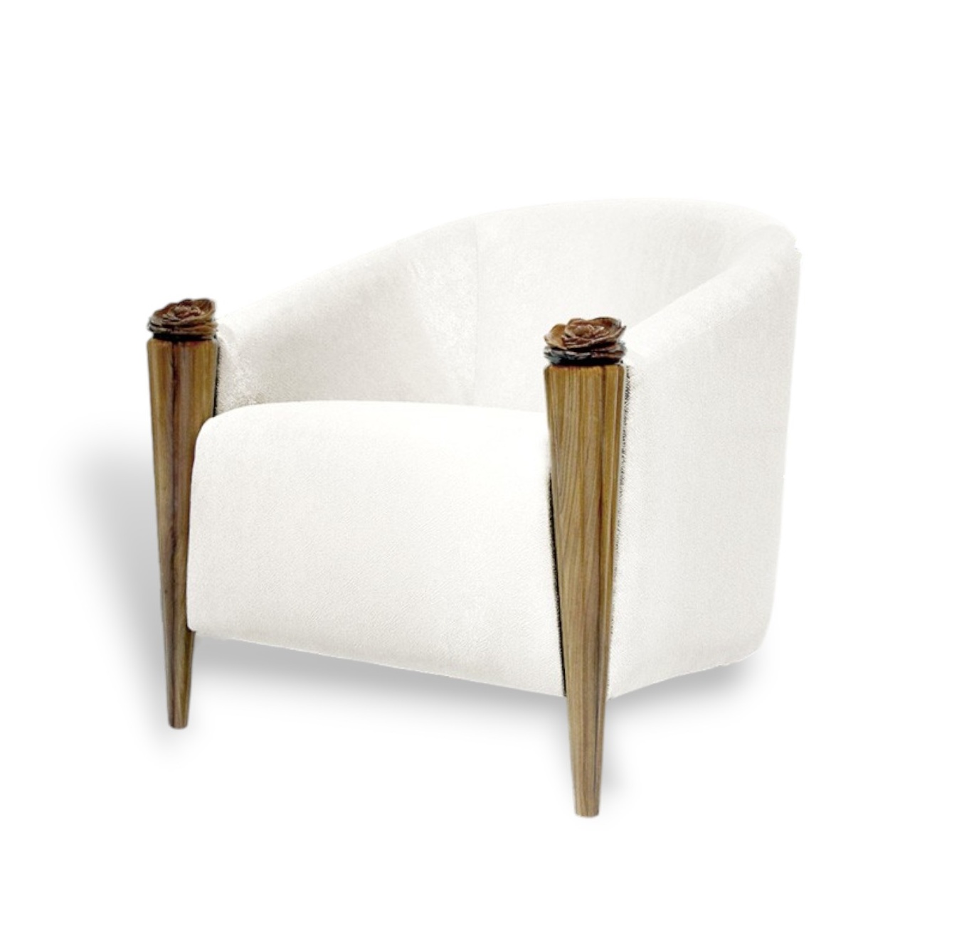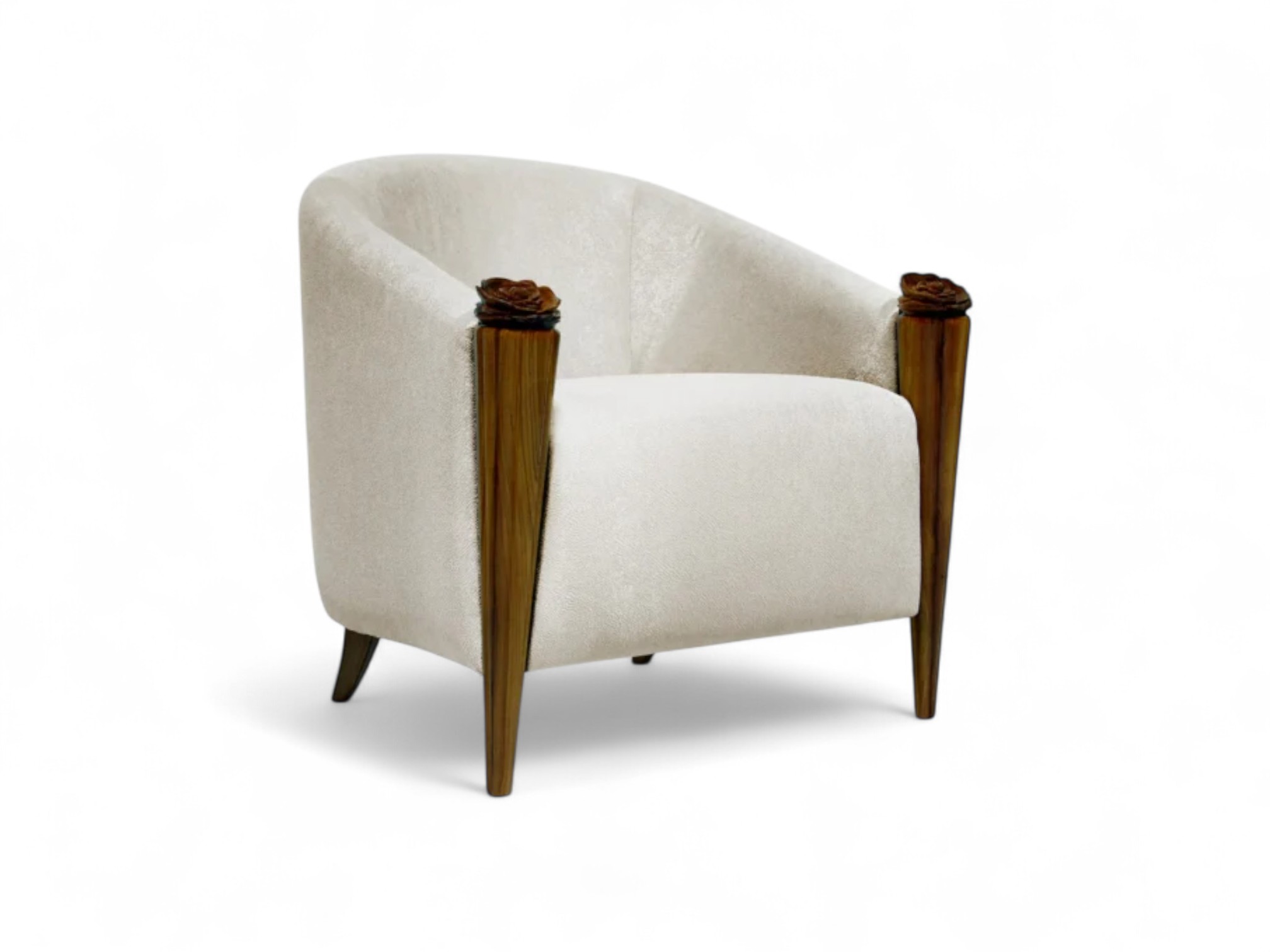 The Blossom Haven Armchair is a delicate fusion of modern design and nature-inspired elegance. Upholstered in soft ivory fabric, its smooth, curved shape offers a serene, welcoming presence. The elegantly carved wooden legs and armrests, adorned with intricate rose motifs, provide a beautiful contrast, elevating this armchair to an art piece in any space.