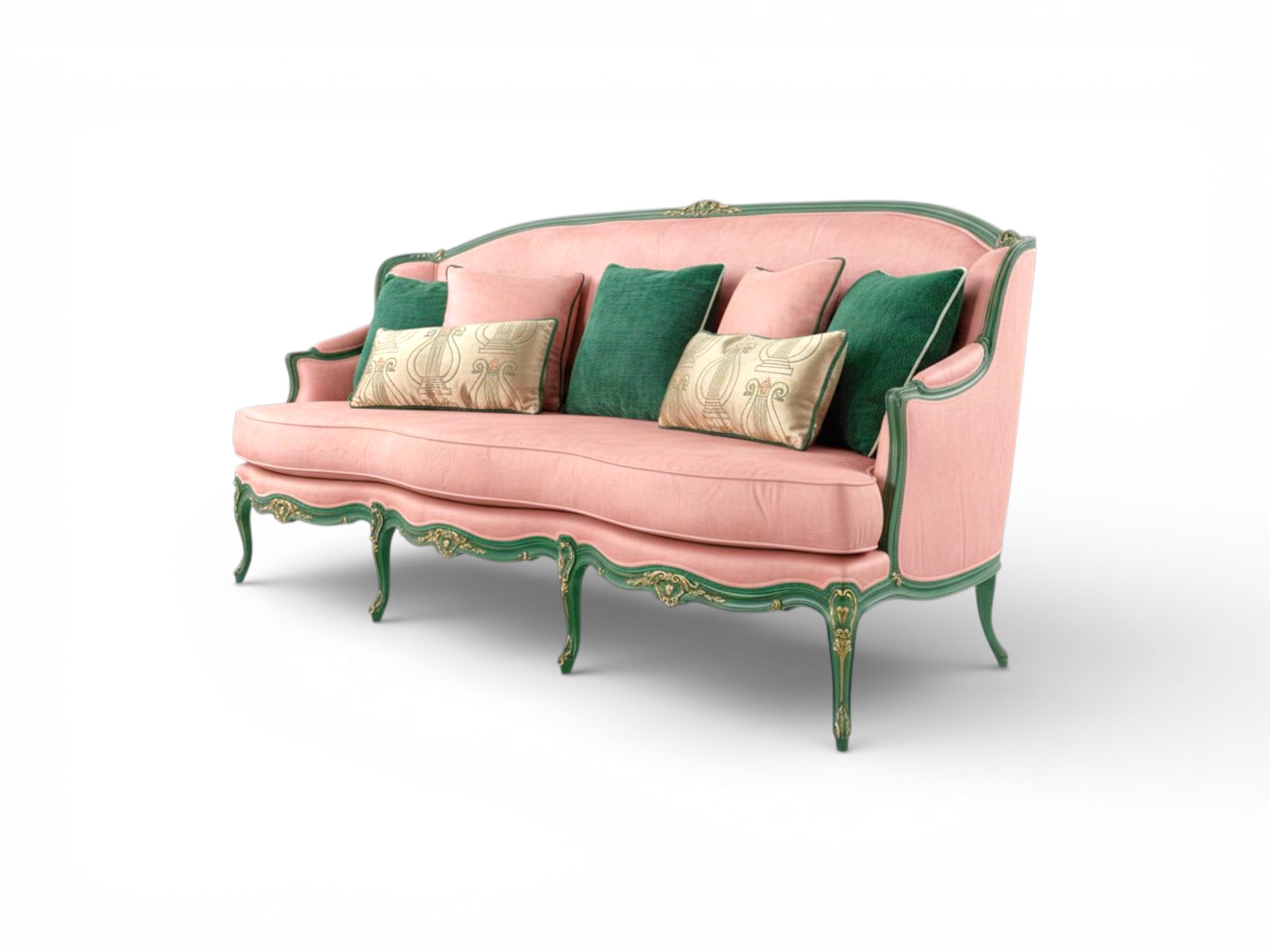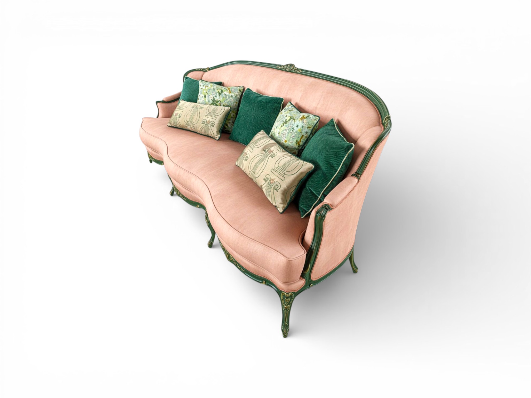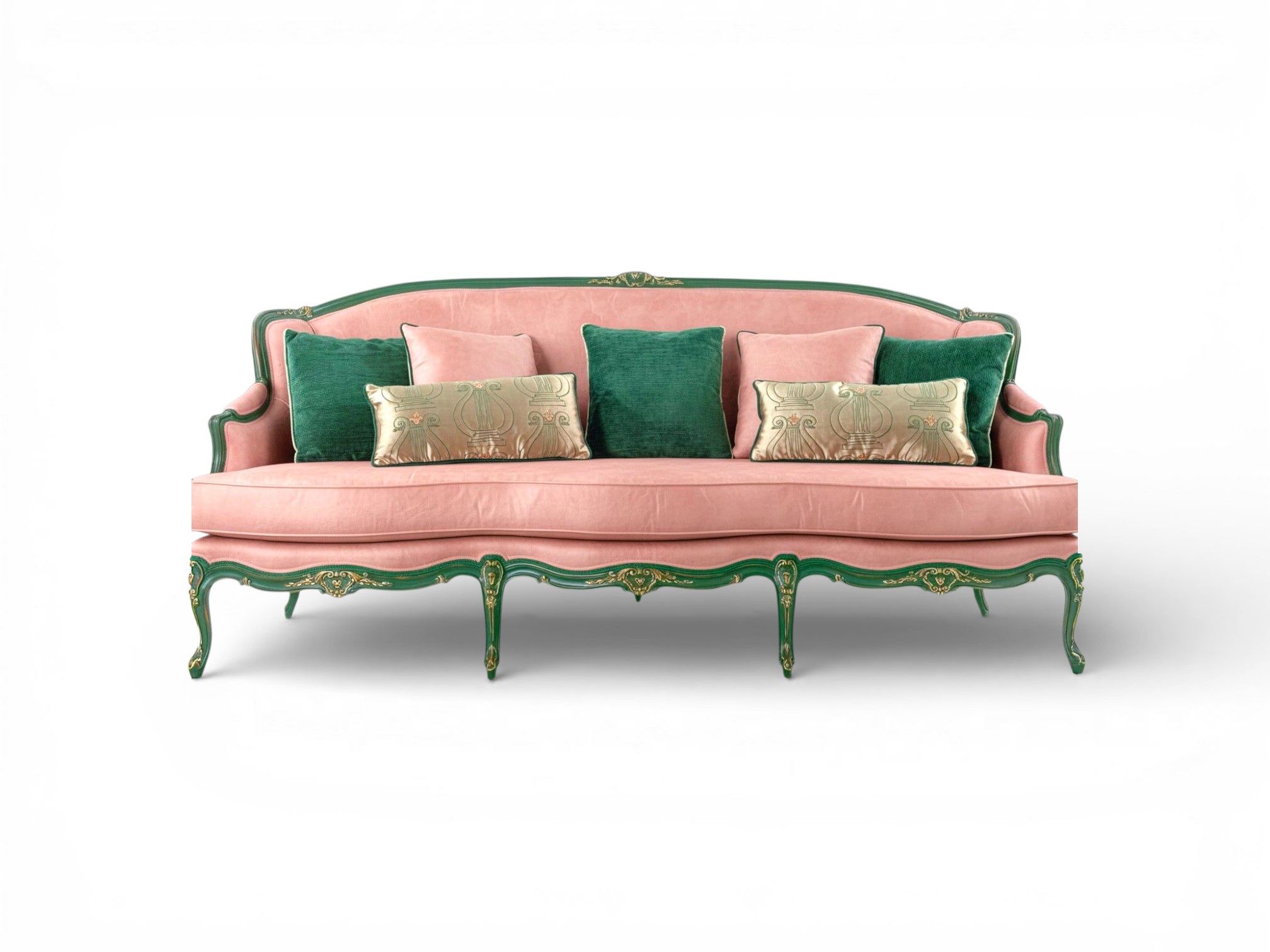 The Blush Opulent Crest Sofa embodies refined Italian-inspired elegance with its graceful silhouette, soft blush velvet upholstery, and beautifully carved hardwood frame finished in rich emerald green with delicate gold accents. The gently curved backrest flows seamlessly into sculpted arms, creating a sophisticated and harmonious profile. Moreover, the Blush Opulent Crest Sofa introduces vibrant classical luxury to refined interiors, therefore becoming a striking focal point for elegant living rooms.