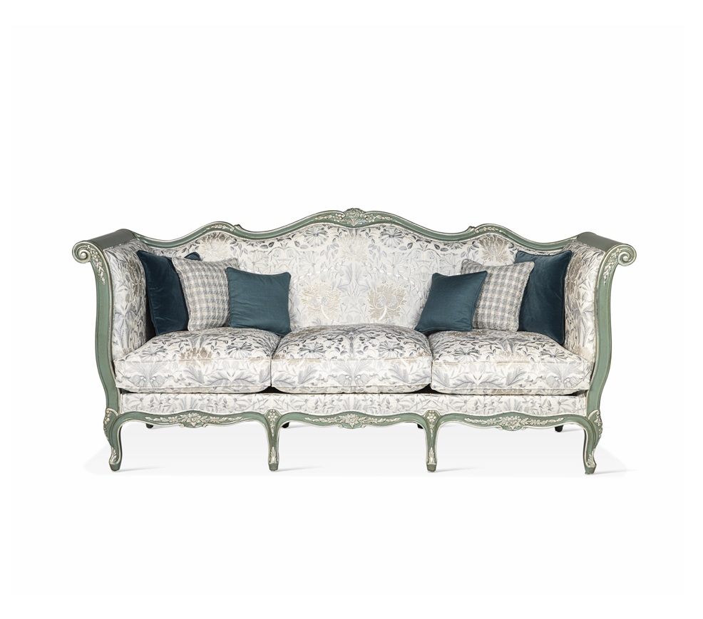 The Carved Antique Sofa offers a stunning blend of traditional craftsmanship and luxurious comfort. With a gracefully carved wooden frame in a soft green finish, it features intricate detailing along the armrests and legs, highlighting its vintage charm. The beautifully upholstered seat and backrest, adorned in an elegant floral pattern, offer timeless beauty, while the teal and checked throw pillows add a contemporary touch for an inviting contrast.