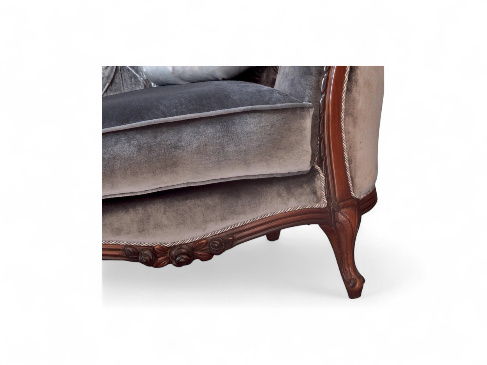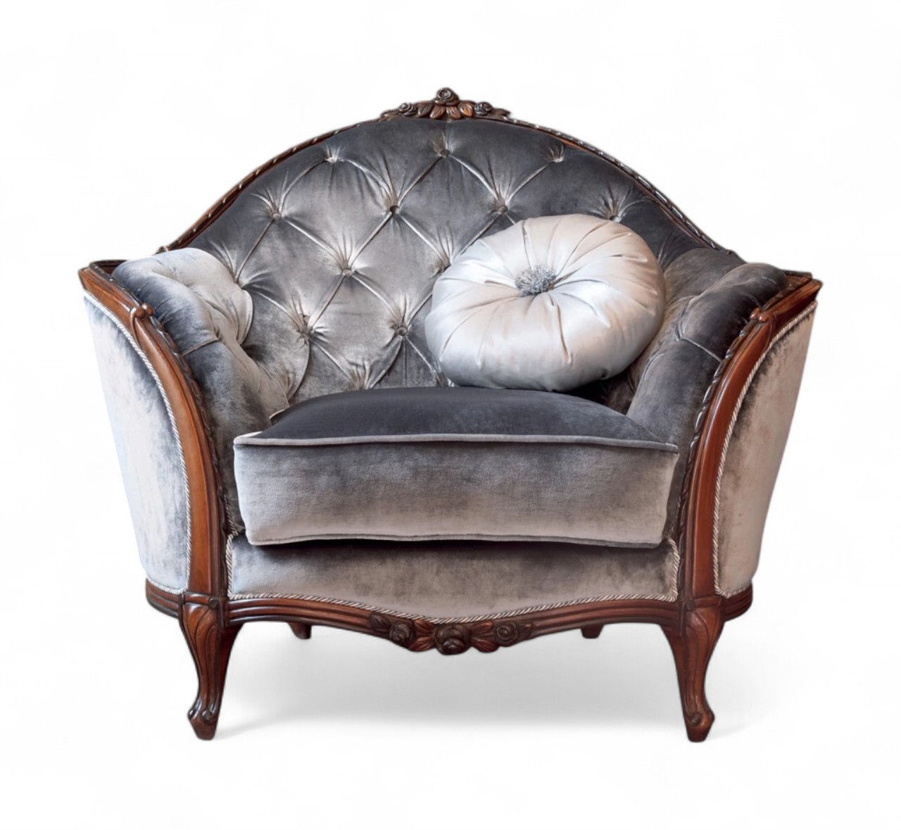 The Carved Louis Moonlight Armchair captures regal refinement with its sculpted wooden frame and silver-grey velvet upholstery. With deep button tufting and graceful contours, this piece draws inspiration from classic French design while offering sumptuous comfort. The curved silhouette and delicate carvings elevate any space with a quiet sense of grandeur and poise.