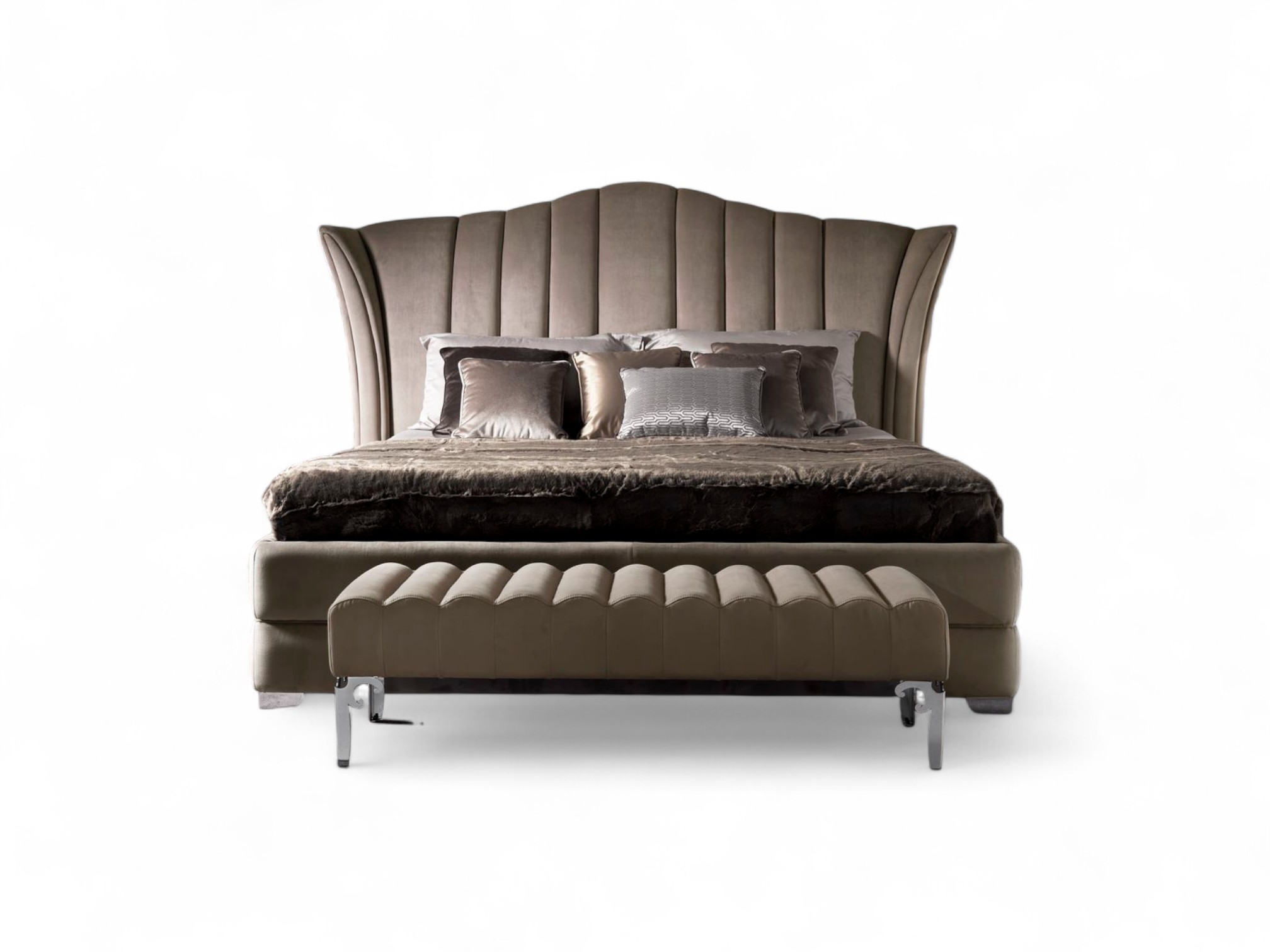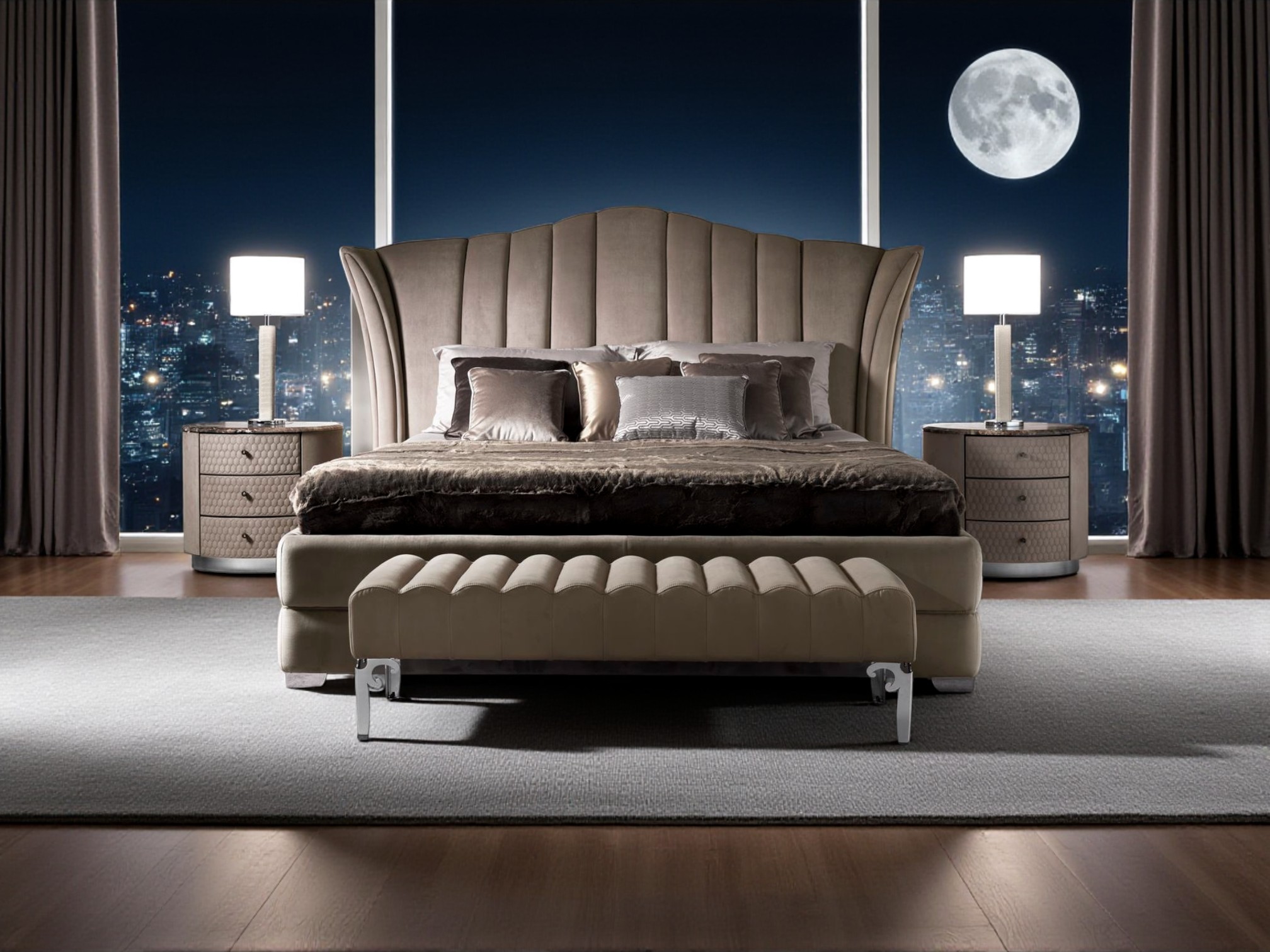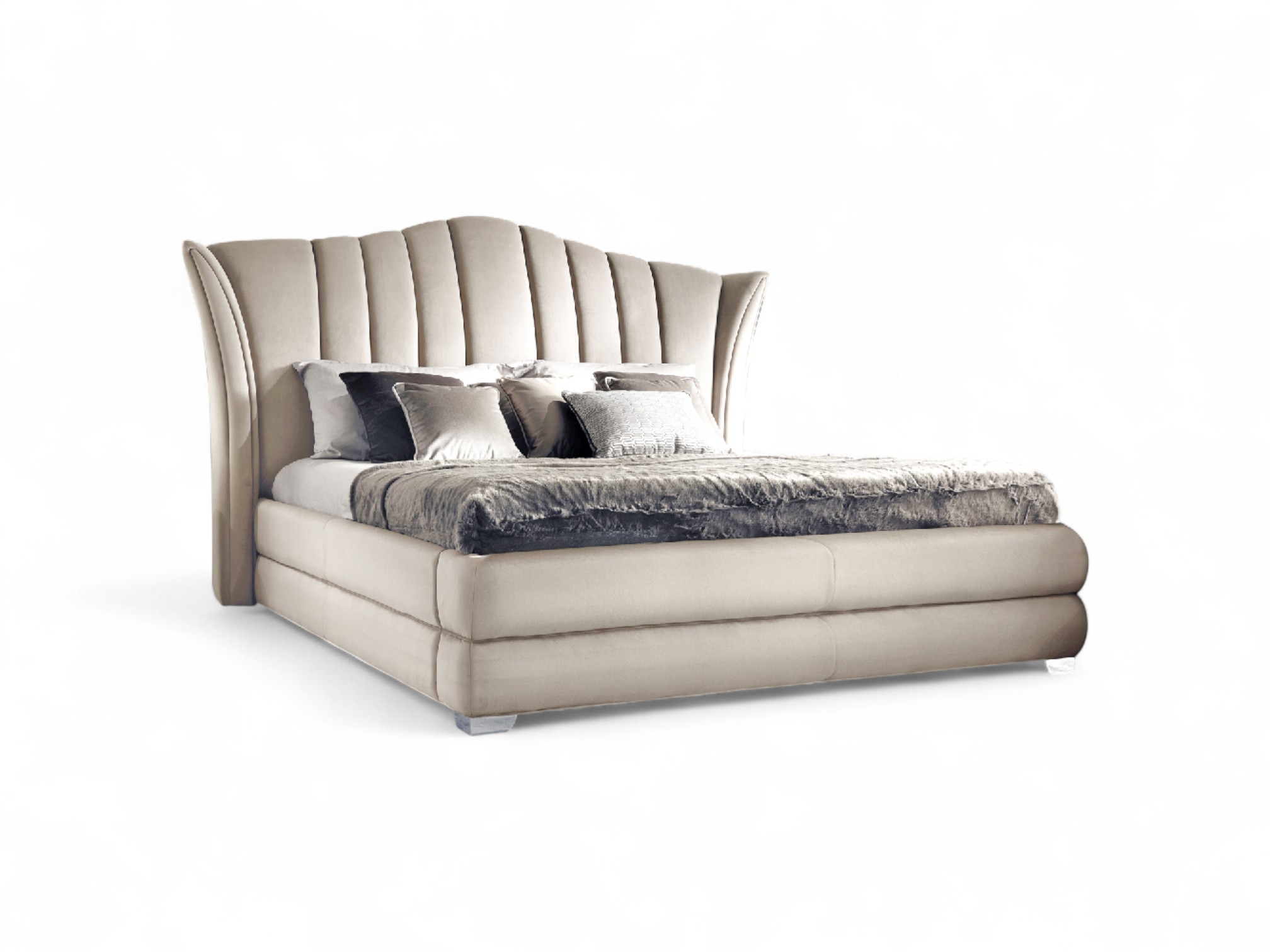 The Champagne Essence Bed showcases a sculptural wingback headboard with vertical tufting, designed to bring structure and elegance to any modern bedroom. Wrapped in soft champagne velvet, it blends visual warmth with understated glamour, making the Champagne Essence Bed a natural focal point for refined interiors.