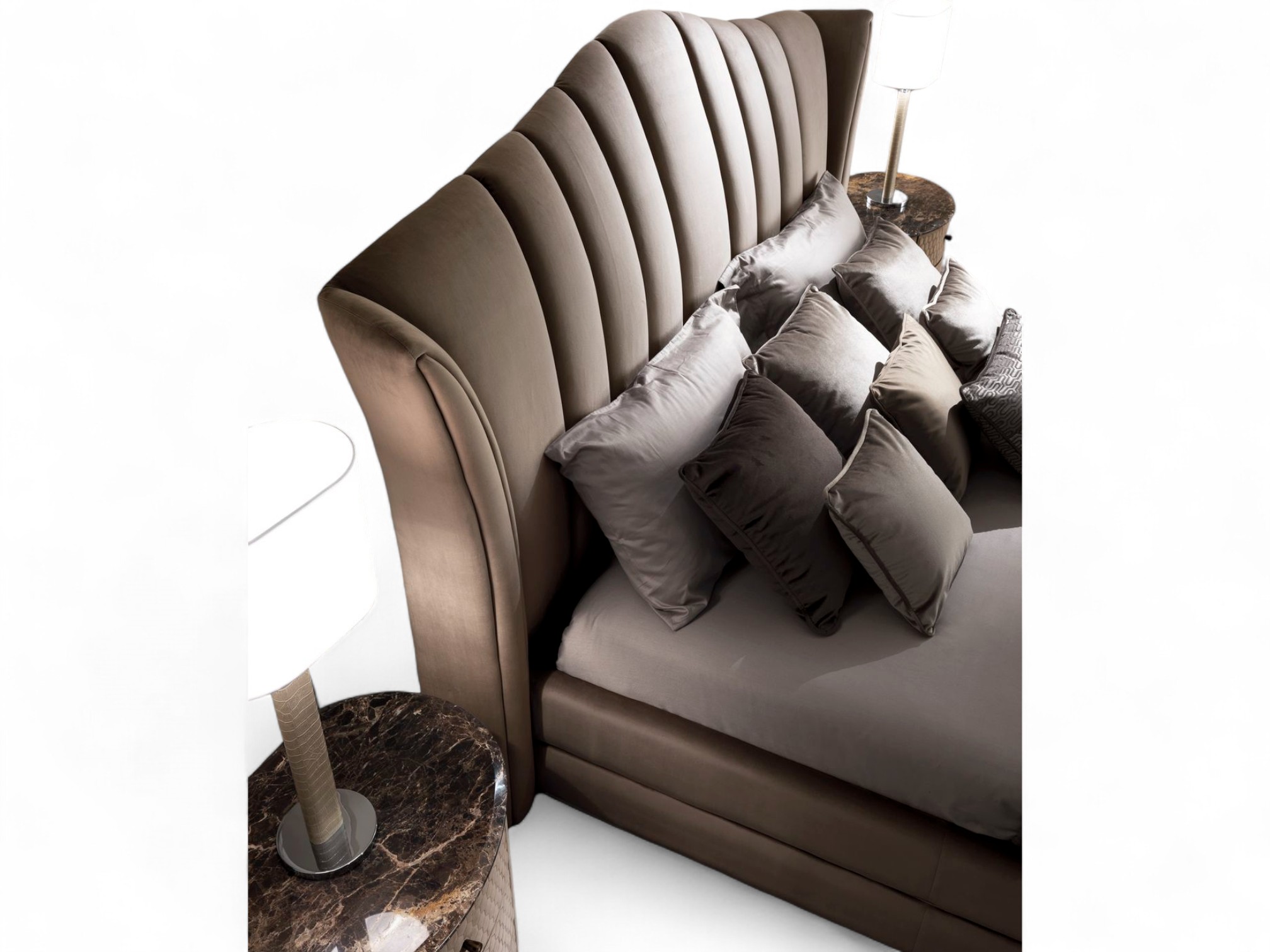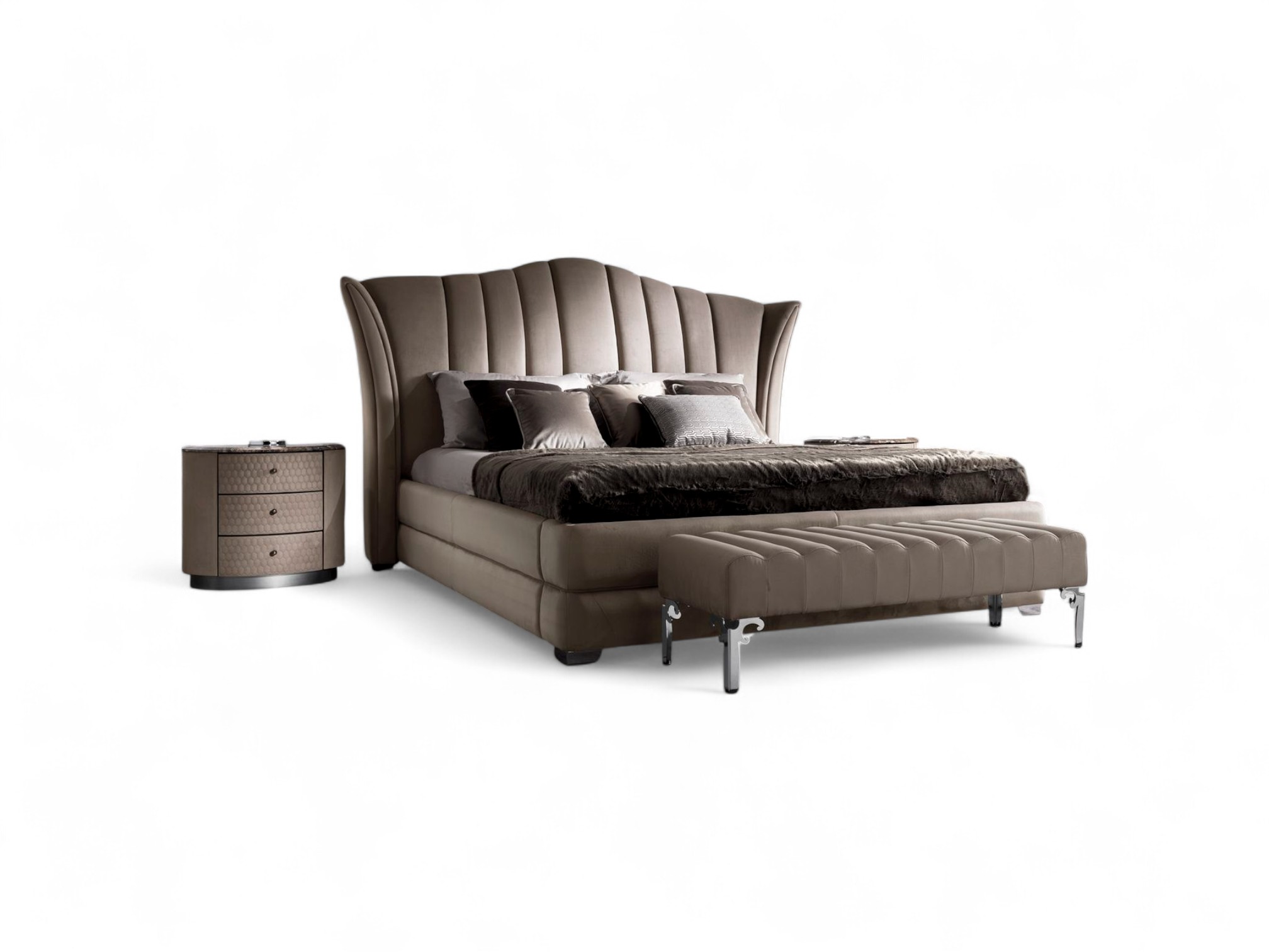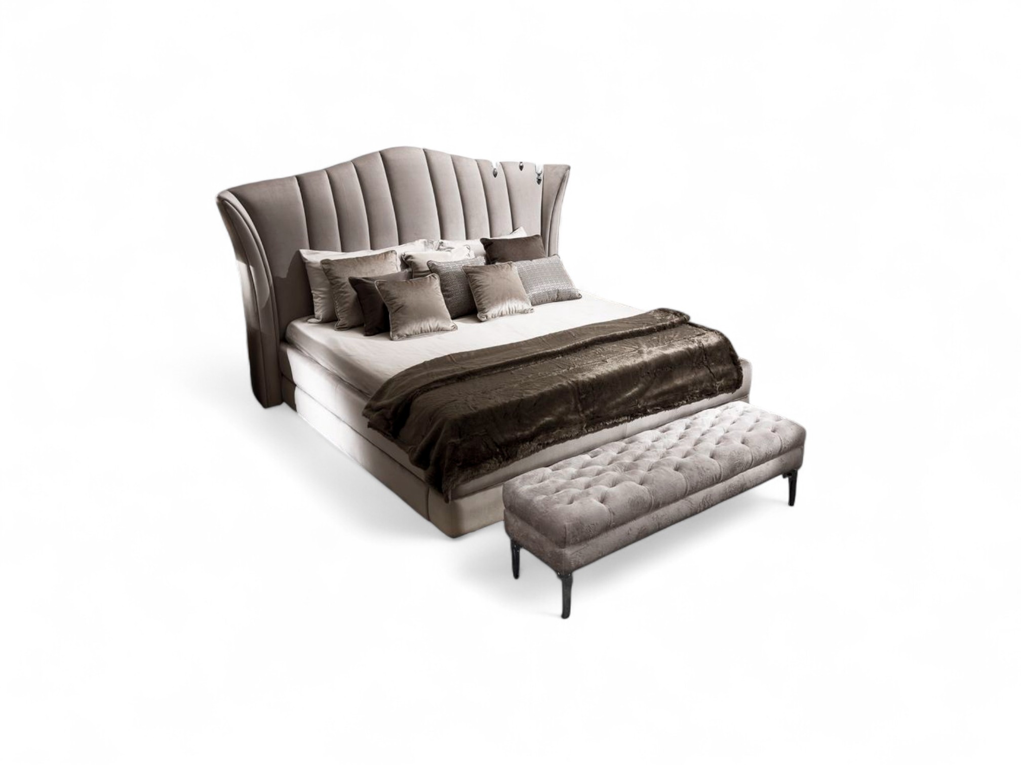 The Champagne Essence Bed showcases a sculptural wingback headboard with vertical tufting, designed to bring structure and elegance to any modern bedroom. Wrapped in soft champagne velvet, it blends visual warmth with understated glamour, making the Champagne Essence Bed a natural focal point for refined interiors.