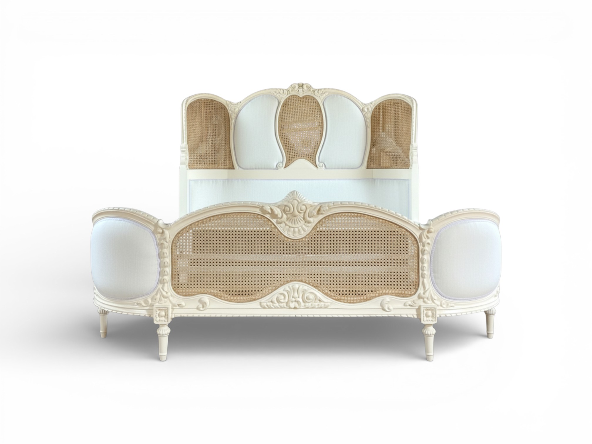 The Classic French Cane Bed offers timeless elegance, combining the soft charm of vintage design with exquisite craftsmanship. Featuring delicate, intricately carved wooden frames and woven cane panels, this bed exudes a sense of sophisticated French luxury. The gentle, neutral-toned upholstery complements the natural cane, creating a serene and inviting atmosphere in any bedroom.