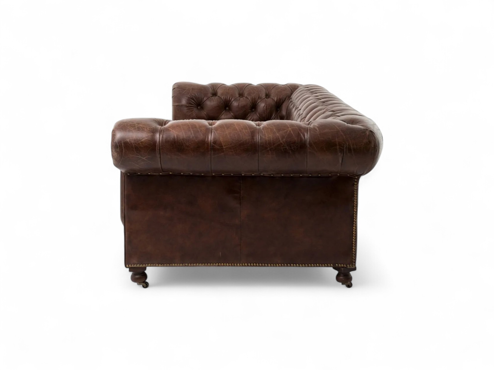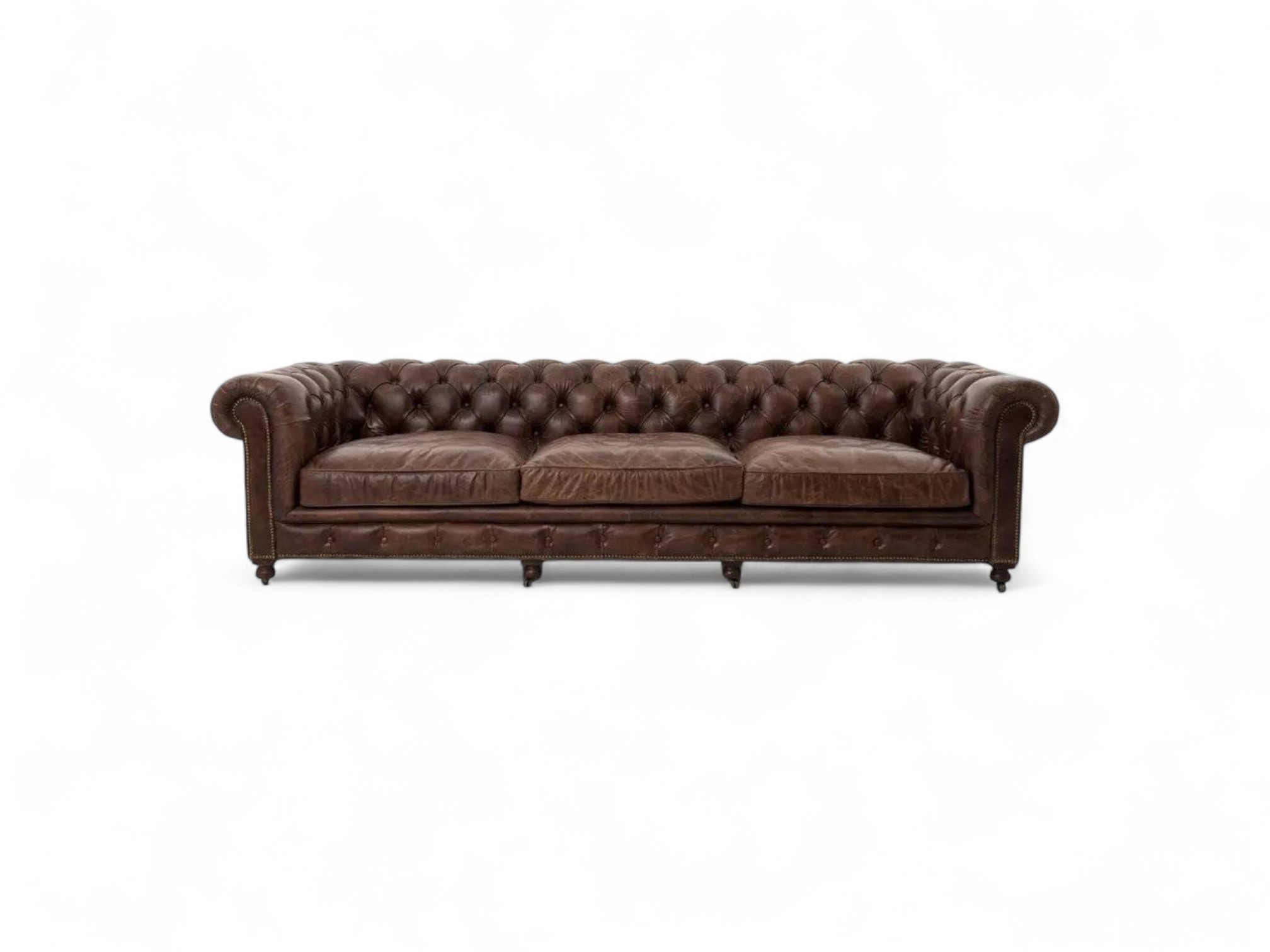 The Classic Leather Chesterfield Sofa embodies timeless sophistication and enduring comfort. Featuring the iconic deep button tufting, rolled arms, and rich leather upholstery, this piece pays tribute to traditional craftsmanship with a bold presence. The aged leather patina enhances its vintage appeal, while the generously padded seats offer relaxed elegance for any setting.