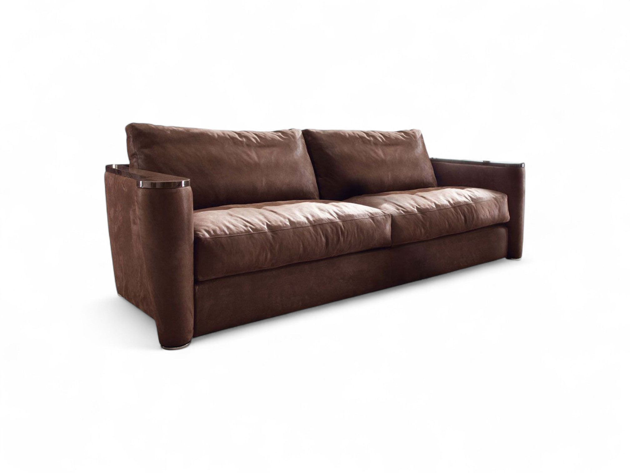The Classic Leather Designer Sofa offers a perfect blend of contemporary elegance and refined craftsmanship. Upholstered in luxurious brown leather, it exudes a rich, timeless appeal. The sleek and minimalist design is highlighted by the unique, rounded armrests with metallic accents, giving it a modern yet sophisticated edge. The sofa’s deep cushions provide unmatched comfort, making it an ideal choice for both relaxation and style.