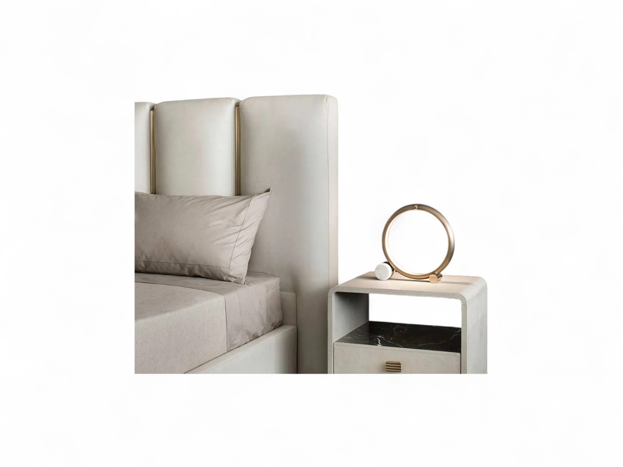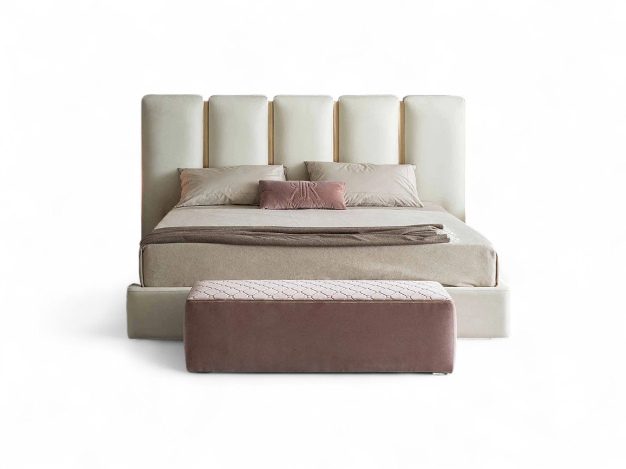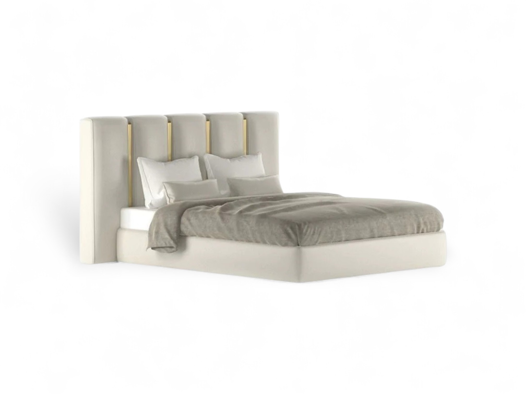 The Cloud Vale Bed brings an ethereal softness to modern interiors, offering a pillowy form and a gently contoured silhouette. Its tall headboard features wide, softly padded panels that introduce a rhythm of plush comfort, while the subtle gold accents add quiet opulence. Upholstered in a smooth, matte fabric, the bed feels both grounded and weightless — as though resting within a cloud.