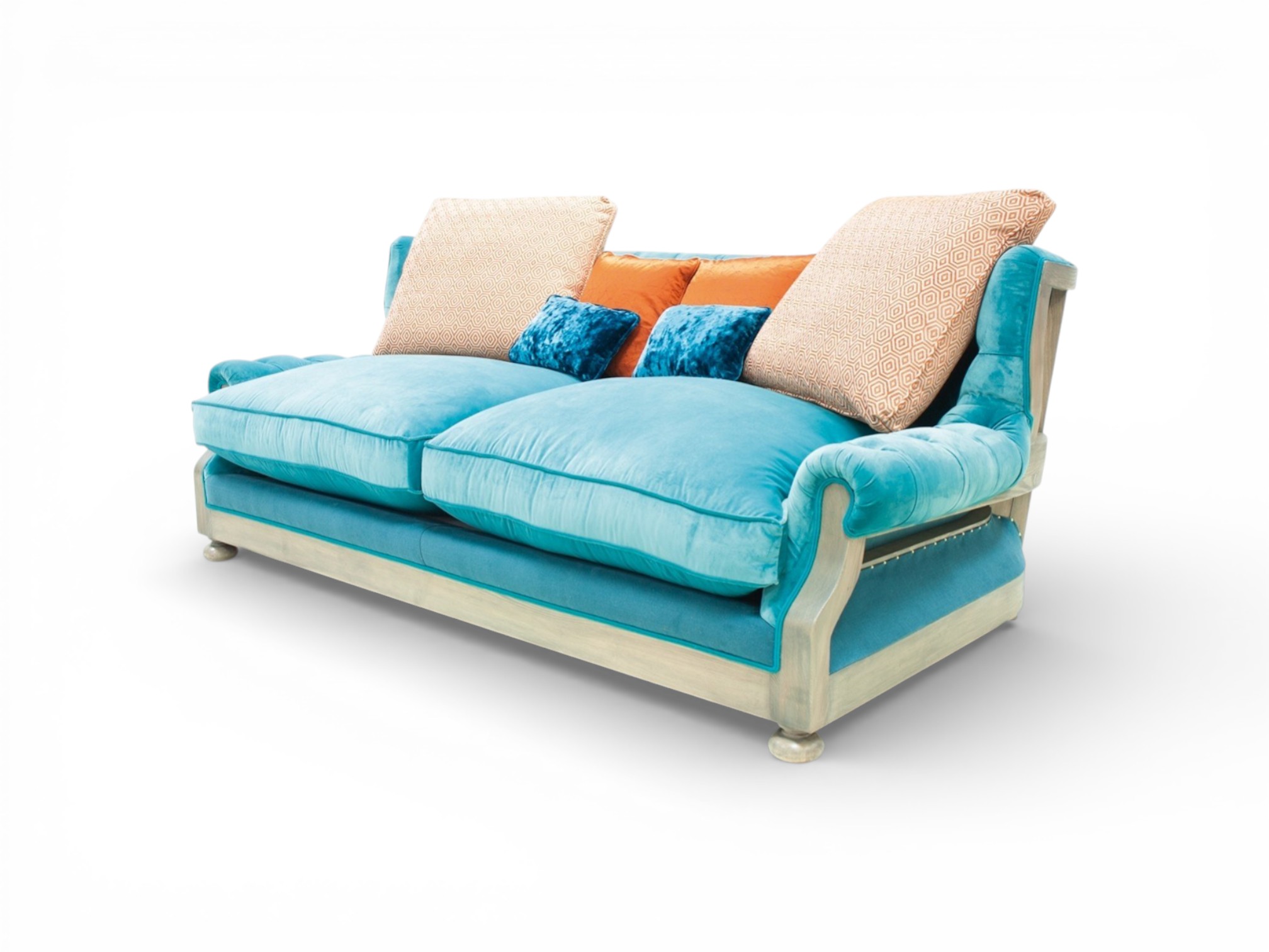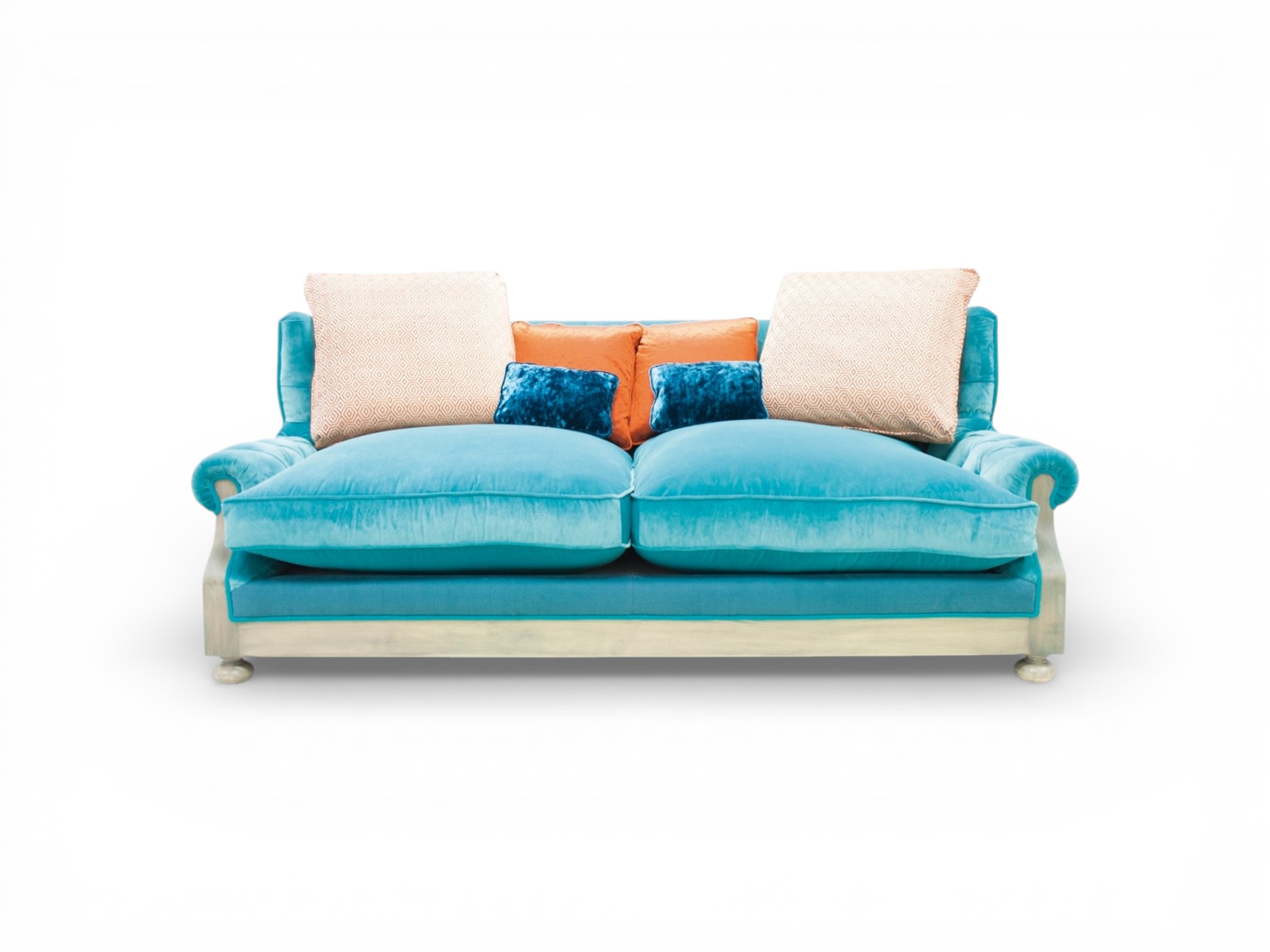 Expert craftsmen build the frame from solid hardwood to ensure lasting strength and stability. The deep plush seat cushions provide exceptional comfort, while the supportive back pillows enhance relaxation during extended seating. In addition, the clean wooden base introduces subtle warmth and structural contrast to the vivid upholstery. Consequently, the sofa complements modern homes, boutique interiors, and luxury hospitality spaces beautifully.