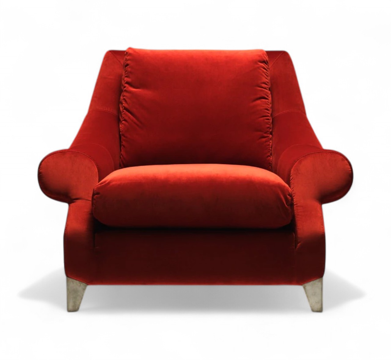 The Crimson Luxe Armchair is a statement of modern elegance and supreme comfort. With its generously cushioned seat, refined curves, and plush velvet upholstery, this armchair elevates any space with both warmth and sophistication. Its bold design makes it equally suited as a standout piece in a living room or as a luxurious accent in a private corner.