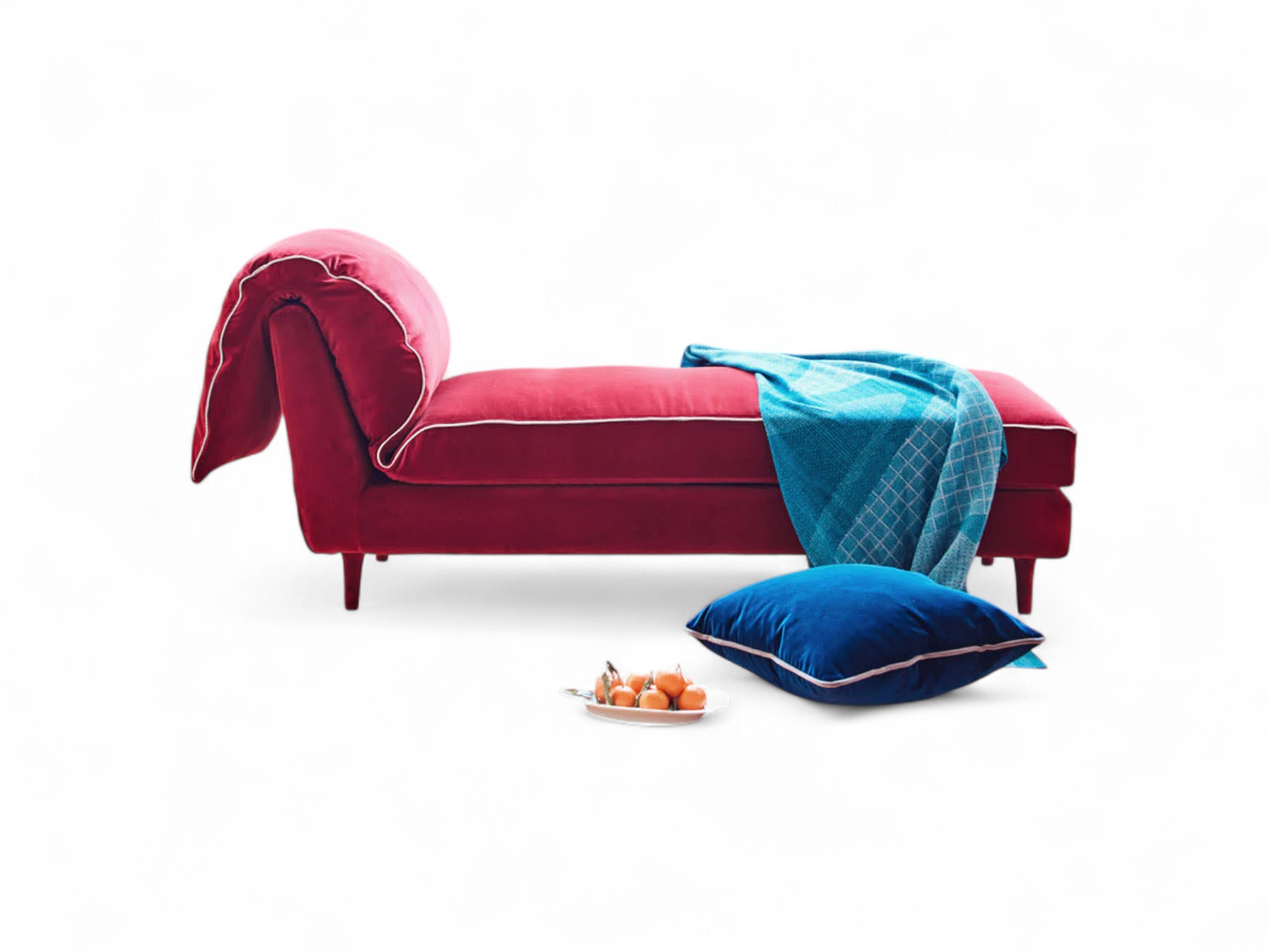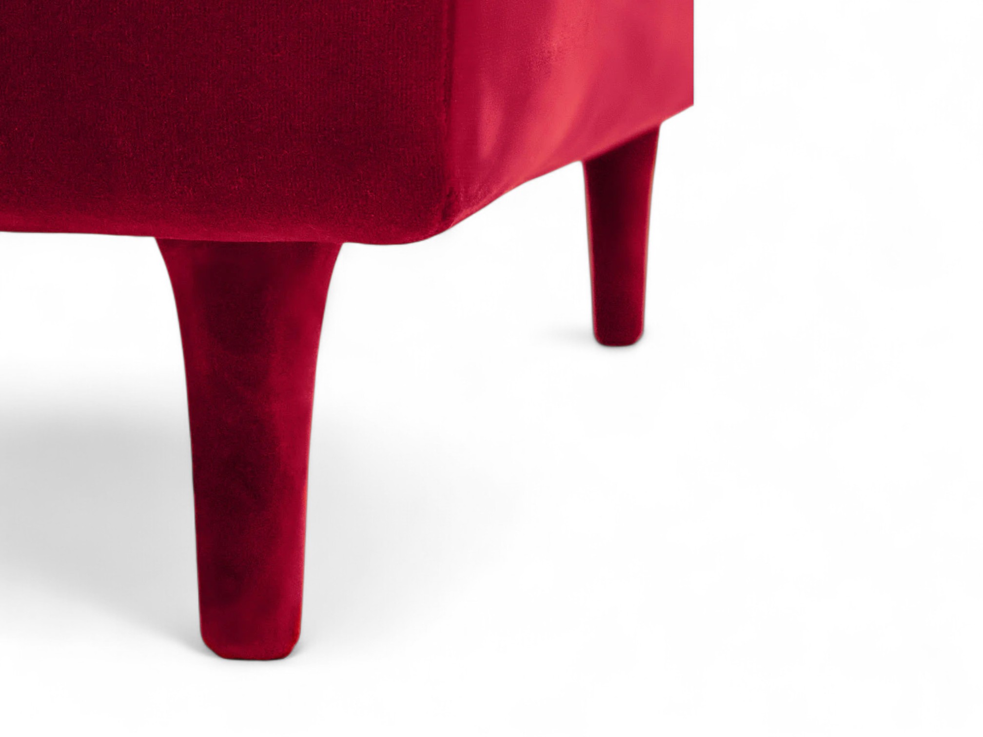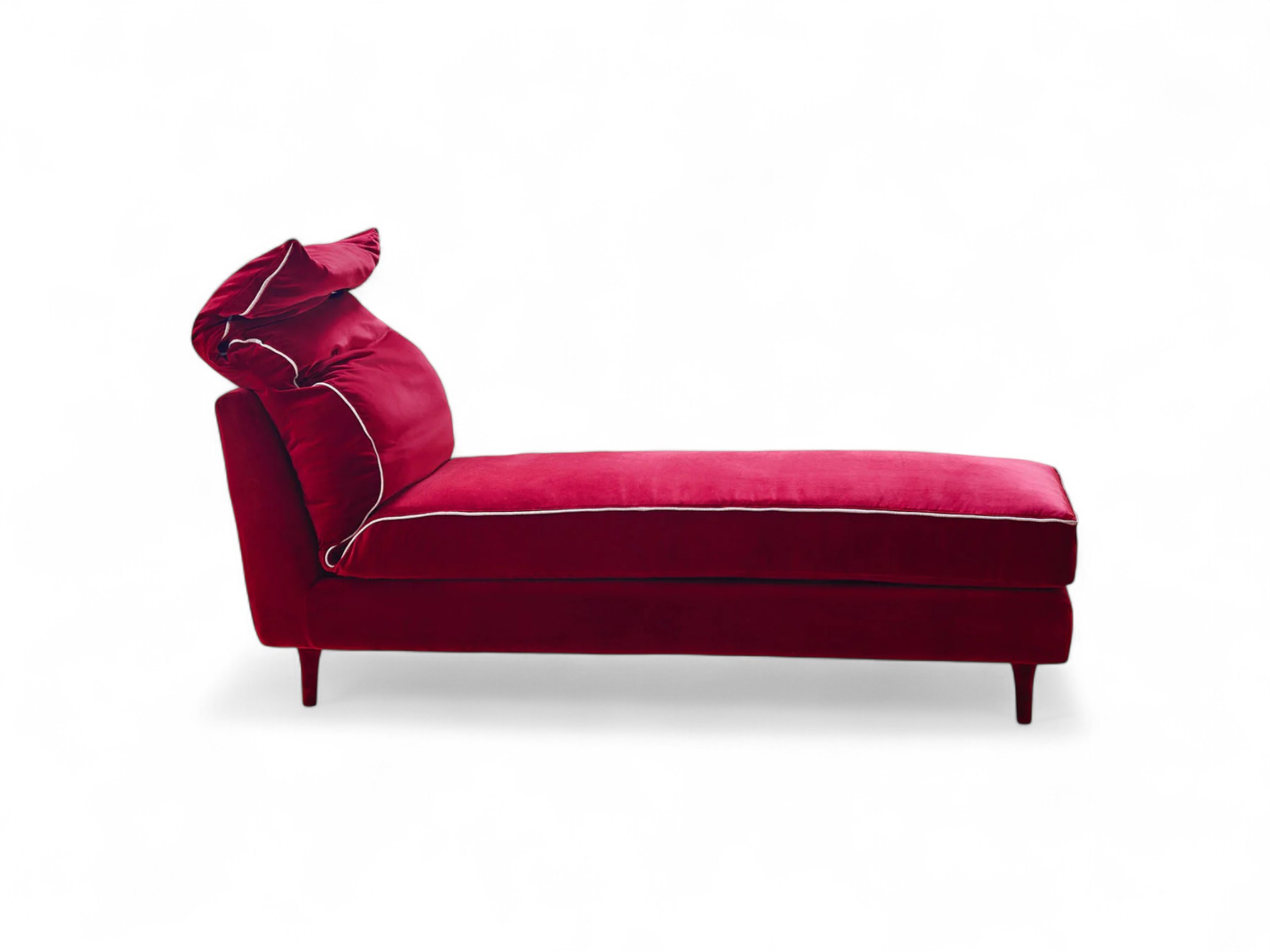 The Crimson Luxe Chaise Lounge is the epitome of modern sophistication and bold elegance. Upholstered in deep crimson velvet with delicate white piping, it strikes the perfect balance between luxury and minimalism. The slim tapered wooden legs provide a light, airy look, making it ideal for contemporary spaces.
