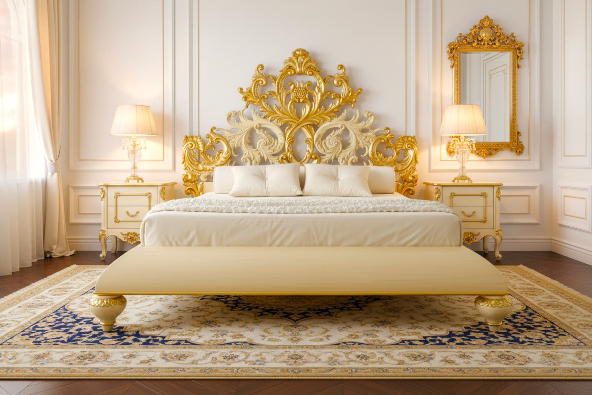 Ornate Grace Bed with white tufted headboard and gold carved frame