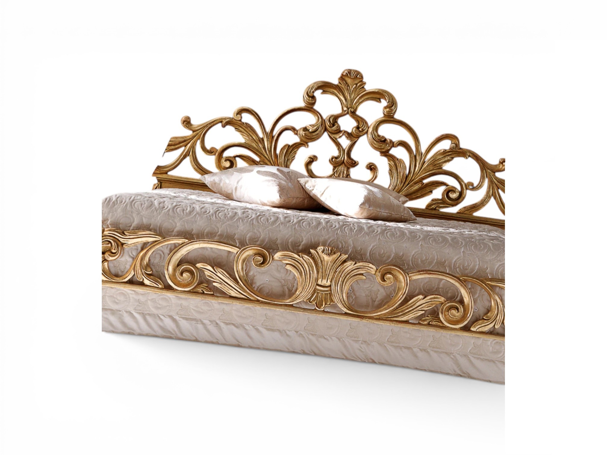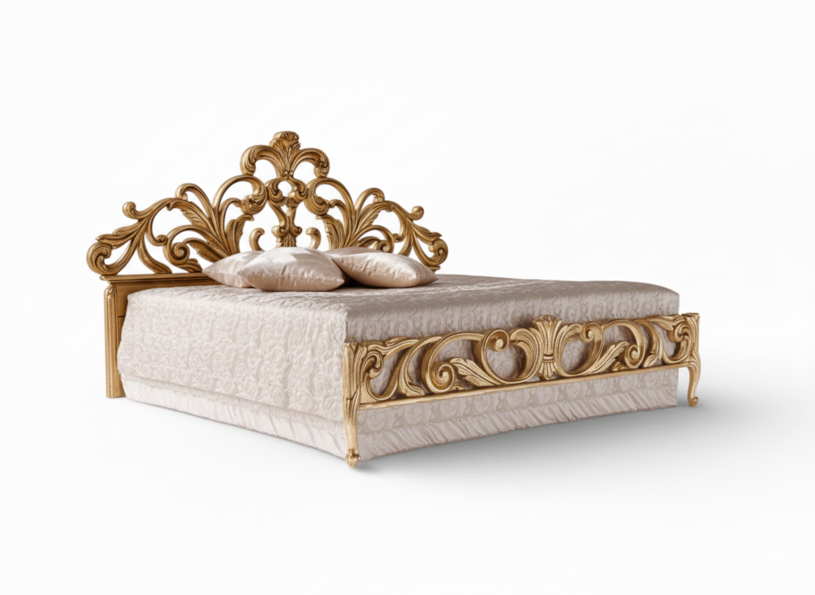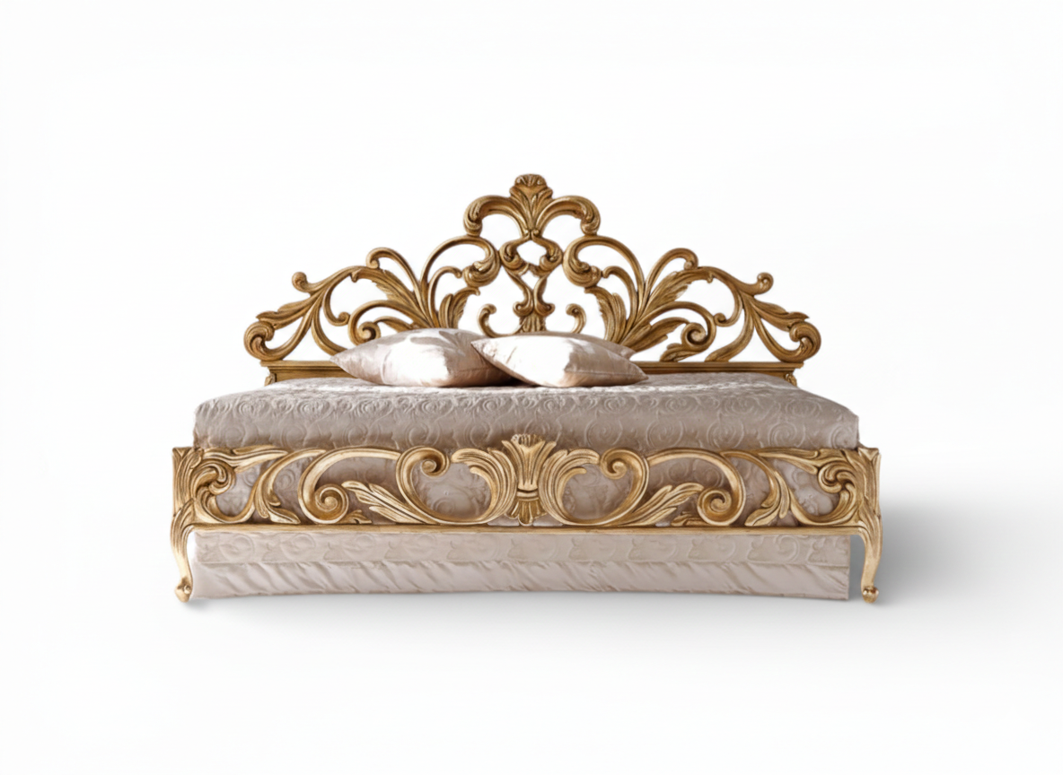 The Crowned Scroll Haven Bed showcases sculpted grandeur through its sweeping hand-carved scrollwork and richly gilded detailing. Its open ornamental headboard forms an artistic crown silhouette, while the bold carved base reinforces its palace-inspired character. Moreover, the Crowned Scroll Haven Bed commands attention with confident elegance, making it the centrepiece of distinguished master bedrooms and luxury residences.