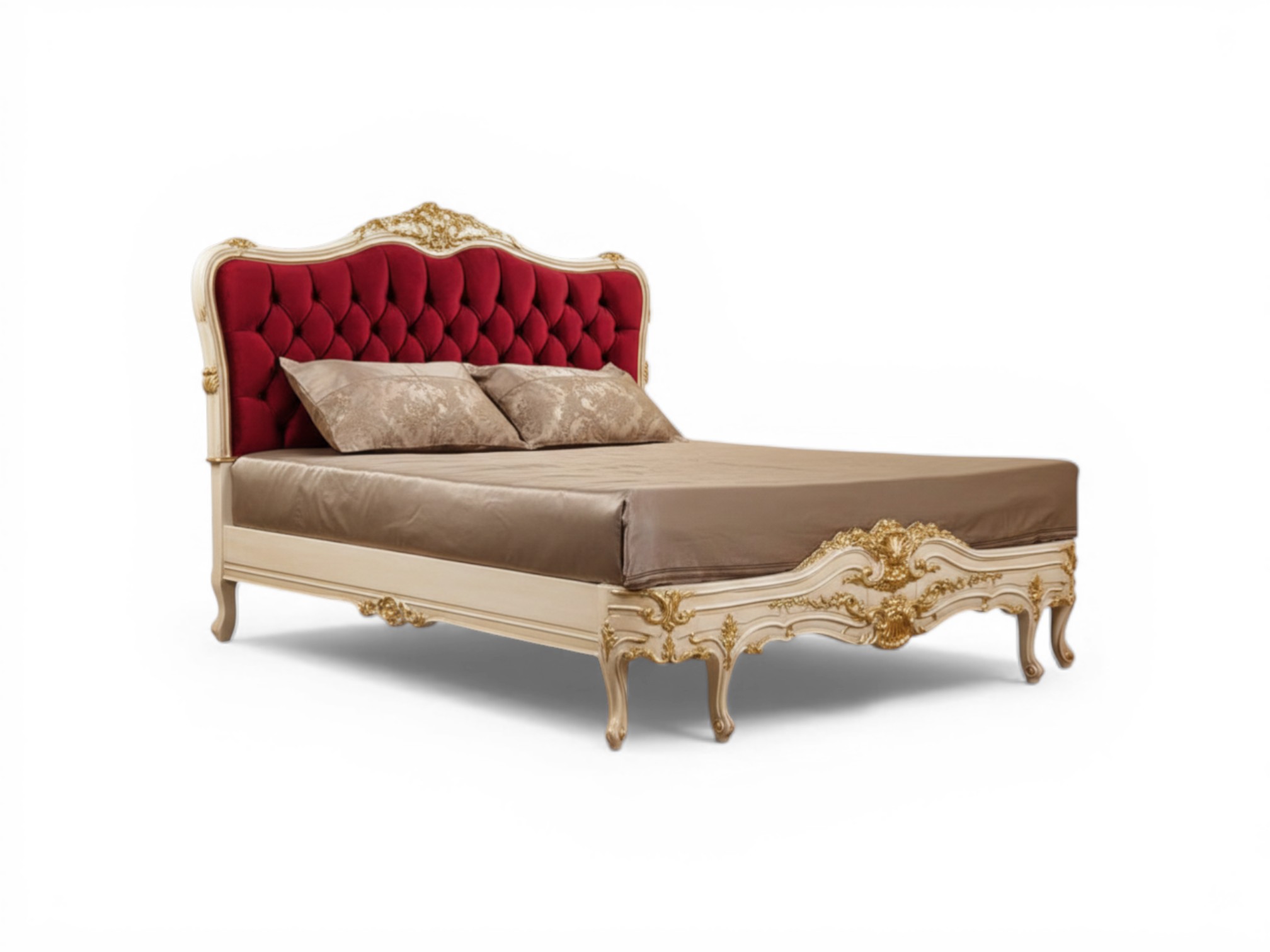 The Dolce Vita Bed captures the opulent essence of classic European luxury. Featuring a richly tufted red velvet headboard and an intricately hand-carved frame with gold-leaf accents, this bed reflects the elegance and passion of Italian craftsmanship. Its dramatic design offers a striking balance between boldness and refinement, making it the centrepiece of any sophisticated bedroom.