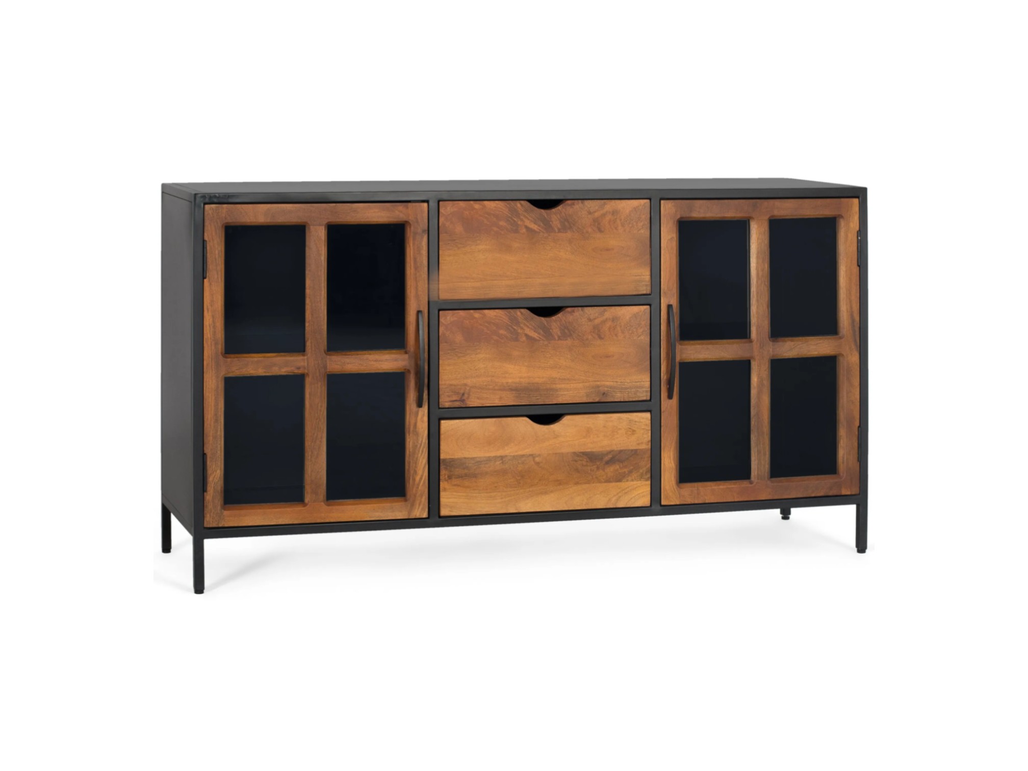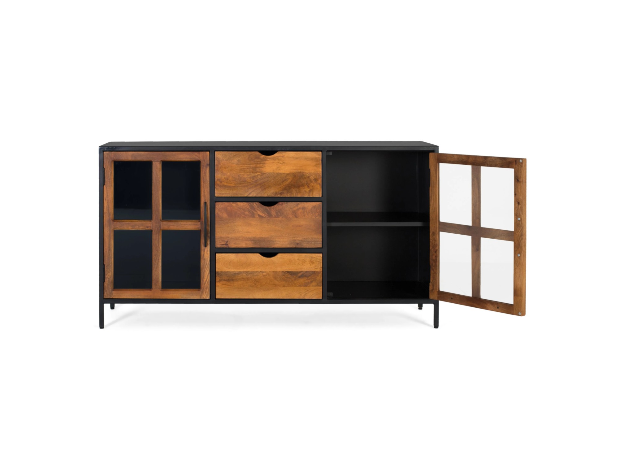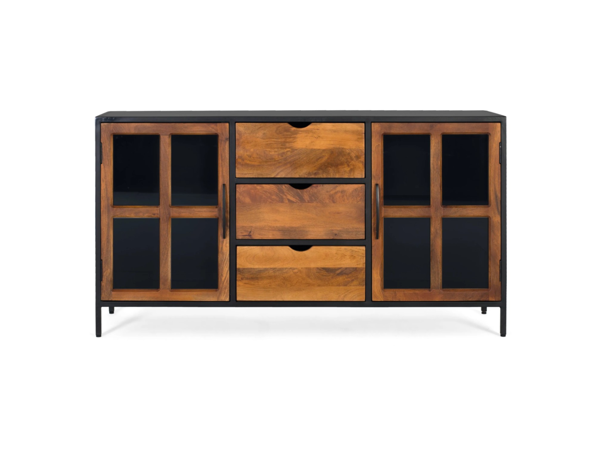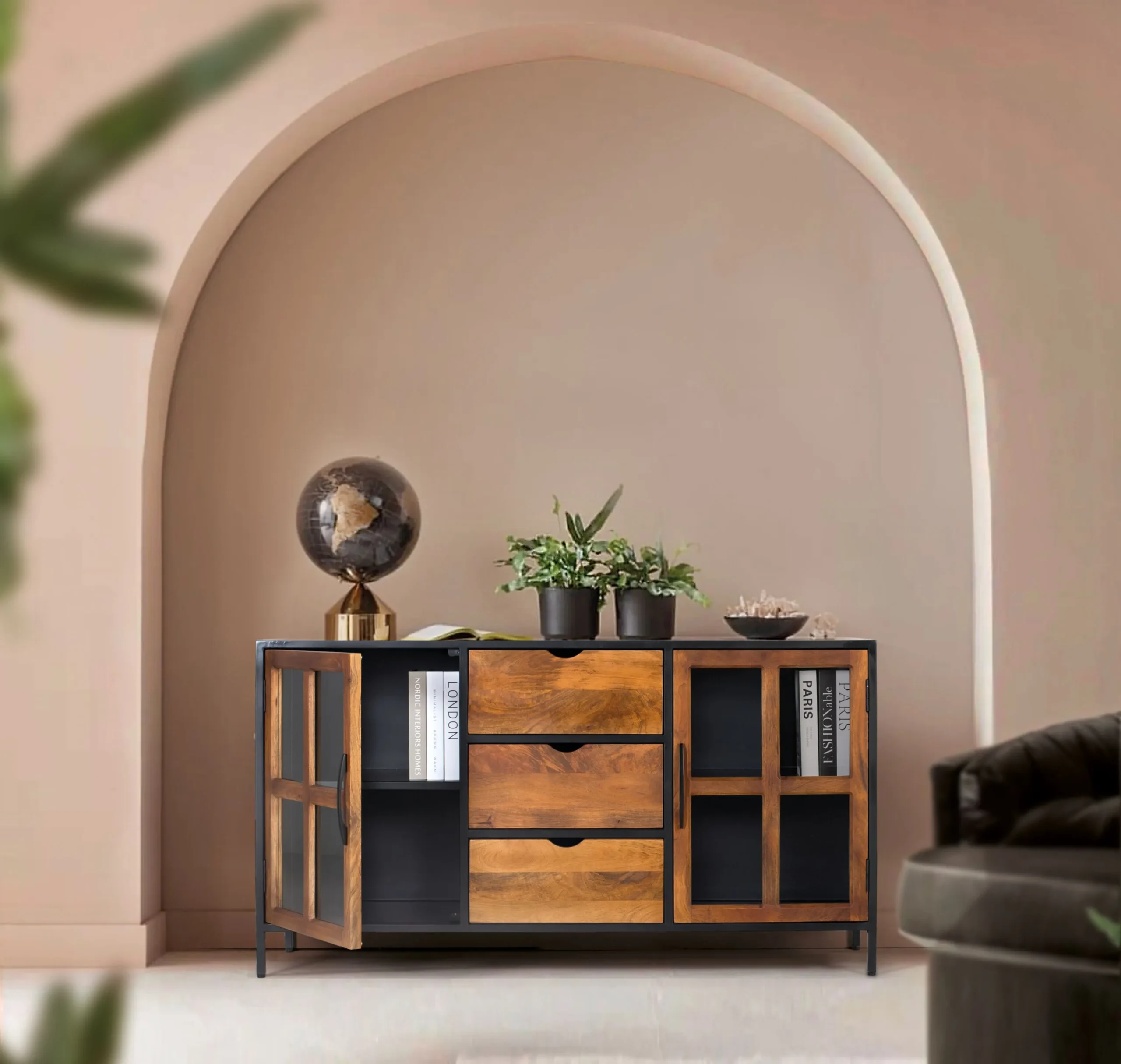 The Dusk Teak Sideboard blends modern simplicity with natural elegance, creating a refined storage solution for contemporary interiors. Crafted from rich teak wood, it showcases beautiful natural grain patterns that add warmth and character. Meanwhile, the sleek black frame provides a bold contrast, enhancing its modern industrial appeal. As a result, this sideboard becomes a striking focal point that complements both modern and transitional spaces.