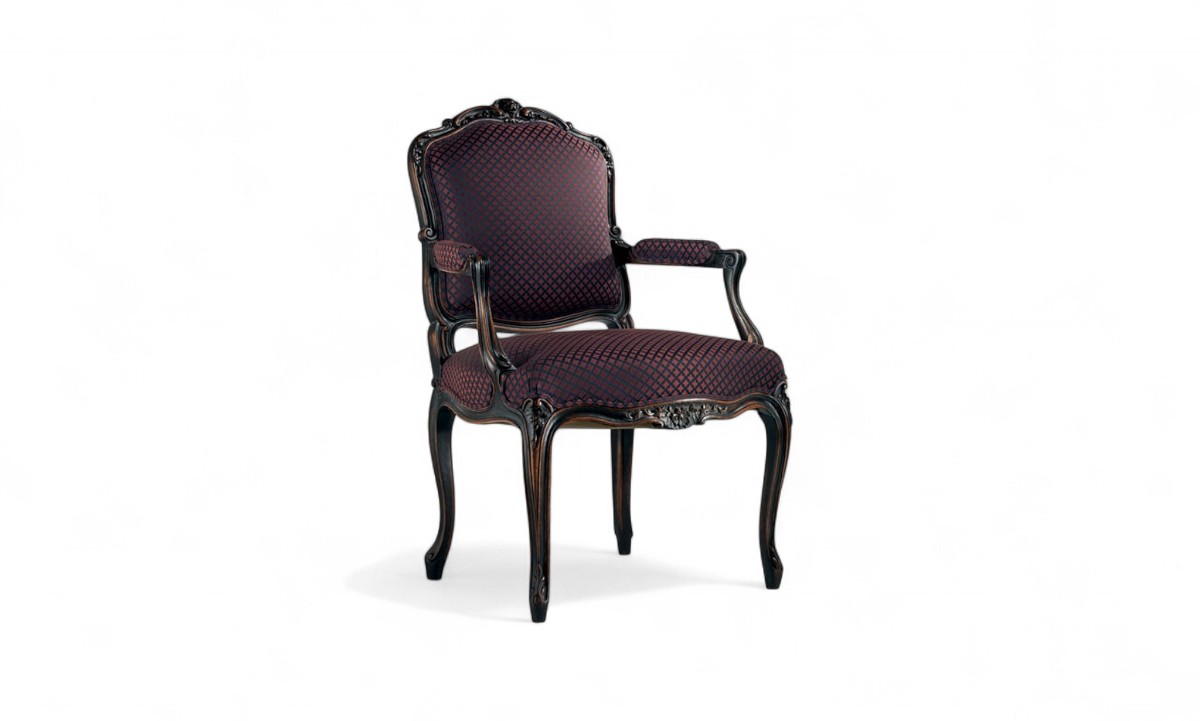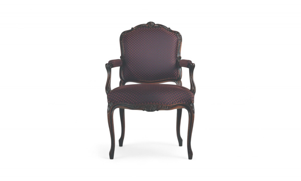 Design: Classic armchair with ornate wooden frame and rich upholstery.