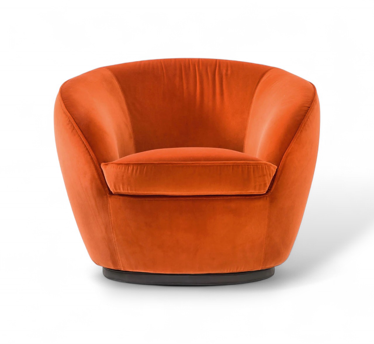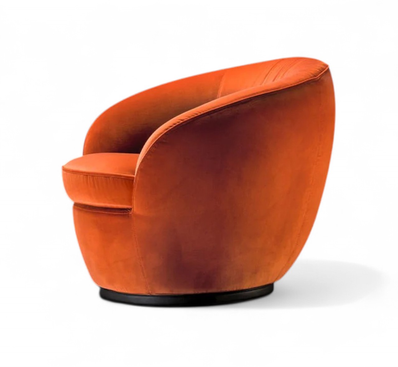 The Ember Lounge Chair introduces a bold and contemporary energy to any space. Upholstered in vivid burnt orange velvet, its sculptural silhouette embraces comfort with a wide seat and wraparound backrest. The smooth swivel base adds functionality without compromising on aesthetics, making it a striking accent for modern interiors.