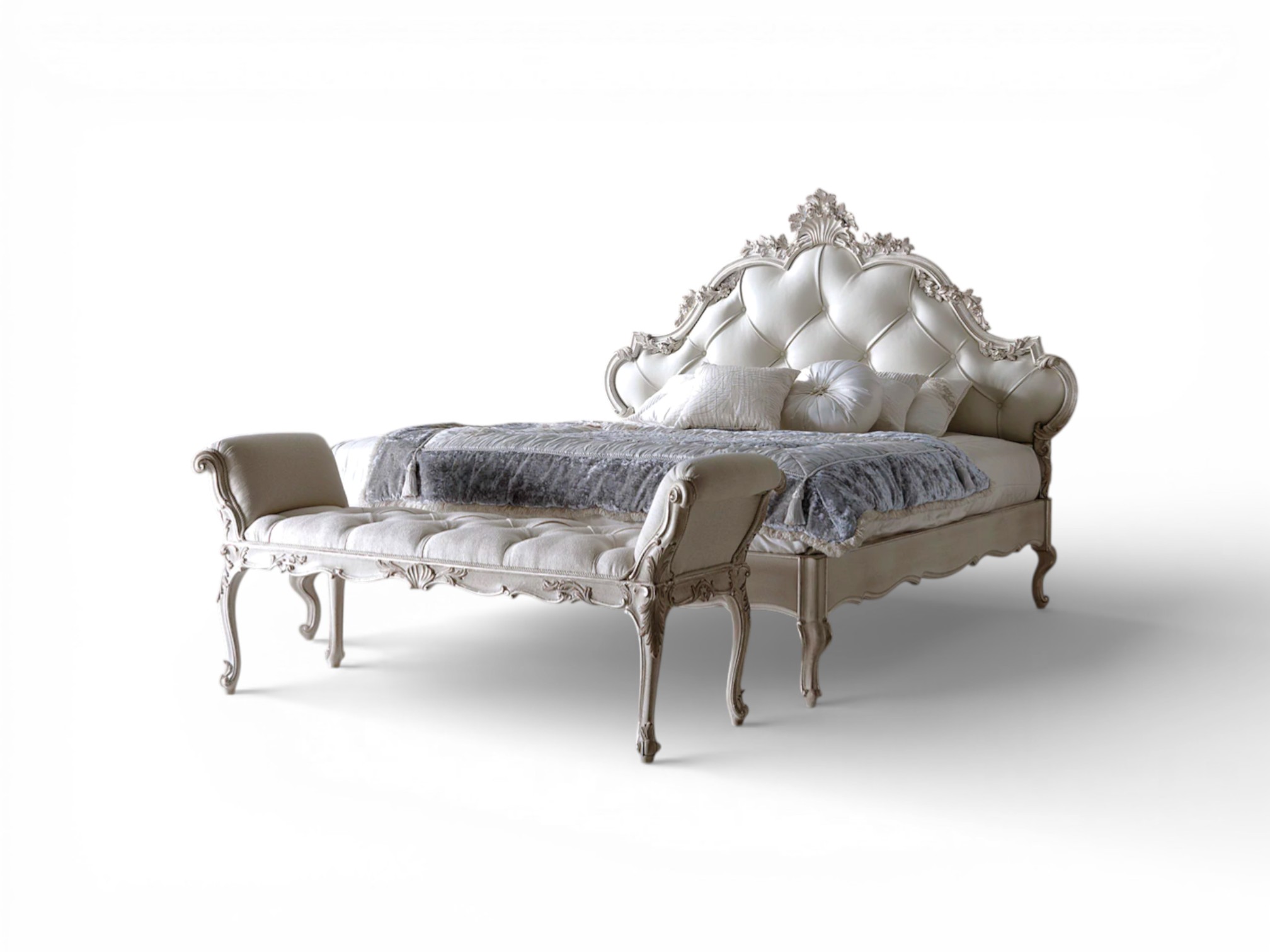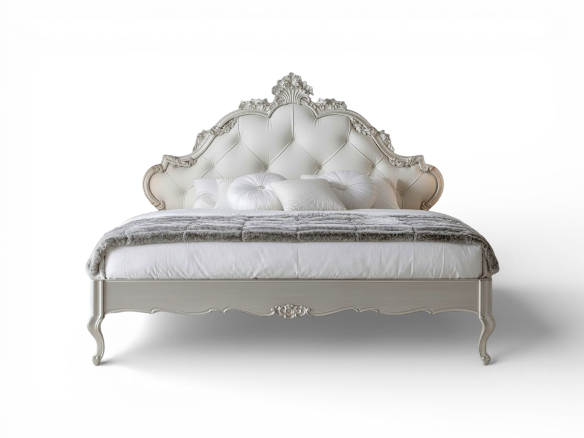 Skilled artisans craft this masterpiece from premium solid hardwood and finish it with delicate carved detailing along the frame and crest. The gracefully curved footboard complements the dramatic headboard, creating harmonious symmetry and elevated presence. In addition, the generously padded headboard provides superior comfort while maintaining its stately profile, making it ideal for luxury villas, palace-inspired interiors, and refined master suites.