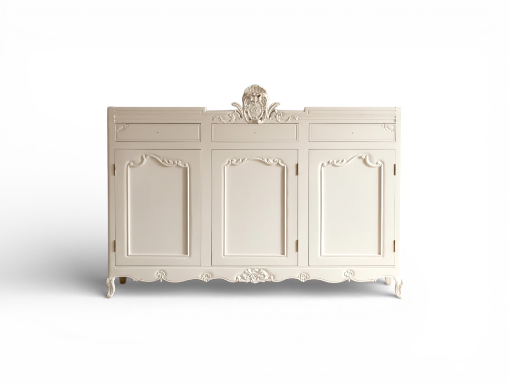 Florentia Carved Sideboard embodies refined European elegance with its sculpted crest, panelled doors, and delicately carved apron detailing. Designed to elevate classic interiors, it introduces graceful symmetry while offering concealed storage for dining essentials, décor accents, or curated tableware. Its balanced proportions and heritage-inspired craftsmanship make it ideal for luxury dining rooms and formal living spaces.