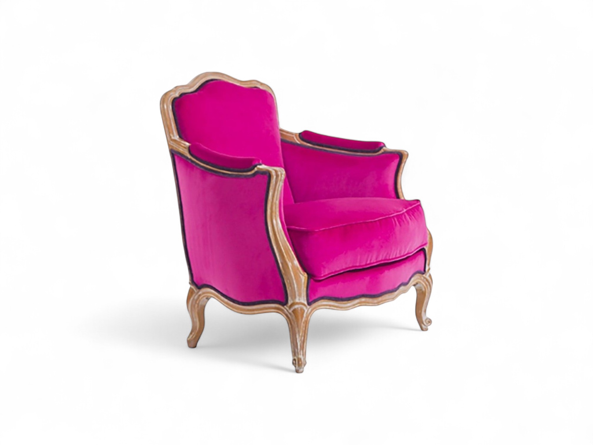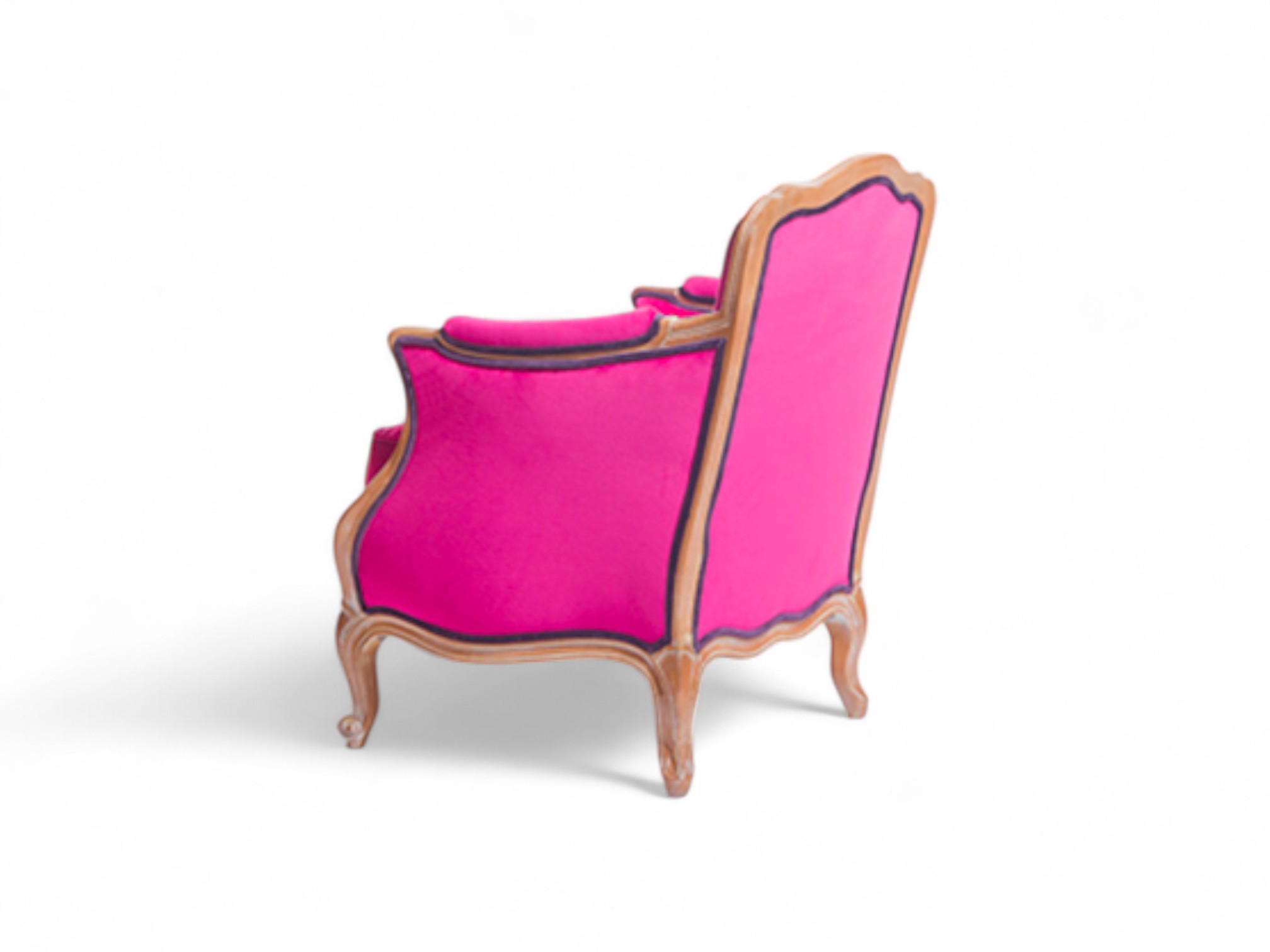 The Fuchsia Elegance Accent Chair adds a bold, vibrant statement to any space. Upholstered in luxurious fuchsia velvet, this chair features a refined, vintage-inspired design with curvaceous lines and intricate wooden detailing. Its plush cushioning offers a sophisticated yet inviting spot to relax, blending modern luxury with classic charm. Ideal for accentuating contemporary lounges or adding a pop of colour to your living room, this chair enhances both comfort and style.
