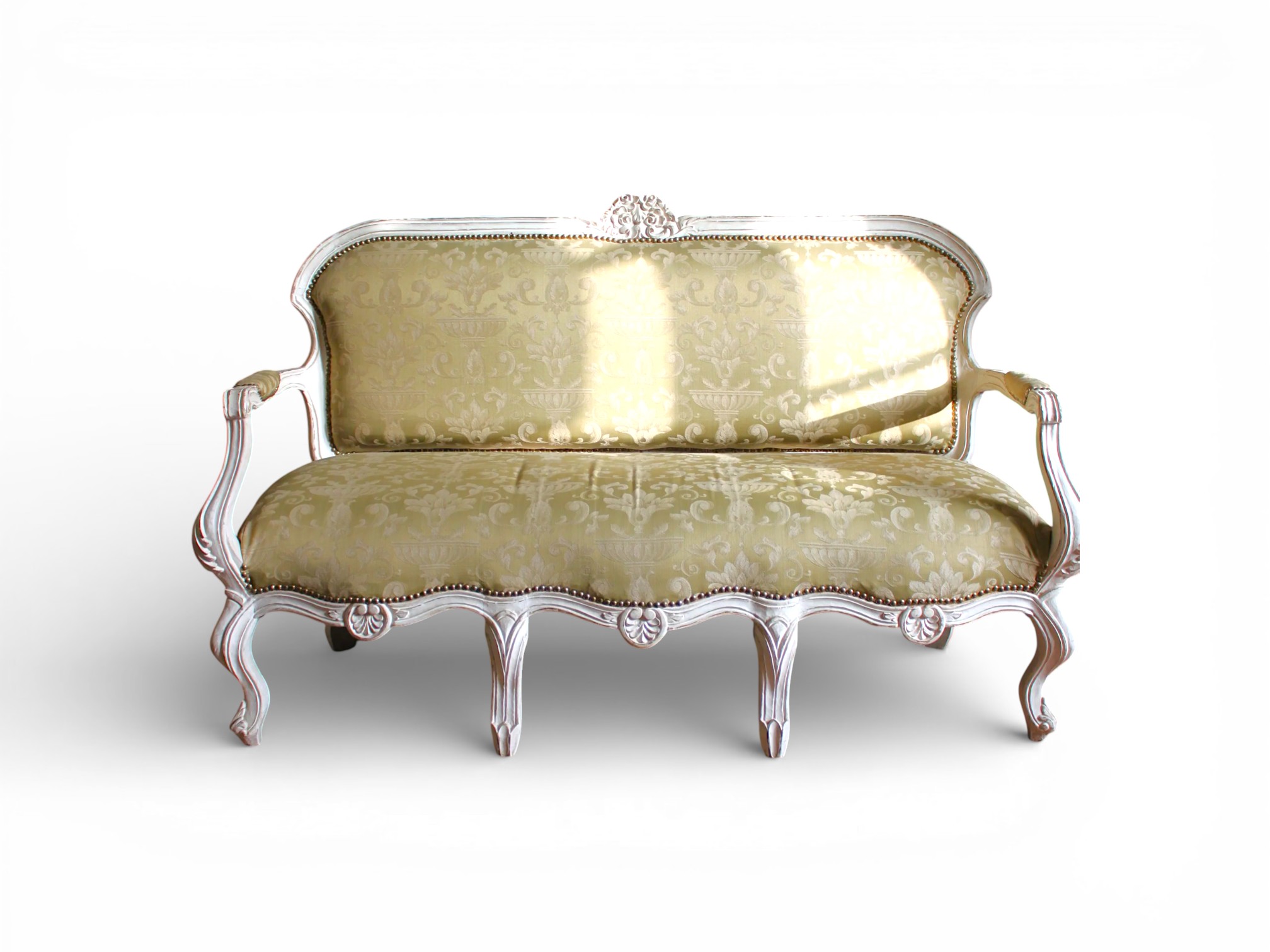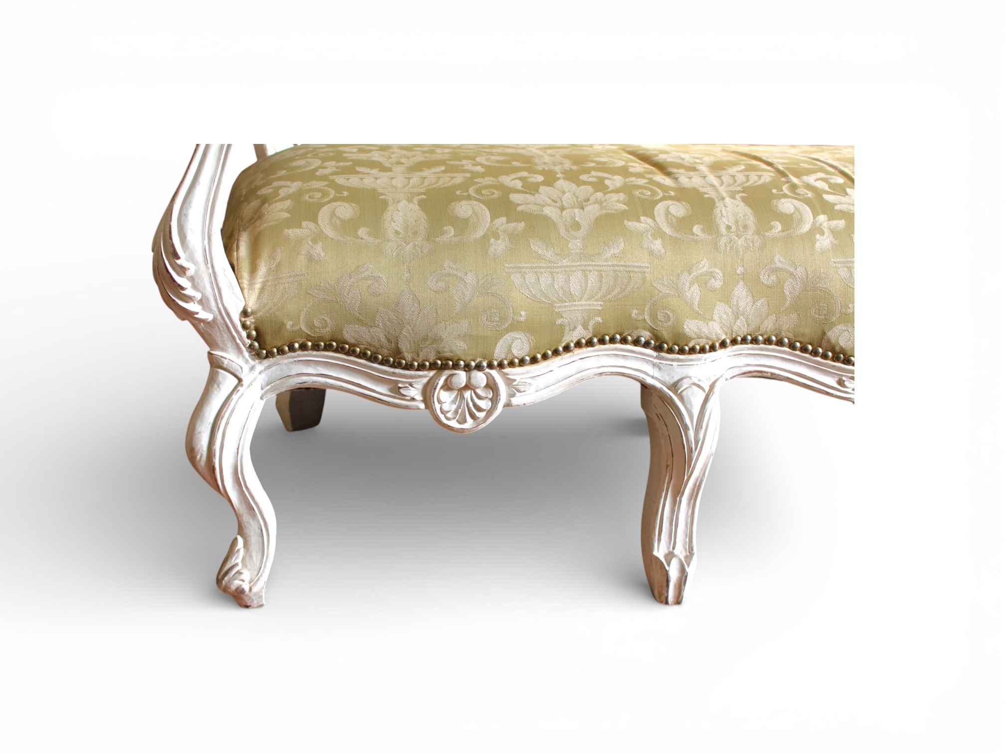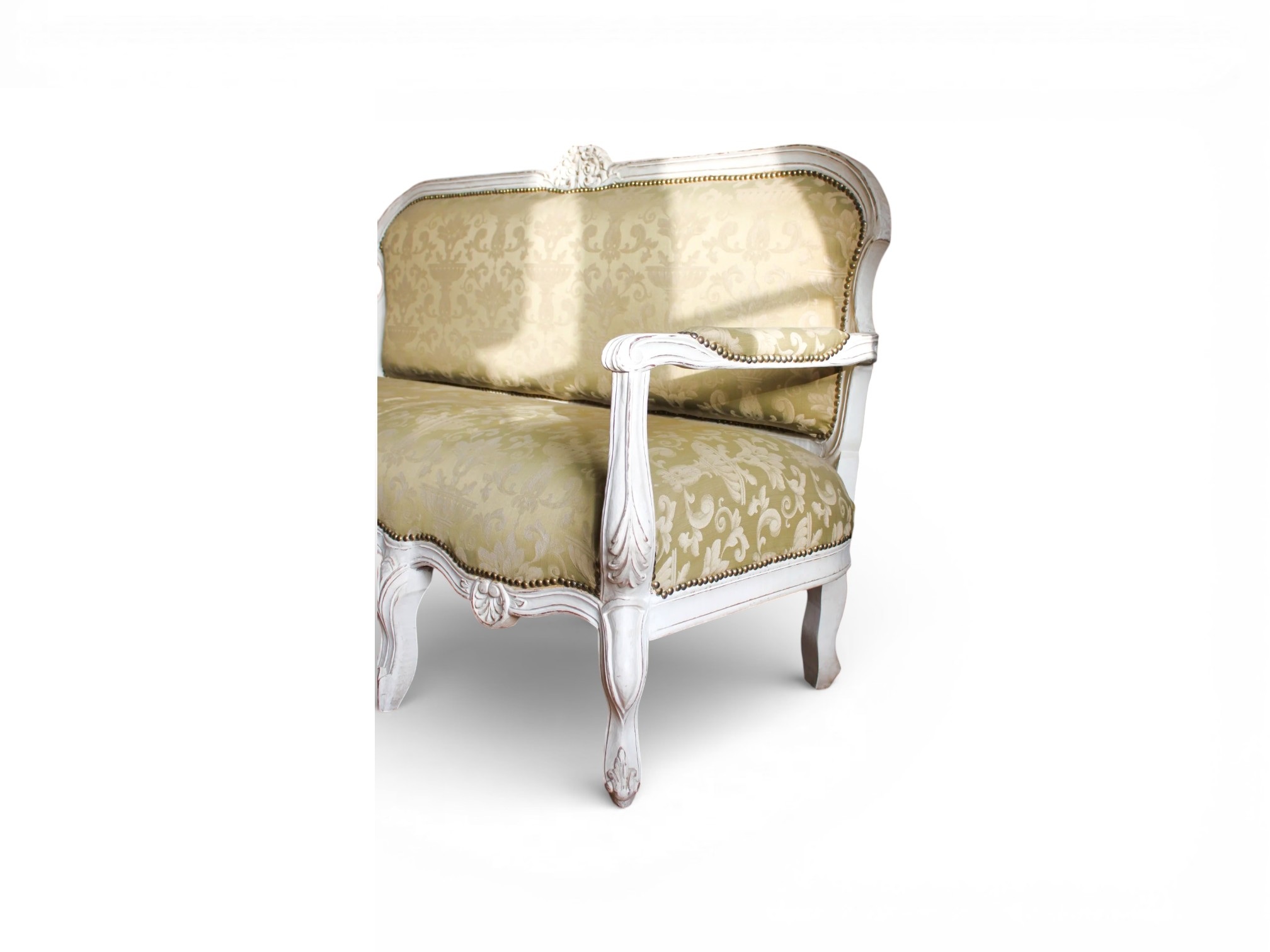 The Goldleaf Jacquard Lounge embodies timeless sophistication with its refined silhouette and luxurious upholstery. The elegant jacquard fabric showcases intricate patterns that enhance the sofa’s regal character. Meanwhile, the beautifully carved wooden frame finished in soft antique white highlights its graceful curves and classic detailing. As a result, this lounge becomes a stunning centrepiece that elevates elegant living spaces.