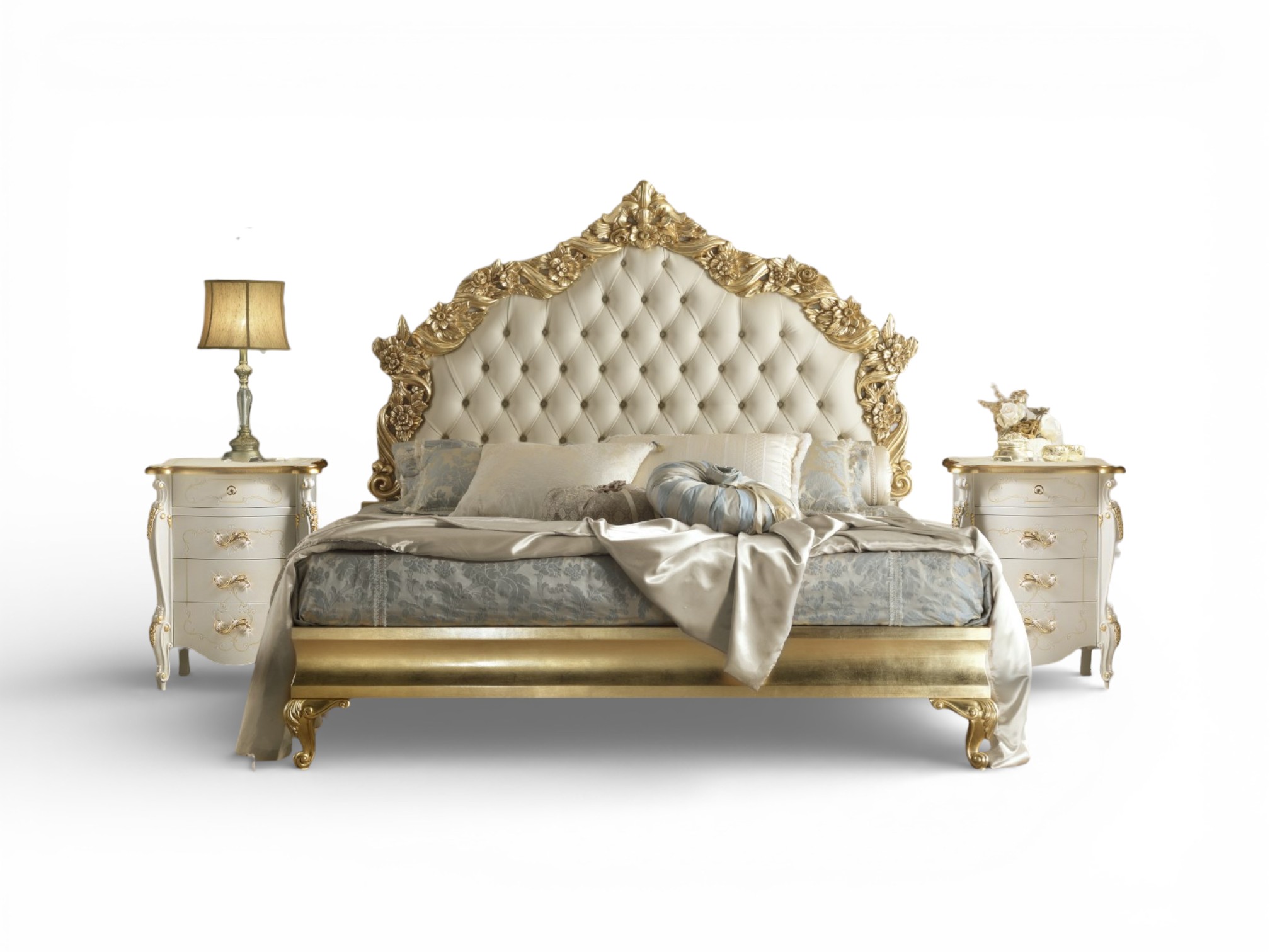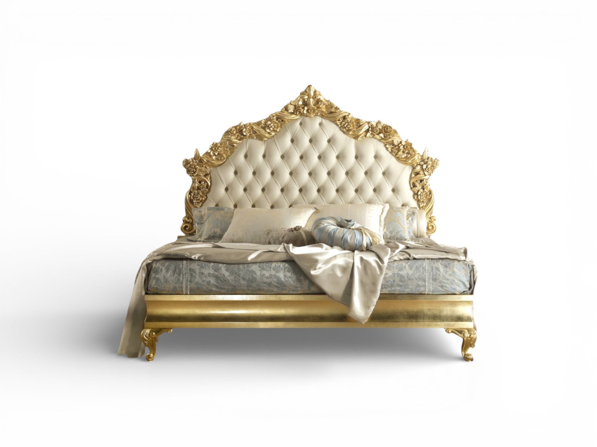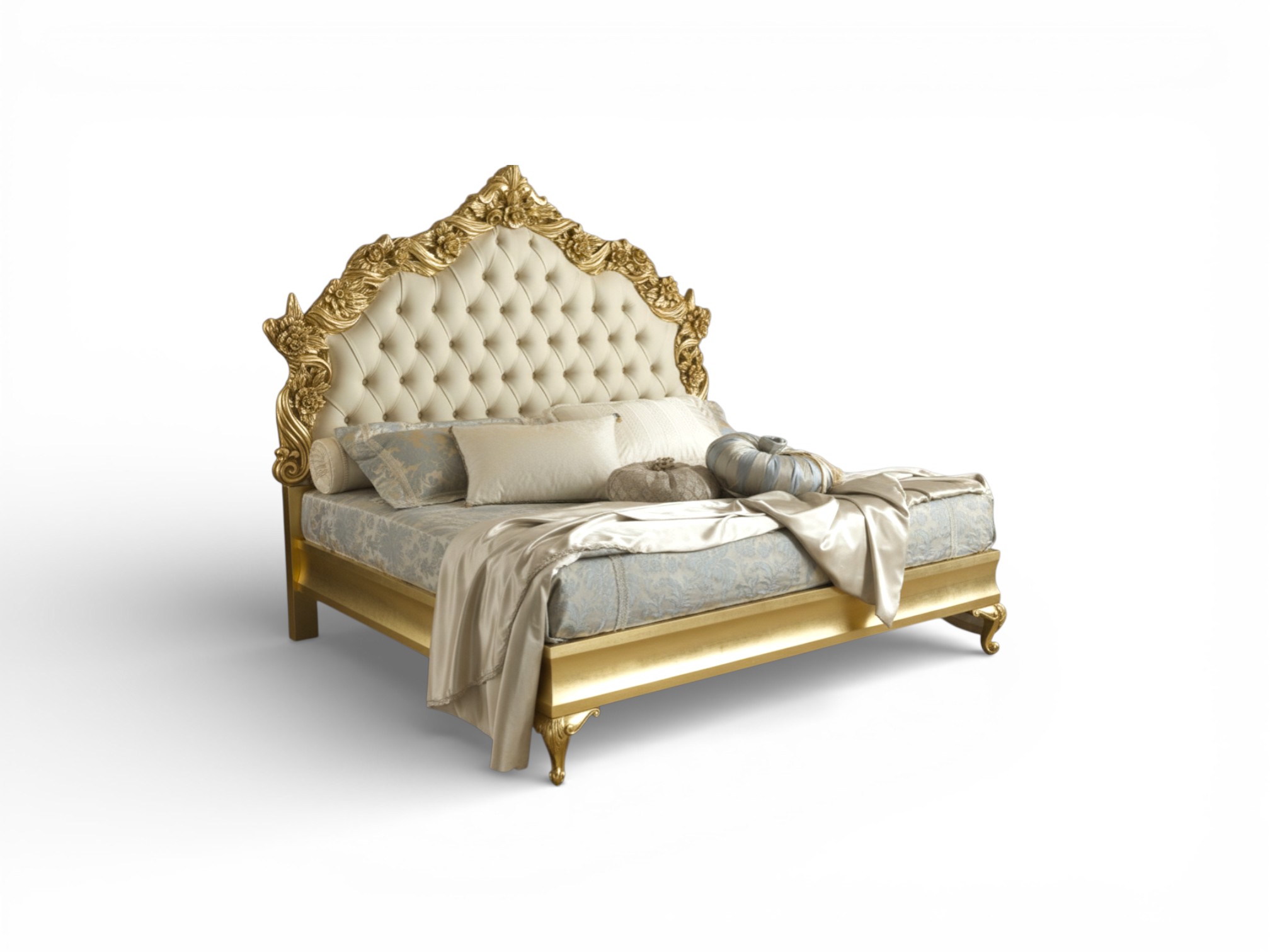 Grand Crown Bed embodies regal magnificence with its towering tufted headboard, sculpted gold floral carvings, and commanding crown silhouette. Designed to create a palace-inspired sanctuary, it blends soft upholstered elegance with bold ornamental detailing, instantly transforming the bedroom into a space of grandeur and refined sophistication. The intricate craftsmanship and symmetrical crest establish a powerful focal point suited for ultra-luxury interiors.