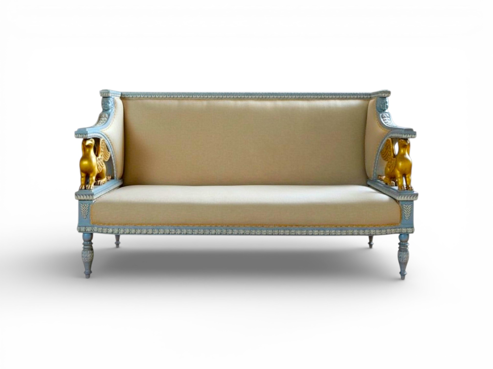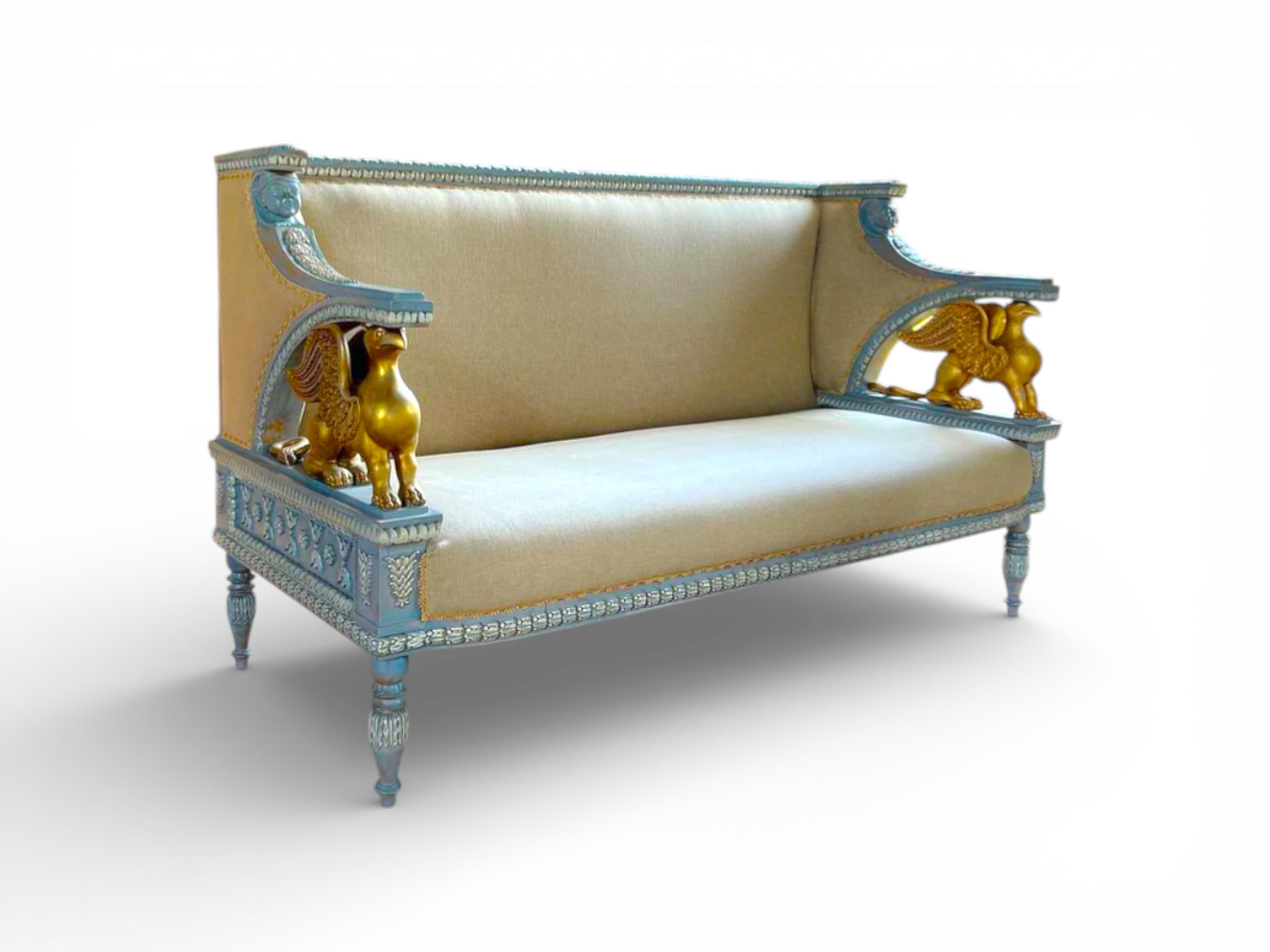 The Griffin Majesty Settee captures the essence of neoclassical artistry, with its bold golden griffin sculptures guarding each armrest and a finely carved wooden frame. Upholstered in refined neutral fabric, it balances dramatic ornamentation with understated elegance, creating a piece that radiates both strength and refinement. The Griffin Majesty Settee is more than furniture — it is a symbol of grandeur designed to elevate any luxury interior.