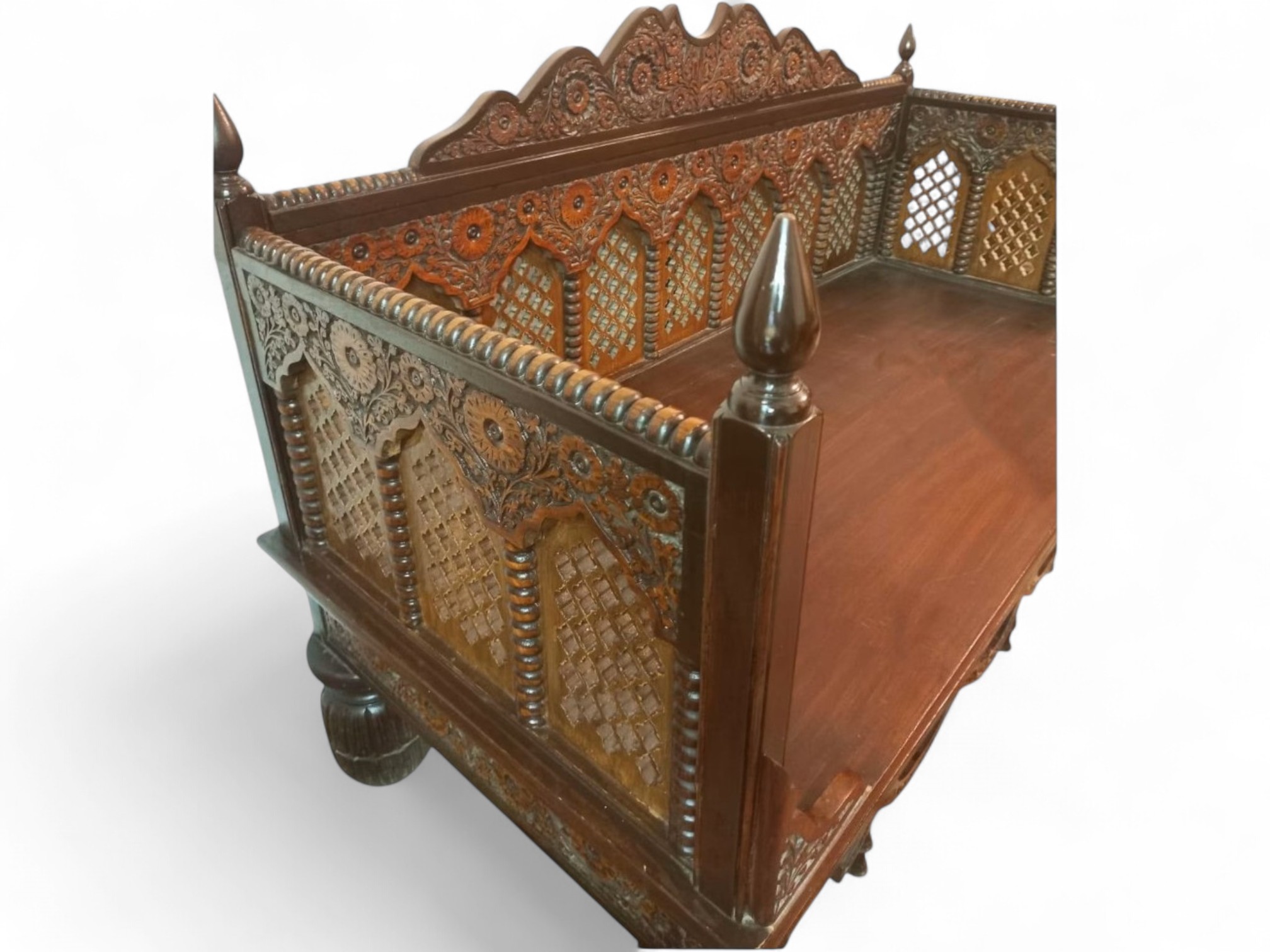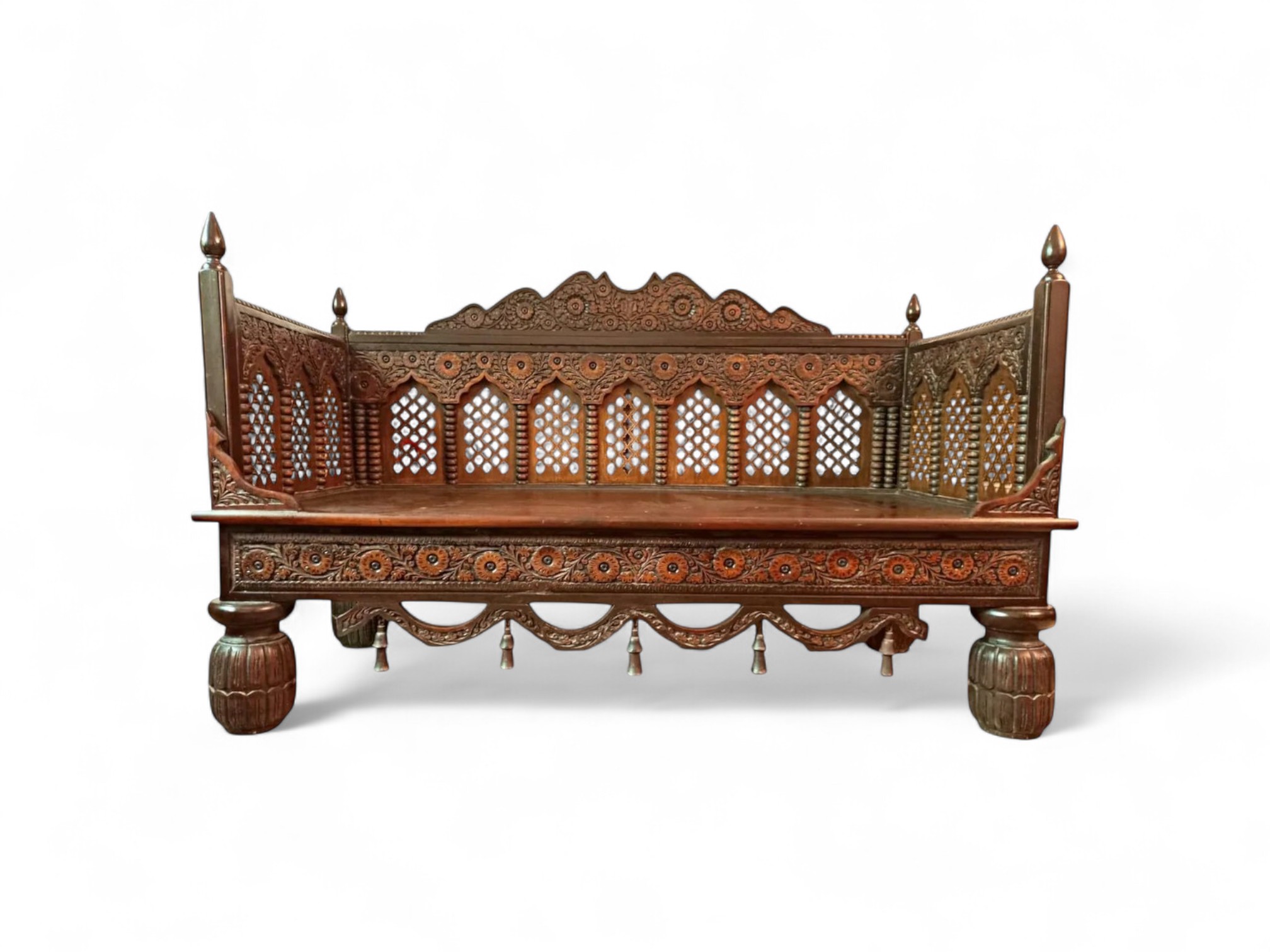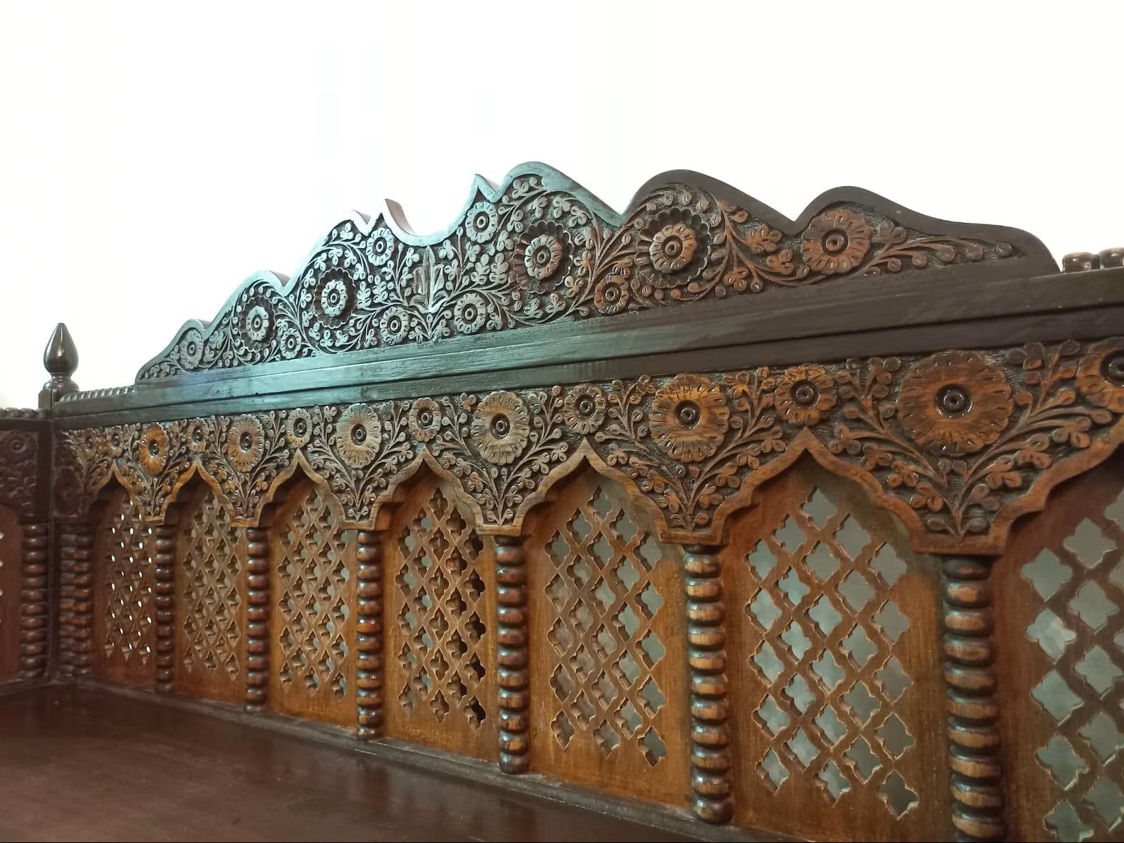 Design: Traditional handcrafted divan with intricate wood carvings and an openwork backrest