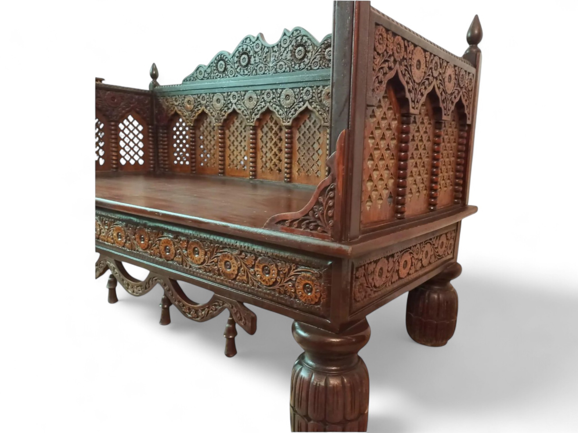 The warm wood tones and detailed carvings emphasise its regal charm, making it an ideal addition to living rooms, entryways, or cultural-themed spaces. The Heritage Wooden Divan embodies a rich heritage while offering inviting comfort for a cosy seating experience.