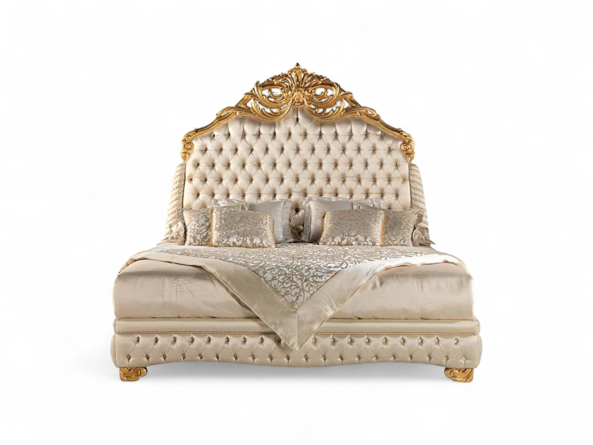 The Imperial Majesty Bed features a tufted high-back design crowned with intricate carvings, offering both majestic style and exceptional comfort. Designed for those who appreciate refined details, it transforms any space into a royal retreat.