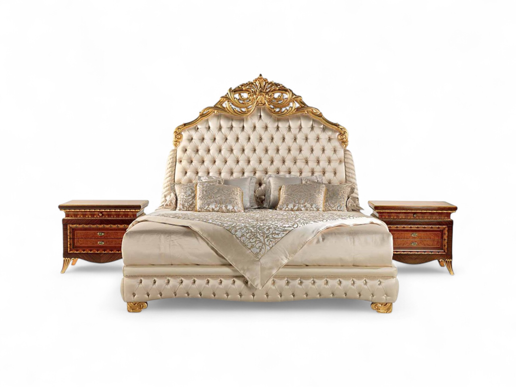 The Imperial Majesty Bed embodies timeless grandeur with its ornate headboard, rich upholstery, and regal gold accents. This luxury bed exudes opulence, making it a centrepiece fit for the most elegant bedrooms.