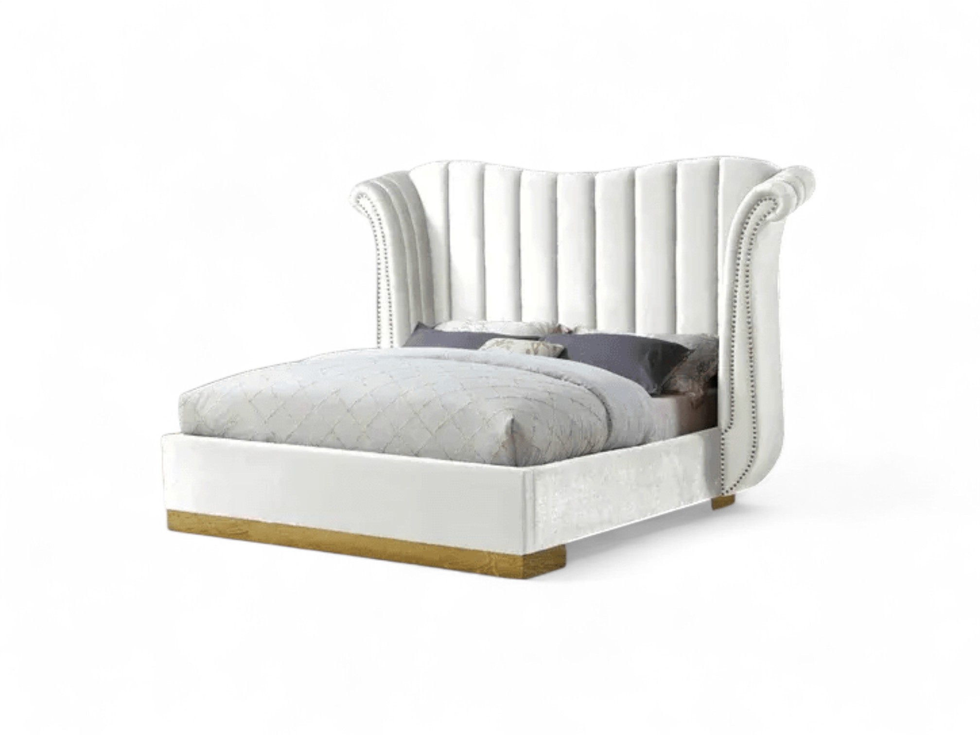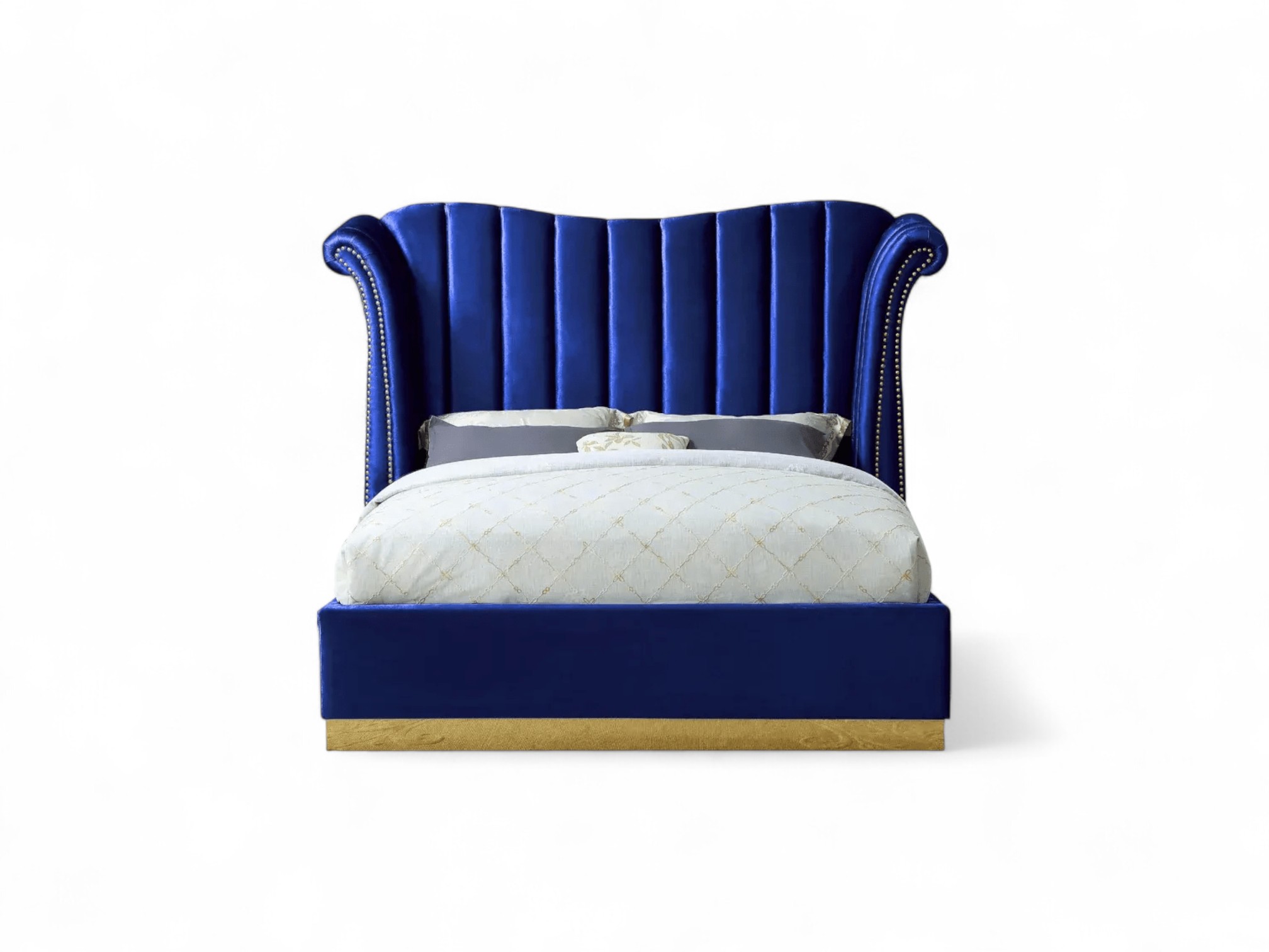 The Imperial Sapphire Bed brings a bold blend of sophistication and grandeur to any bedroom. Wrapped in deep blue velvet, it commands attention with a tall, tufted headboard and sculpted wingback sides lined with polished brass studs. As a result, it becomes a regal focal point that balances dramatic flair with refined design.