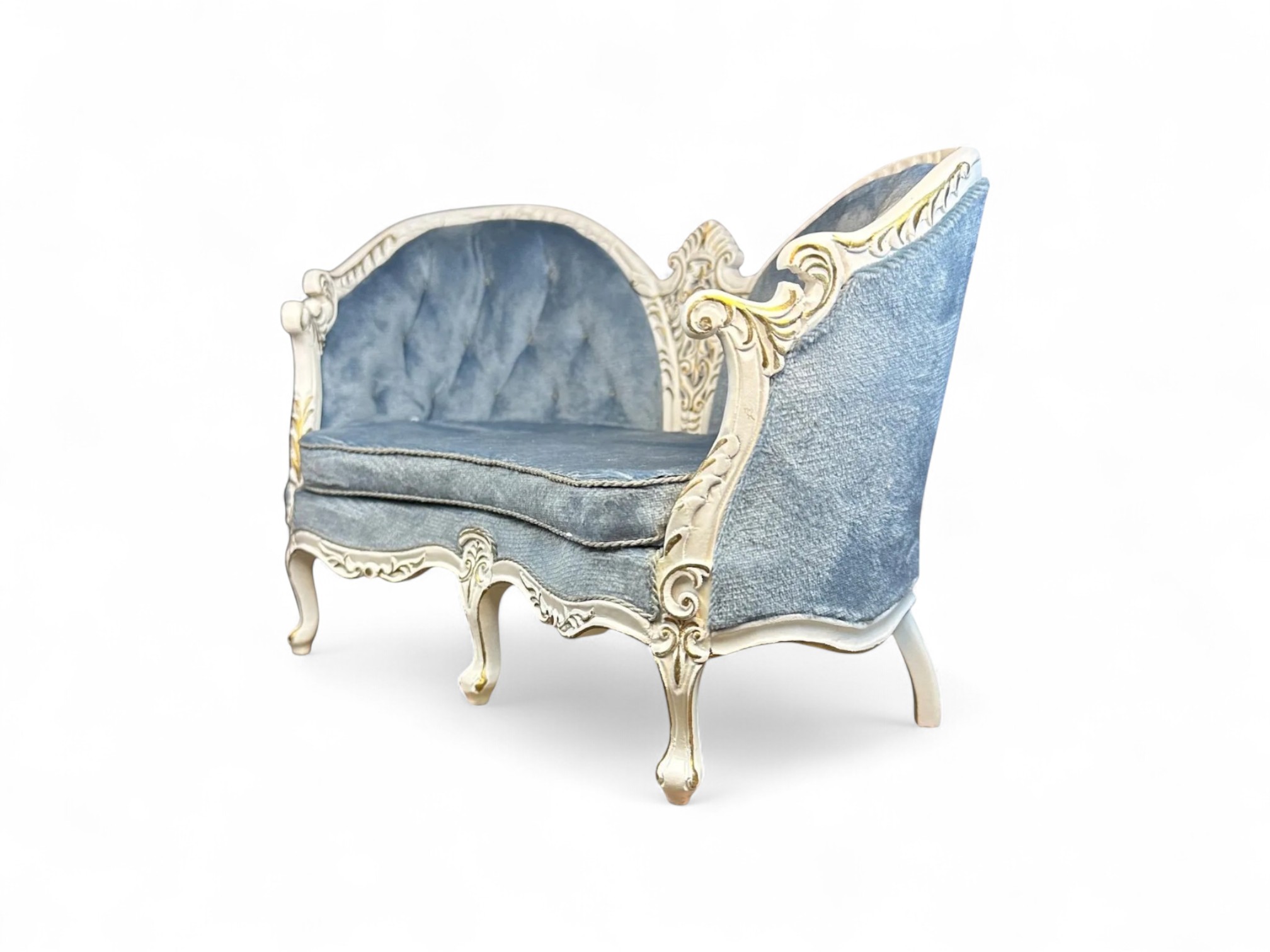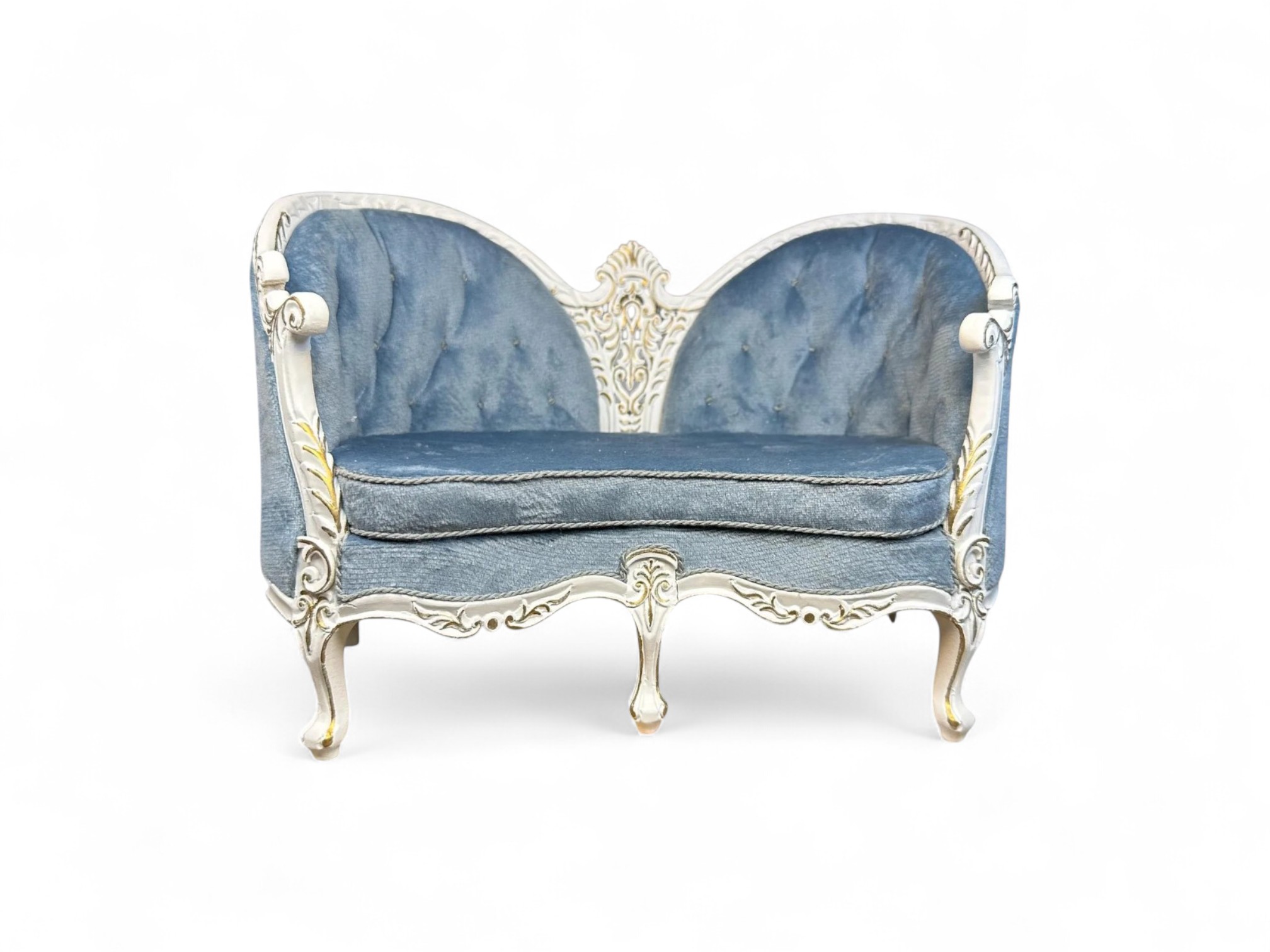 The Imperial Victorian Loveseat is upholstered in soft blue tufted fabric. This loveseat radiates charm and sophistication. Its compact yet regal presence makes it ideal for intimate seating arrangements, reception areas, or as a statement piece in luxury living rooms. With its refined balance of elegance and comfort, it transforms any setting into a space of distinction.