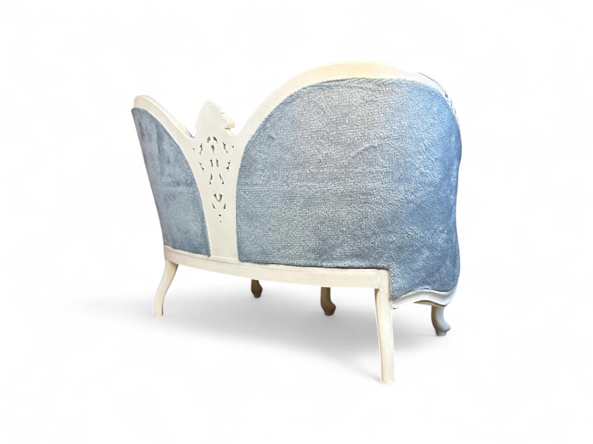 Aqua Elegance French Sofa with carved wooden frame and velvet upholstery