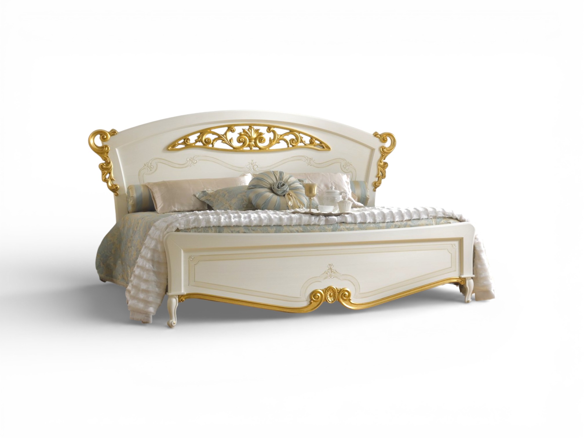 The Italian Leaf Carved Bed is a regal statement of classical opulence and timeless European craftsmanship. With its gracefully arched headboard adorned in gold leaf accents and intricate hand-carved details, this bed evokes the elegance of antique French palaces. Finished in an ivory lacquer with gold embellishments, it offers a luxurious blend of sophistication and warmth—perfect for interiors that embrace refinement and drama.