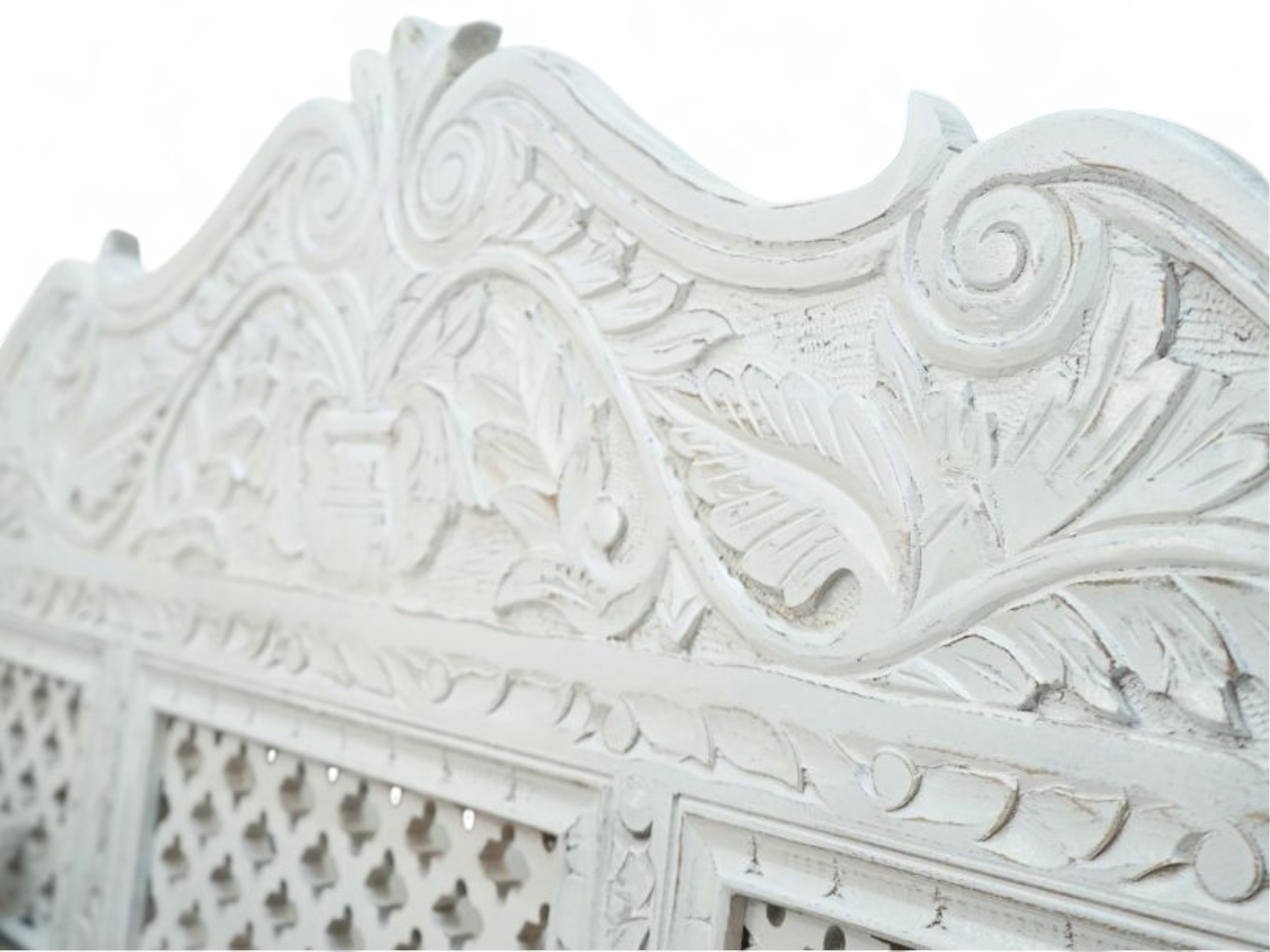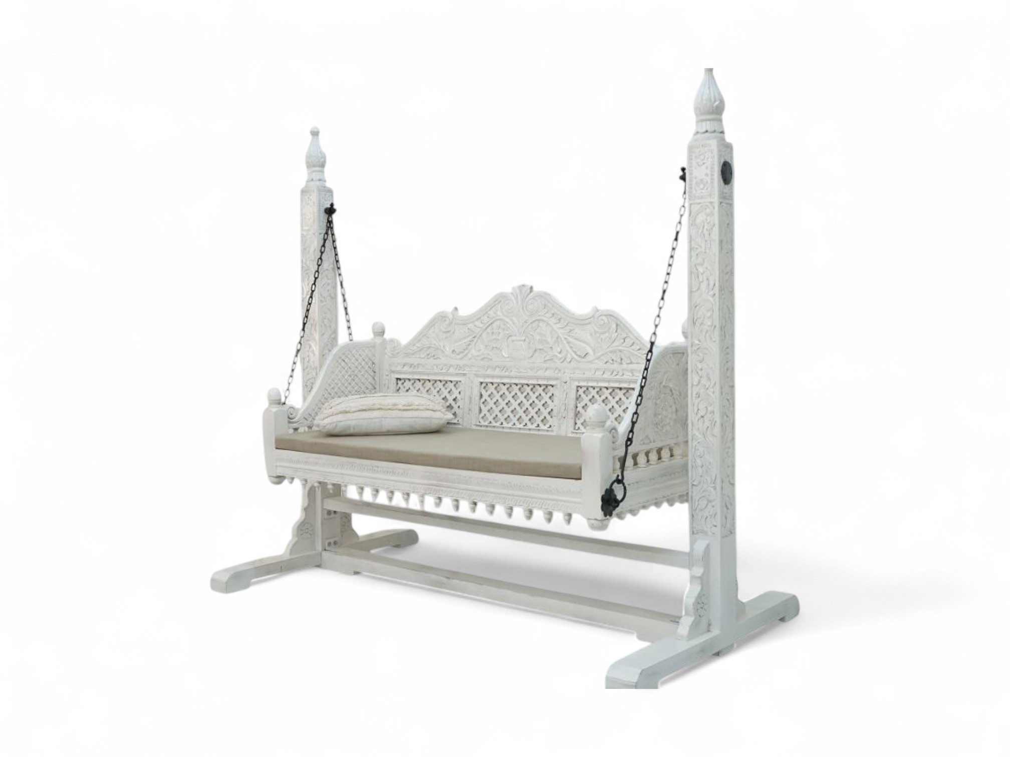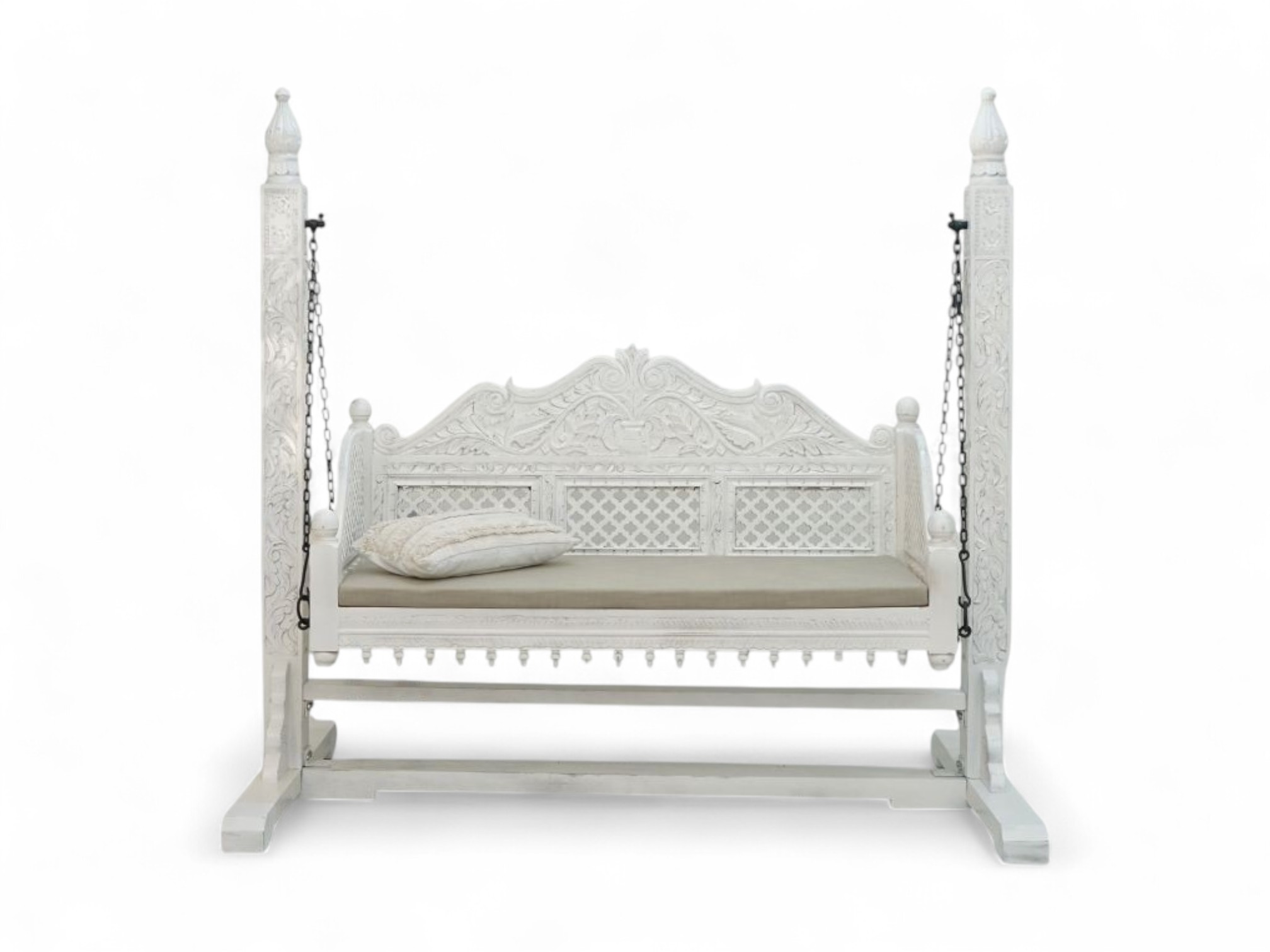 The Ivory Elegance Swing is a masterpiece of traditional craftsmanship and refined design. Handcrafted from solid wood, this swing showcases detailed floral carvings, latticework, and tall finials. Its pristine white finish gives the Ivory Elegance Swing a bright, airy charm — perfect for adding elegance to both modern and classic interiors.