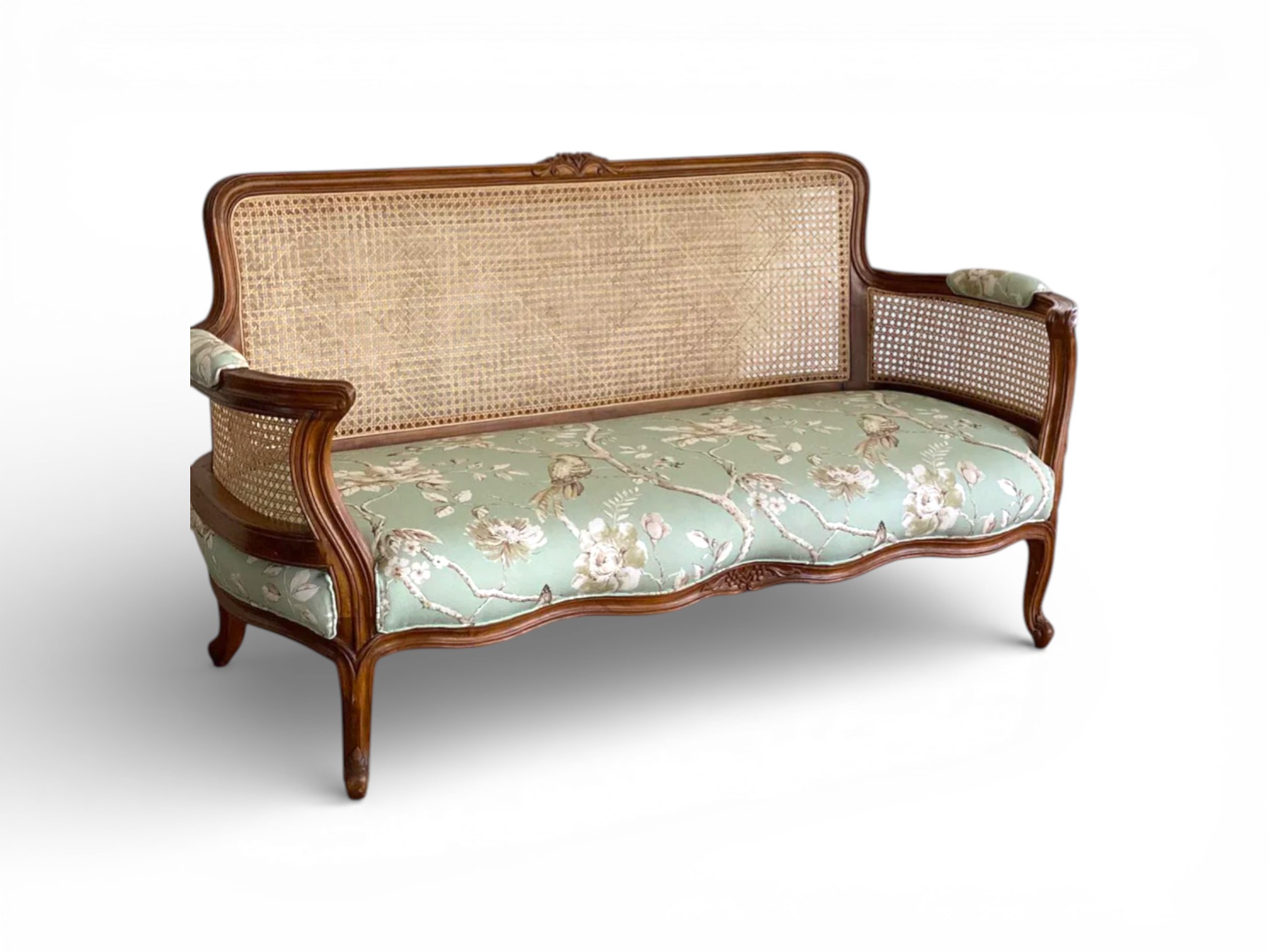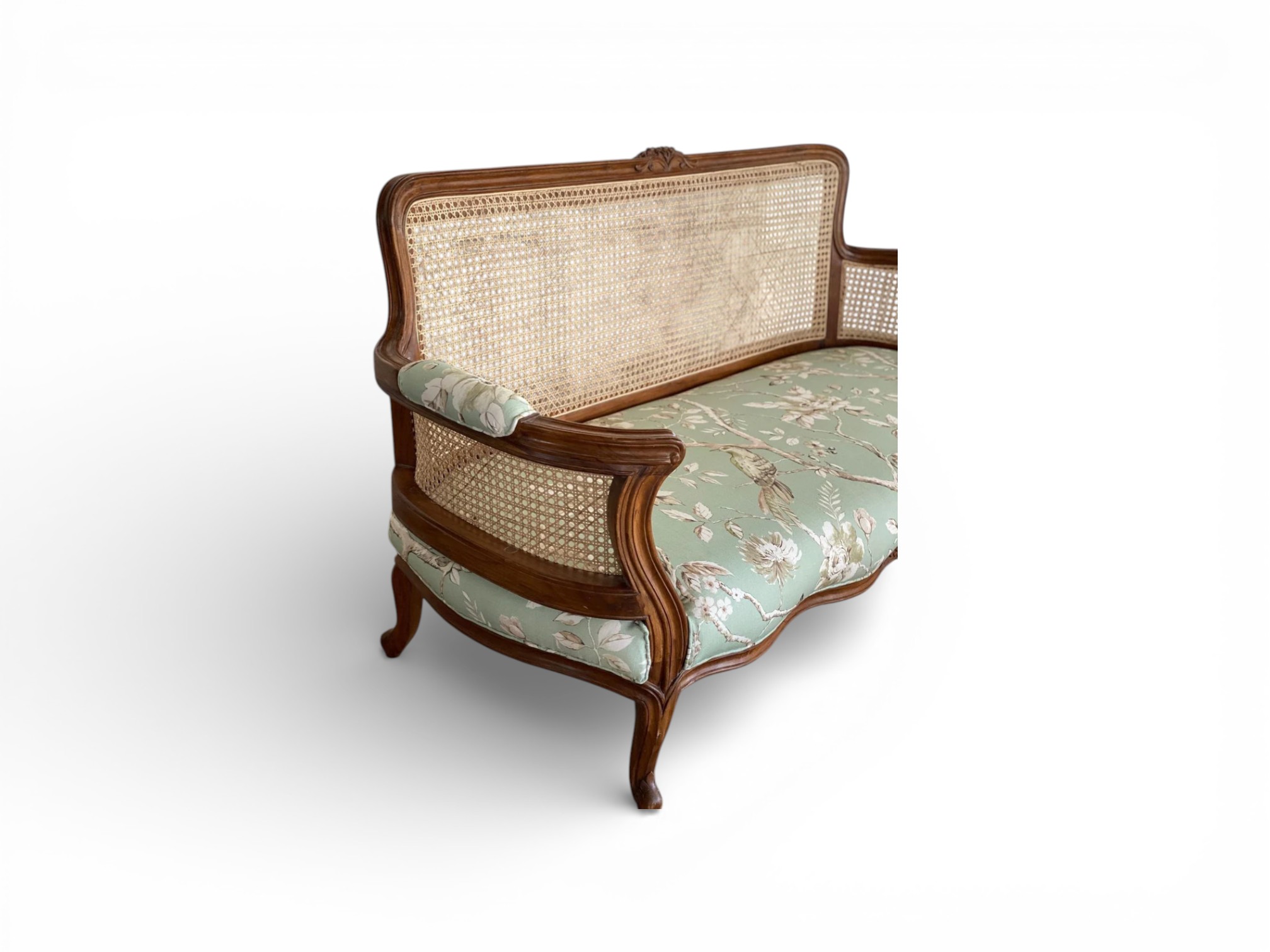 • Soft jade floral upholstery for a fresh classic look