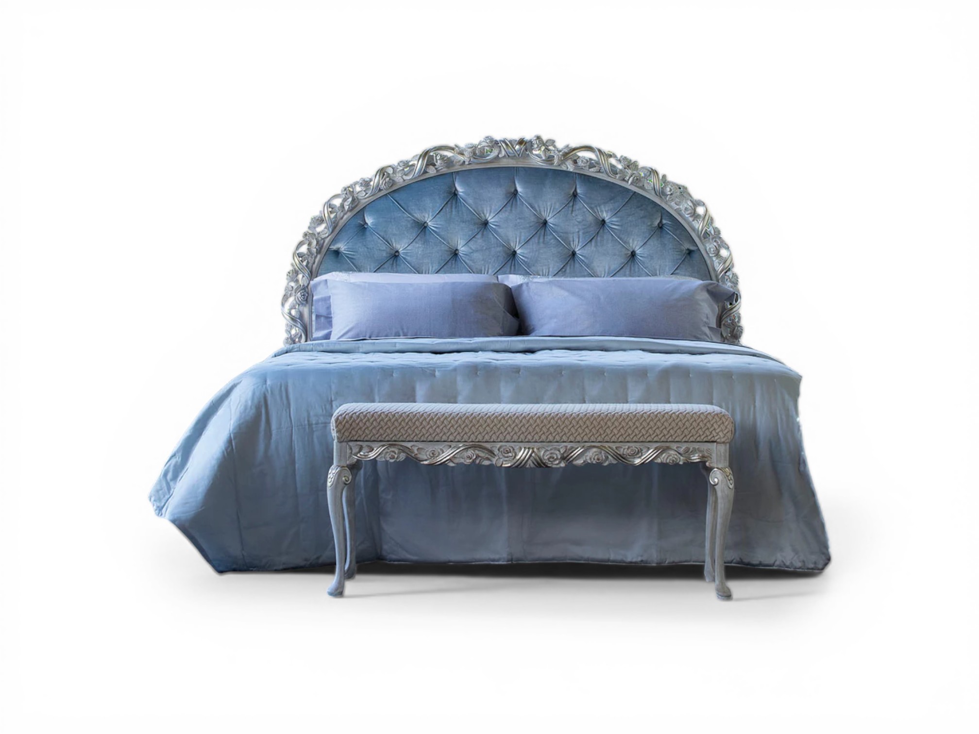 Liora Scroll Bed embodies graceful European charm with its beautifully curved headboard framed in intricate hand-carved scrollwork. The soft upholstered panel enhances visual warmth, while the sculpted detailing introduces timeless artistry. Designed to create an elegant focal point, Liora Scroll Bed transforms refined master bedrooms into serene yet luxurious retreats.