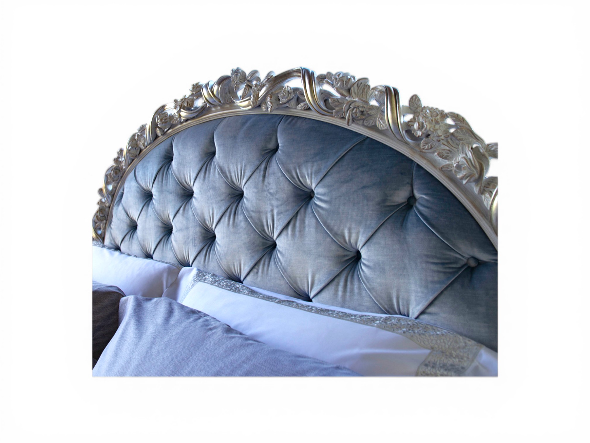 Intricately carved scrollwork headboard
