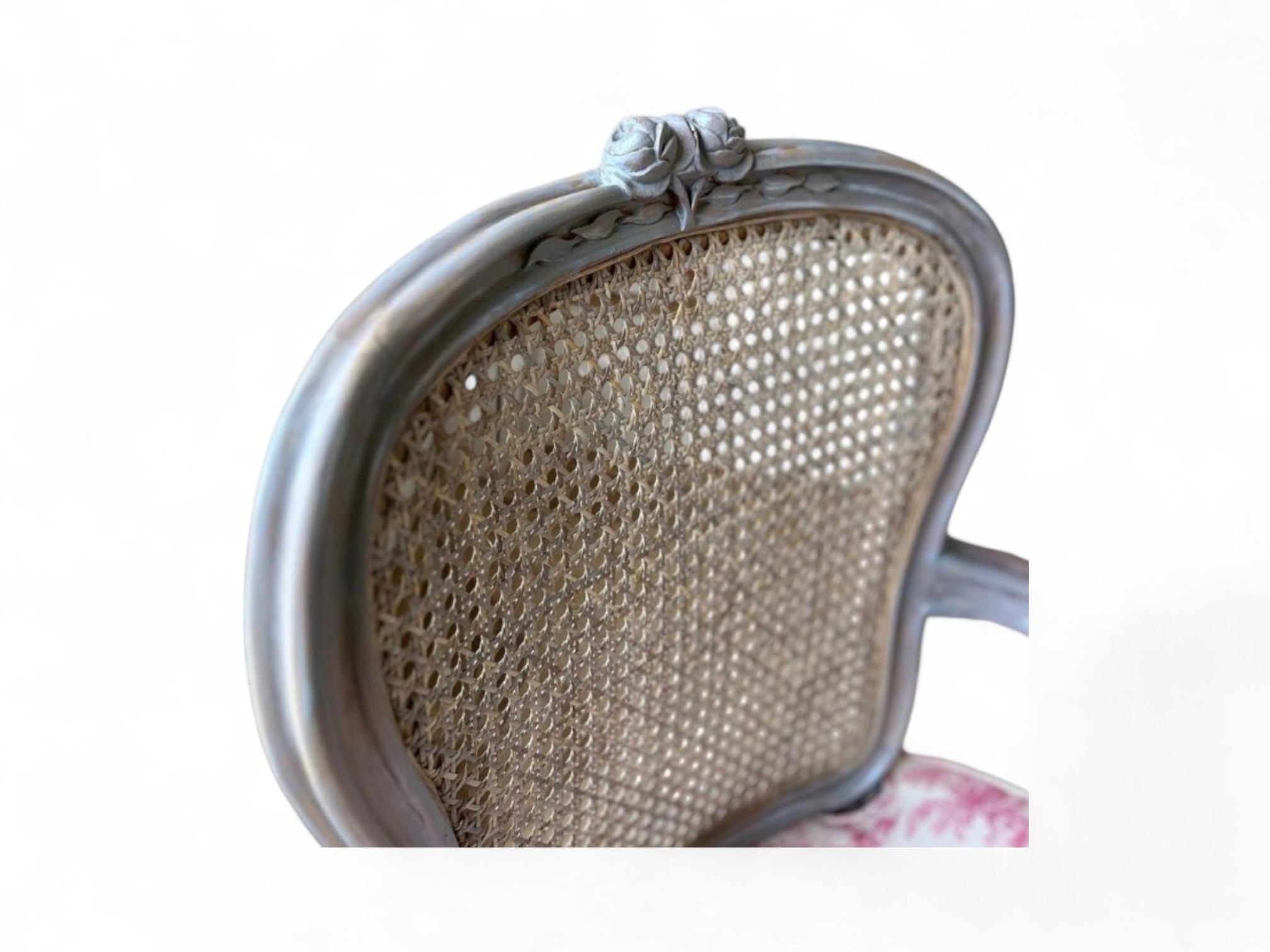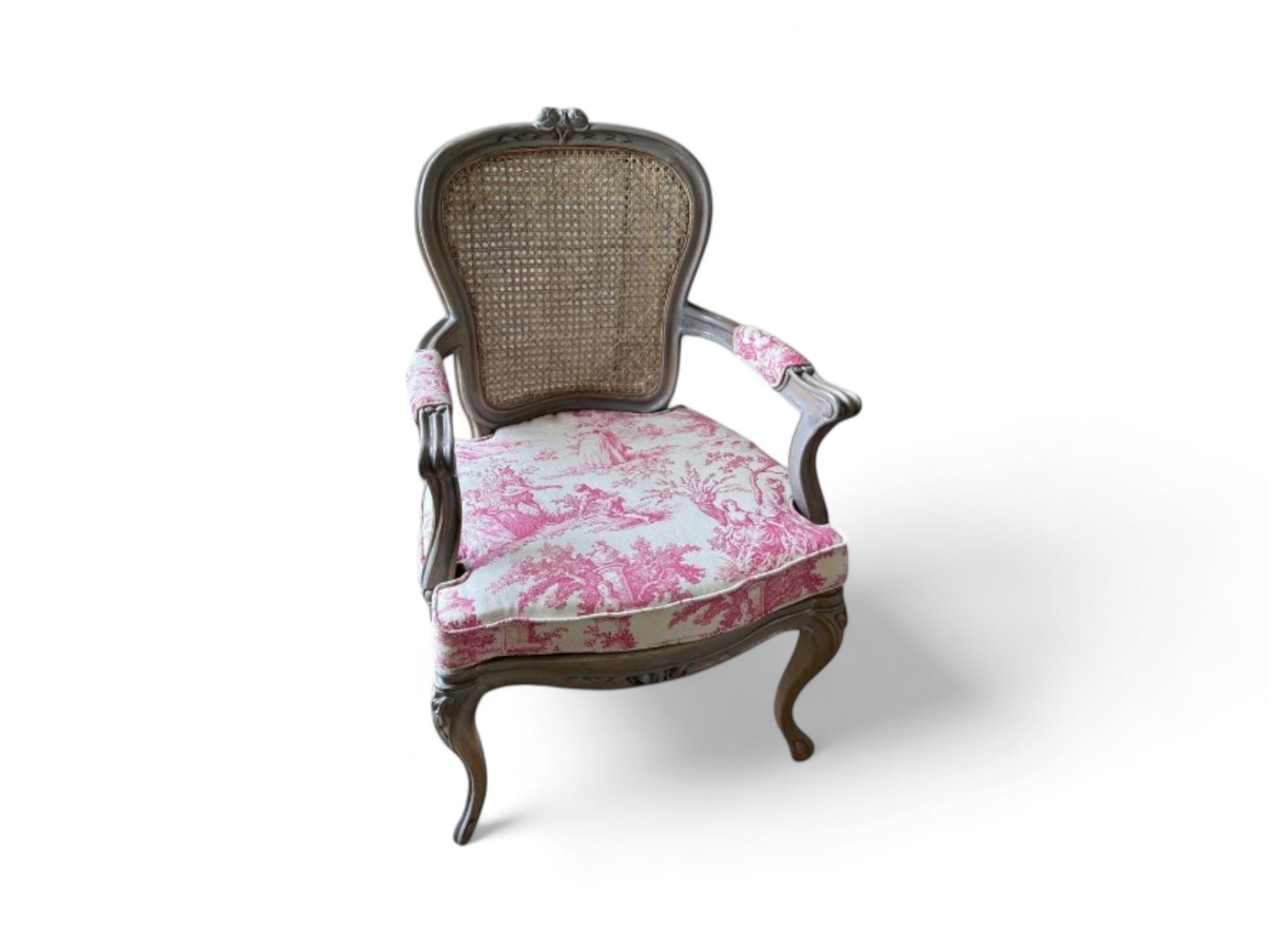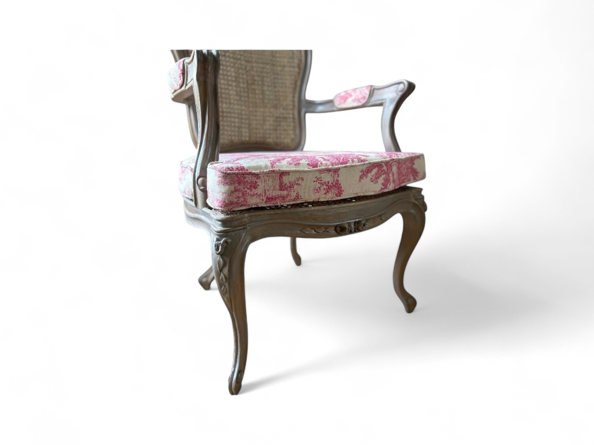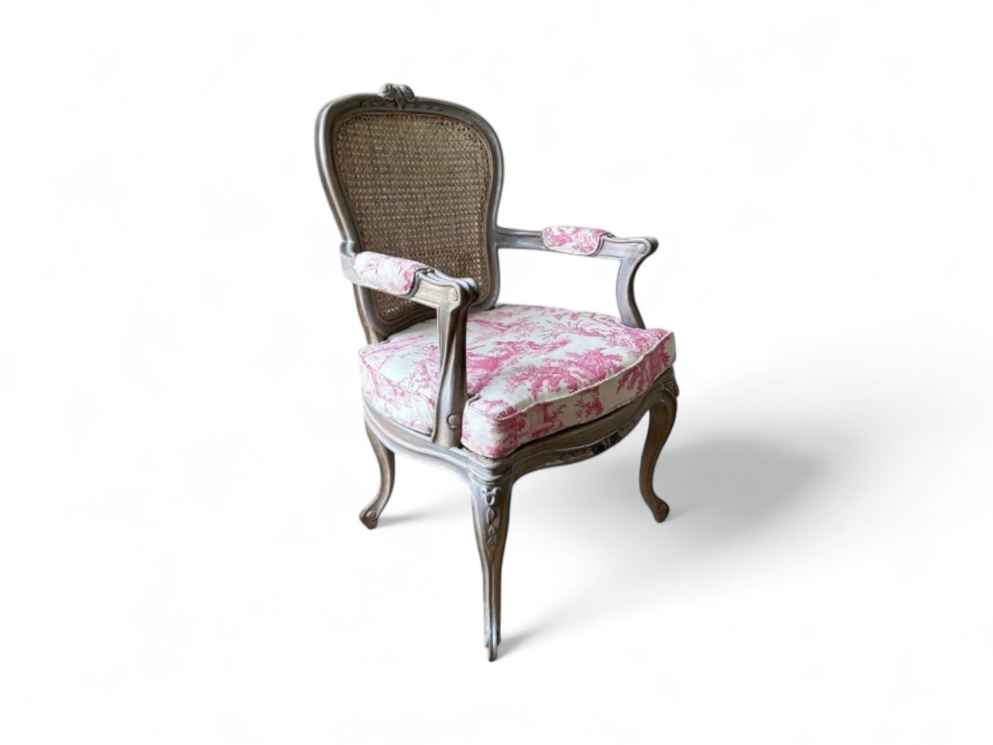 The Louis XV Chair captures the opulence of French Rococo elegance, bringing timeless charm and intricate detailing to any interior. With its graceful cabriole legs, carved wooden frame, and hand-woven cane backrest, this chair embodies antique refinement. The seat and armrests are upholstered in a classic toile de Jouy fabric, adding a romantic touch that enhances its vintage appeal. Perfect for formal sitting rooms, reading nooks, or boutique interiors, this piece radiates old-world luxury and delicate craftsmanship.