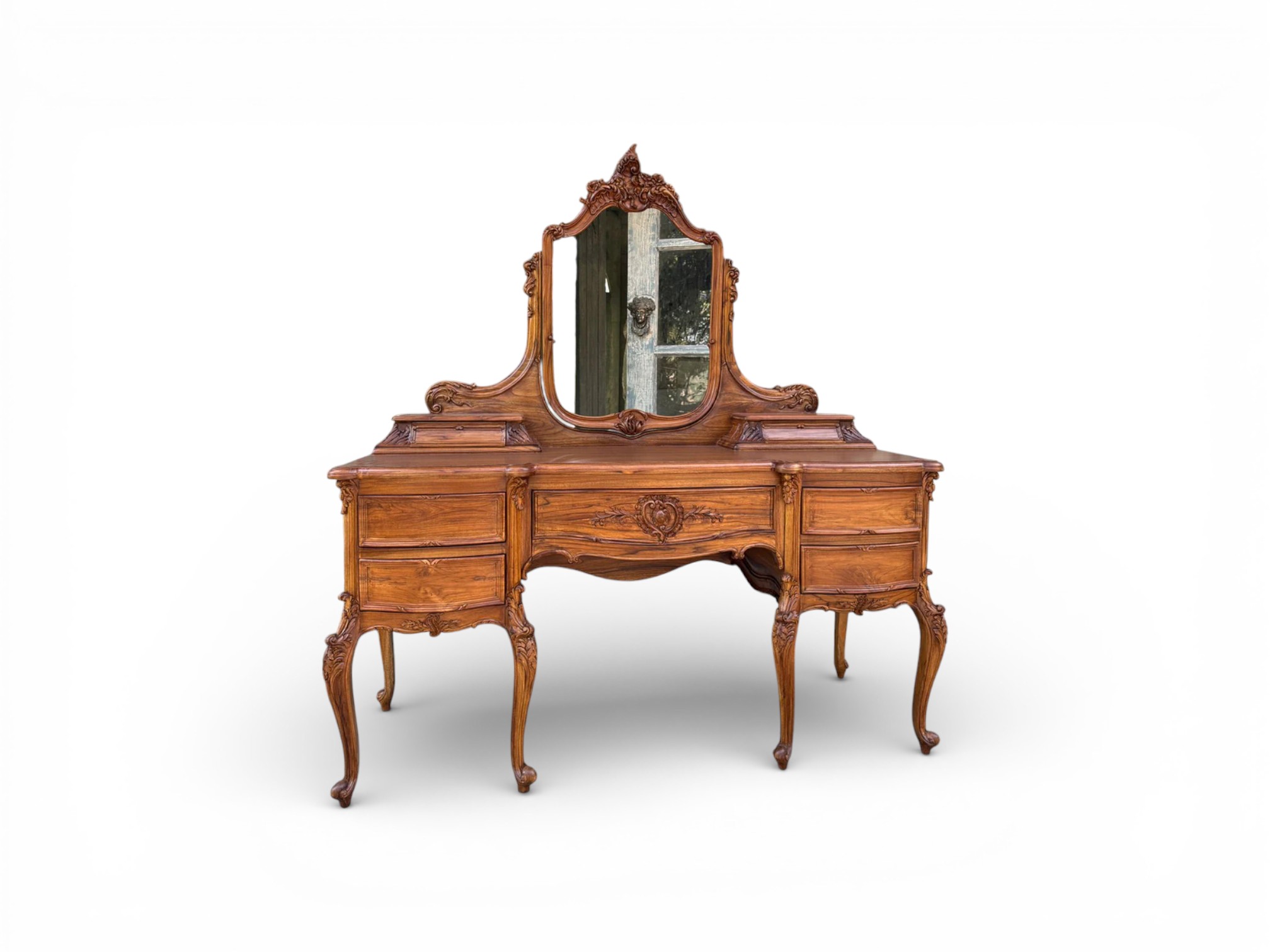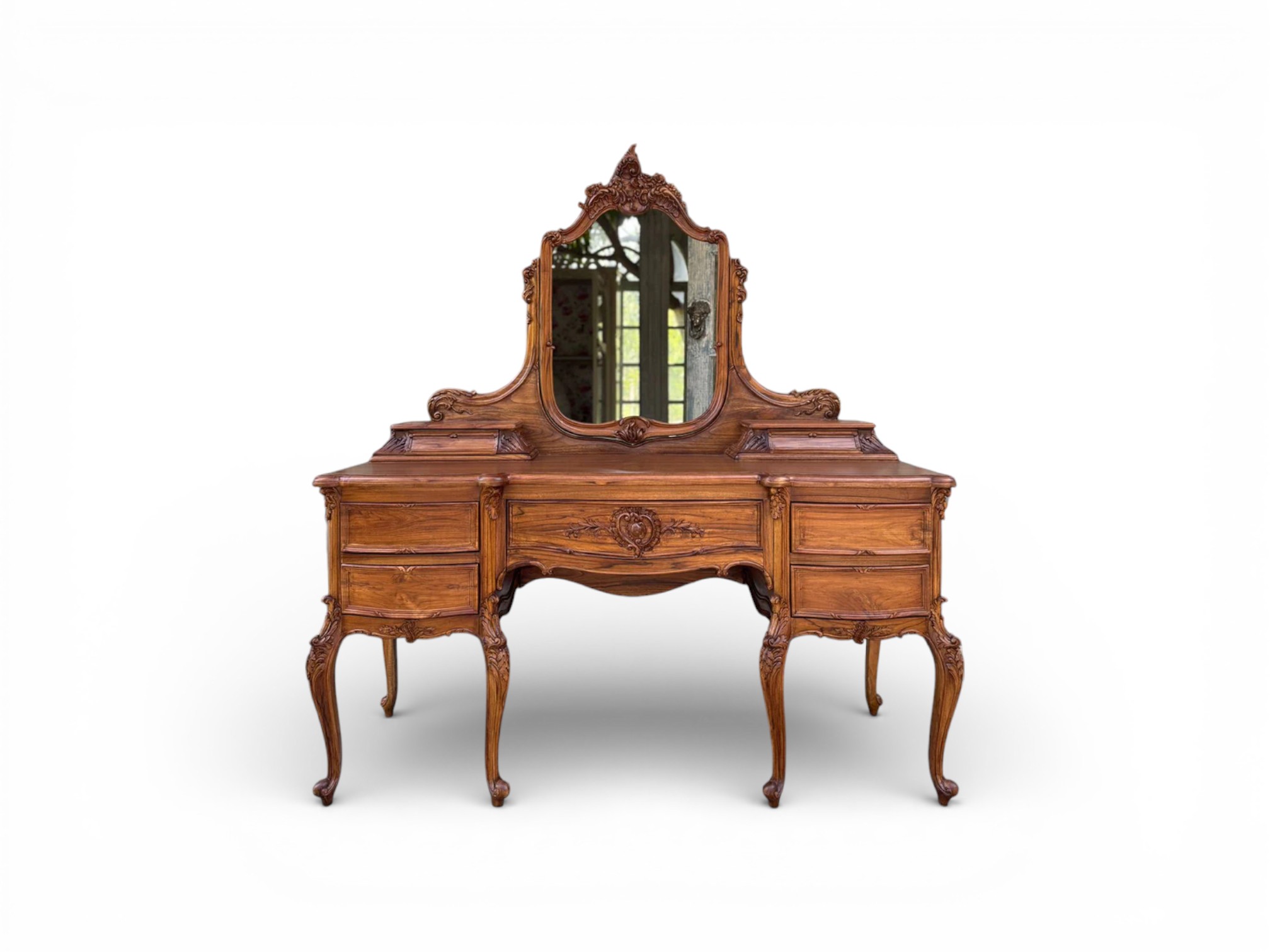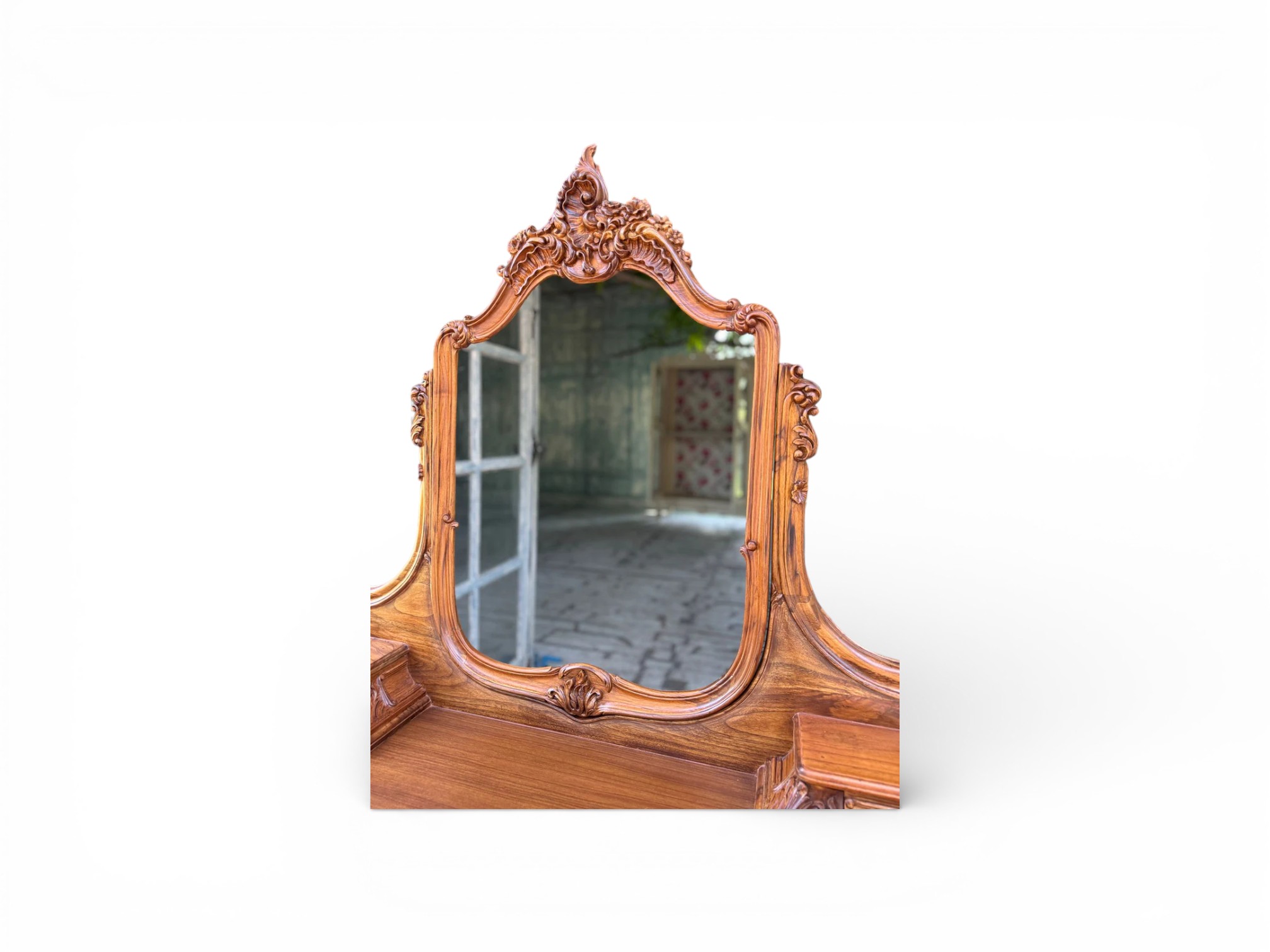 The Louis XV Dresser reflects classic French artistry through its richly carved wooden frame, sculpted mirror crest, and elegantly curved cabriole legs. Designed to bring refined character to luxurious bedrooms, the Louis XV Dresser showcases intricate detailing across the drawers and apron, while the warm wood finish enhances depth and timeless appeal. Moreover, its balanced proportions create a commanding yet graceful presence that elevates traditional interiors effortlessly.